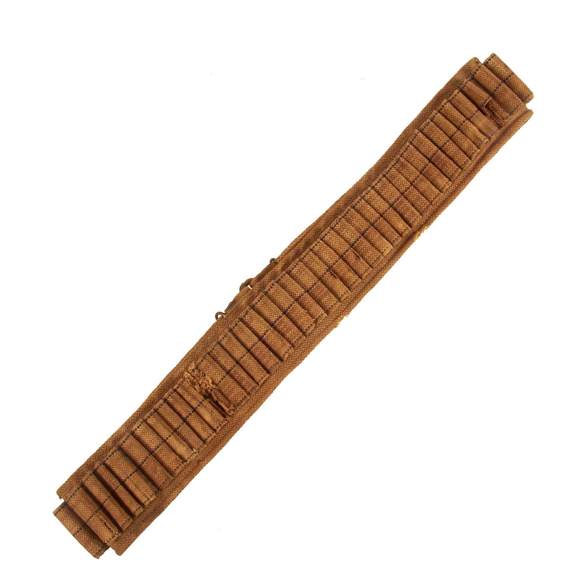 The belt does not have a "buckle", but instead a large split loop, which is used to fasten the two ends of the belt together. The adjoiner clips are both marked PAT. MILLS & ORNDORFF and have a series of patent dates ranging from 1867-1894. All brass has a lovely aged patina. All woven cartridge loops are mostly intact and in very good shape.