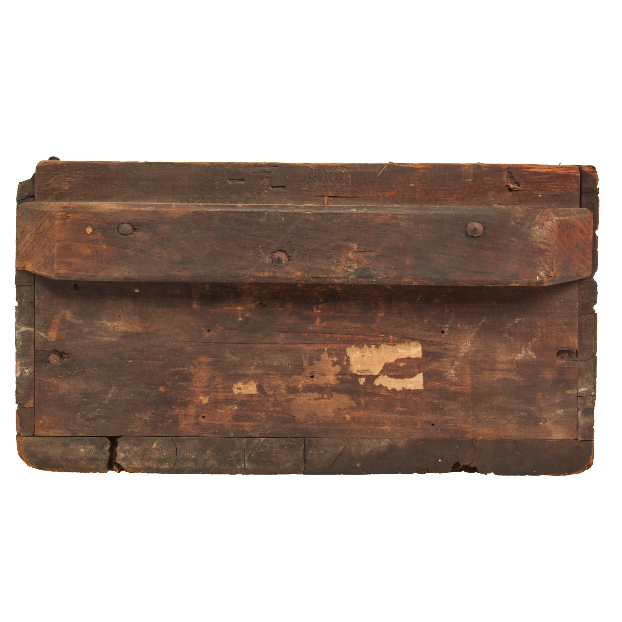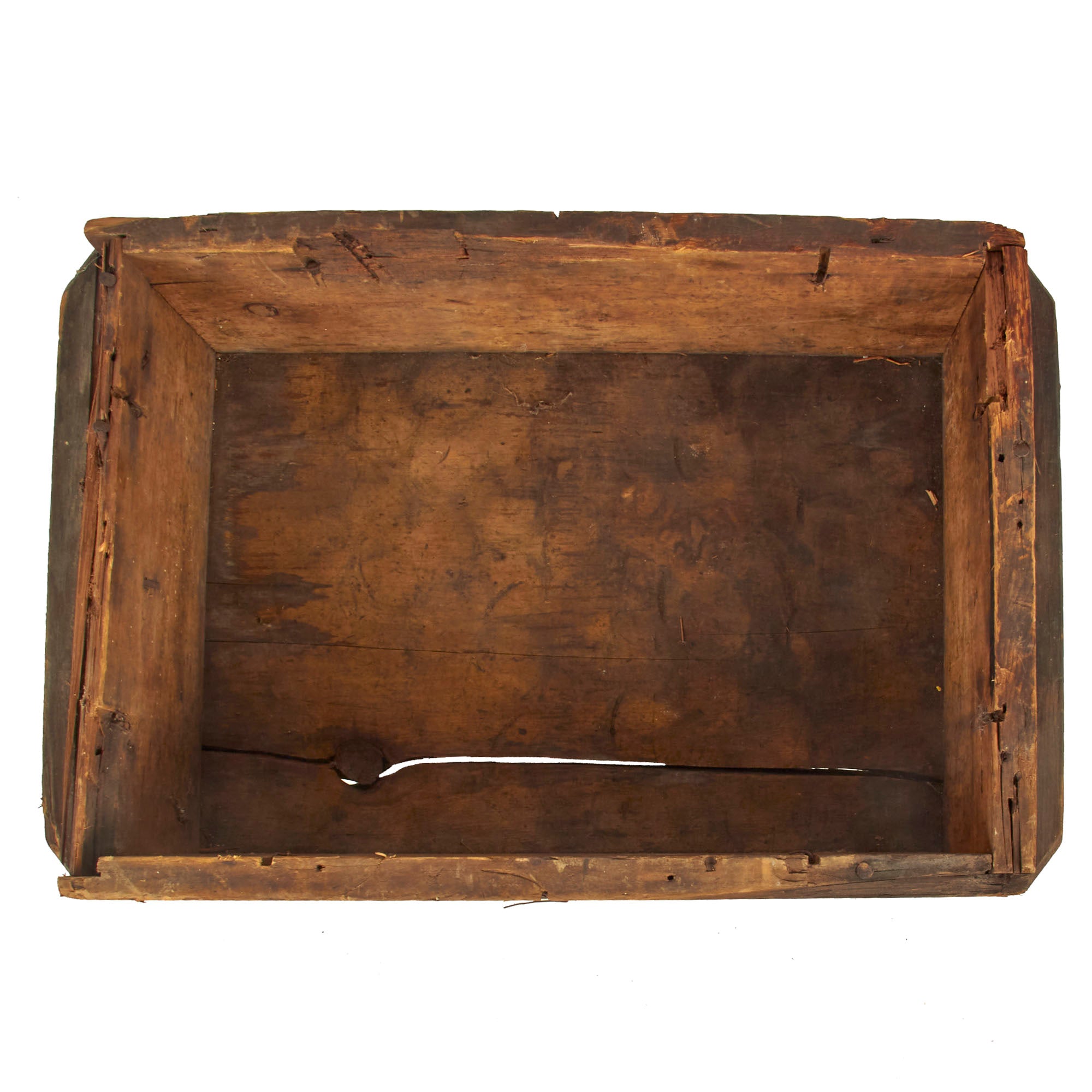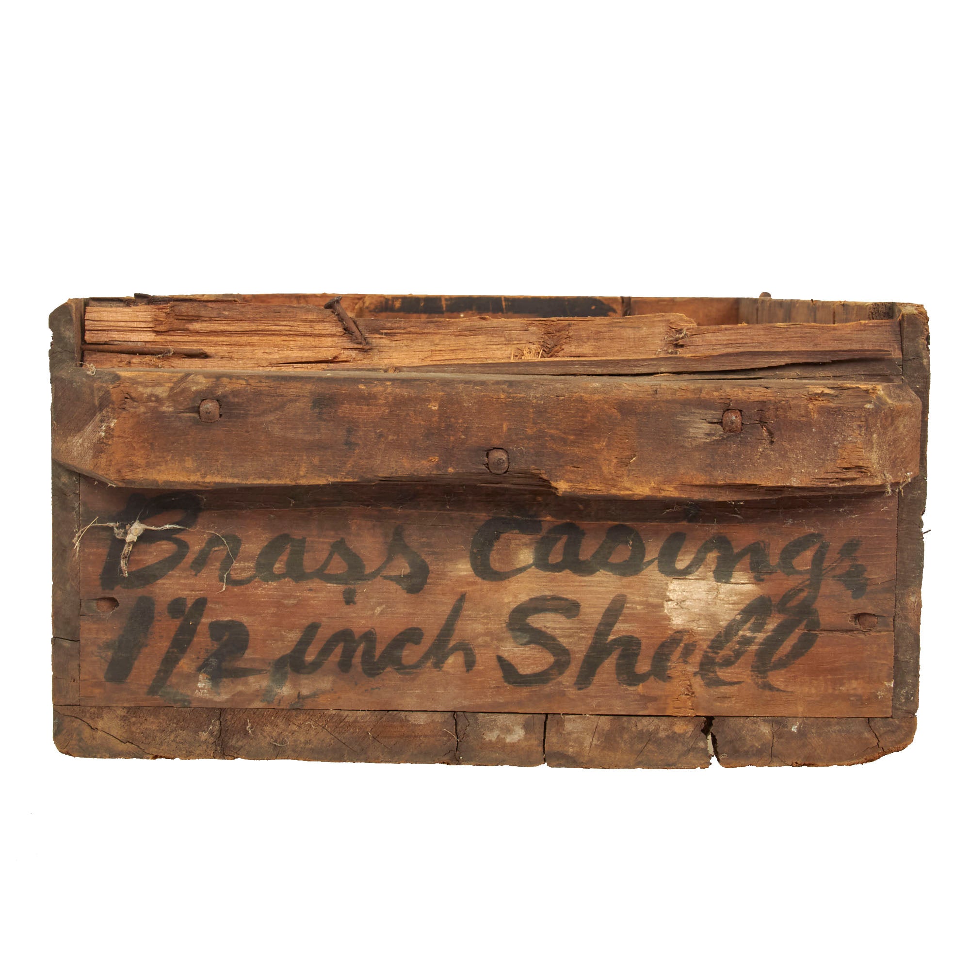 The crate measures approximately 19 1/2"W x 13"D x 7"H, and definitely looks to have seen long use after service, probably in a barn or a workshop where it was used to store things. The end of the crates is marked Brass casings 1/2 inch Shell, which does not really have anything to do with it's original purpose. The long sides however still show the original faint inspectors marks, as well as the listing of the contents: