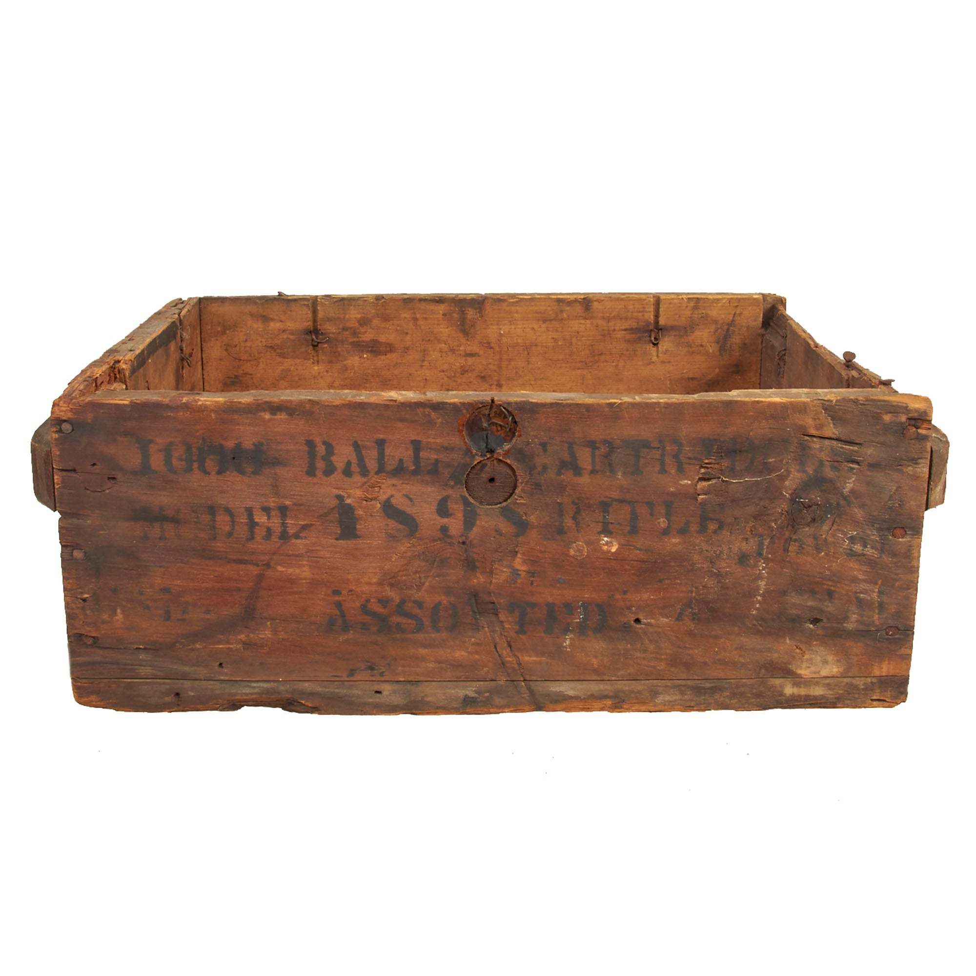 Original Item: Only One Available. This is a very nice Spanish-American War Era Issue ammunition crate for .30-40 Krag cartridges, also referred to as 30 U.S. and .30 Army. The cartridge was developed in the early 1890s to provide the U.S. armed forces with a smokeless powder cartridge suited for use with modern small-bore repeating rifles to be selected in the 1892 small arm trials. The rifle ultimately selected for use by the Army was the Krag–Jørgensen, formally adopted as the Springfield Model 1892–99 Krag–Jørgensen Rifles & Carbines. The cartridge was also used in M1893 and later Gatling guns.