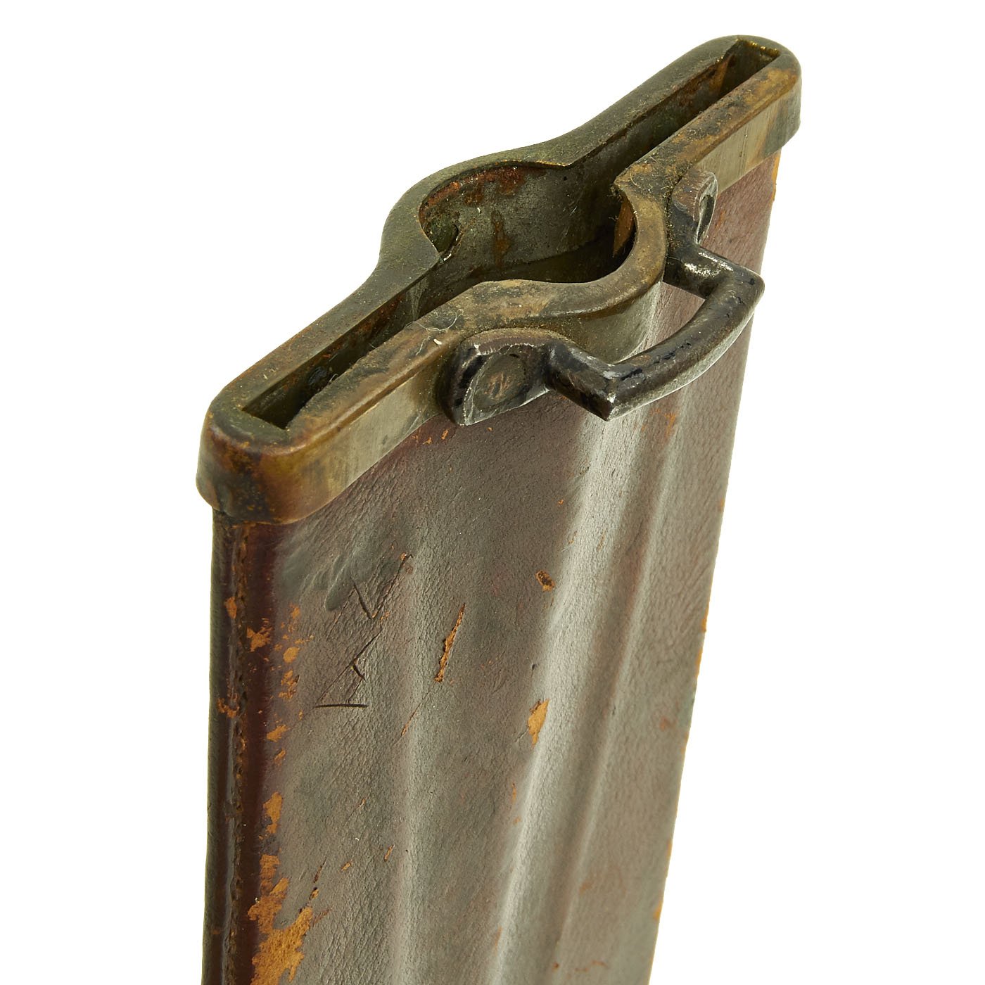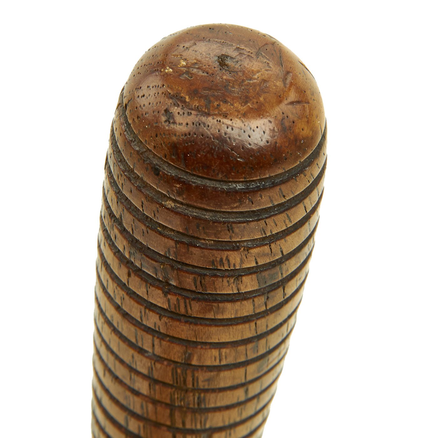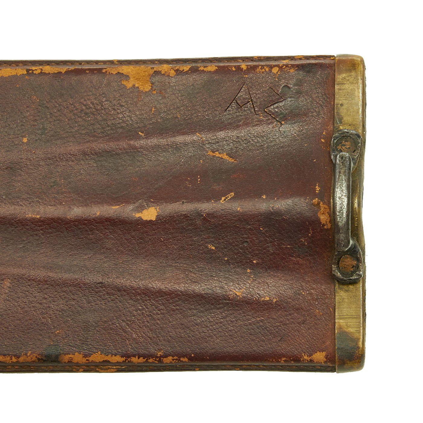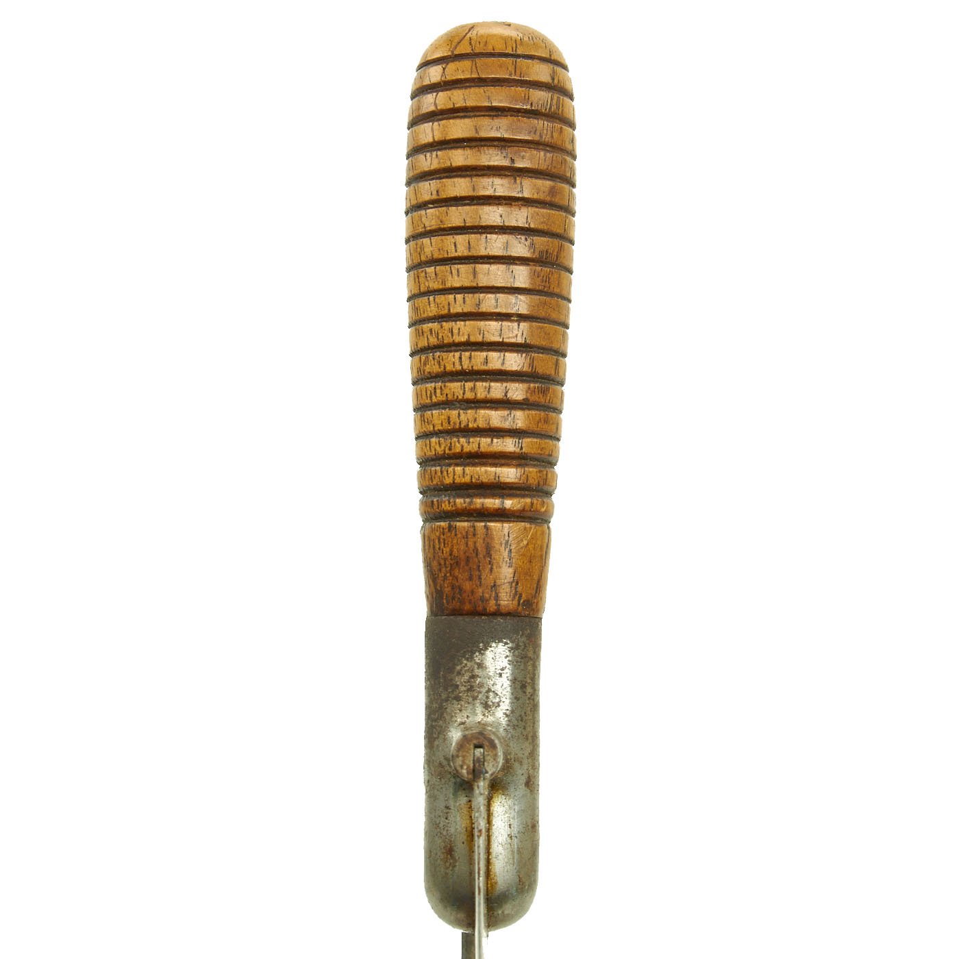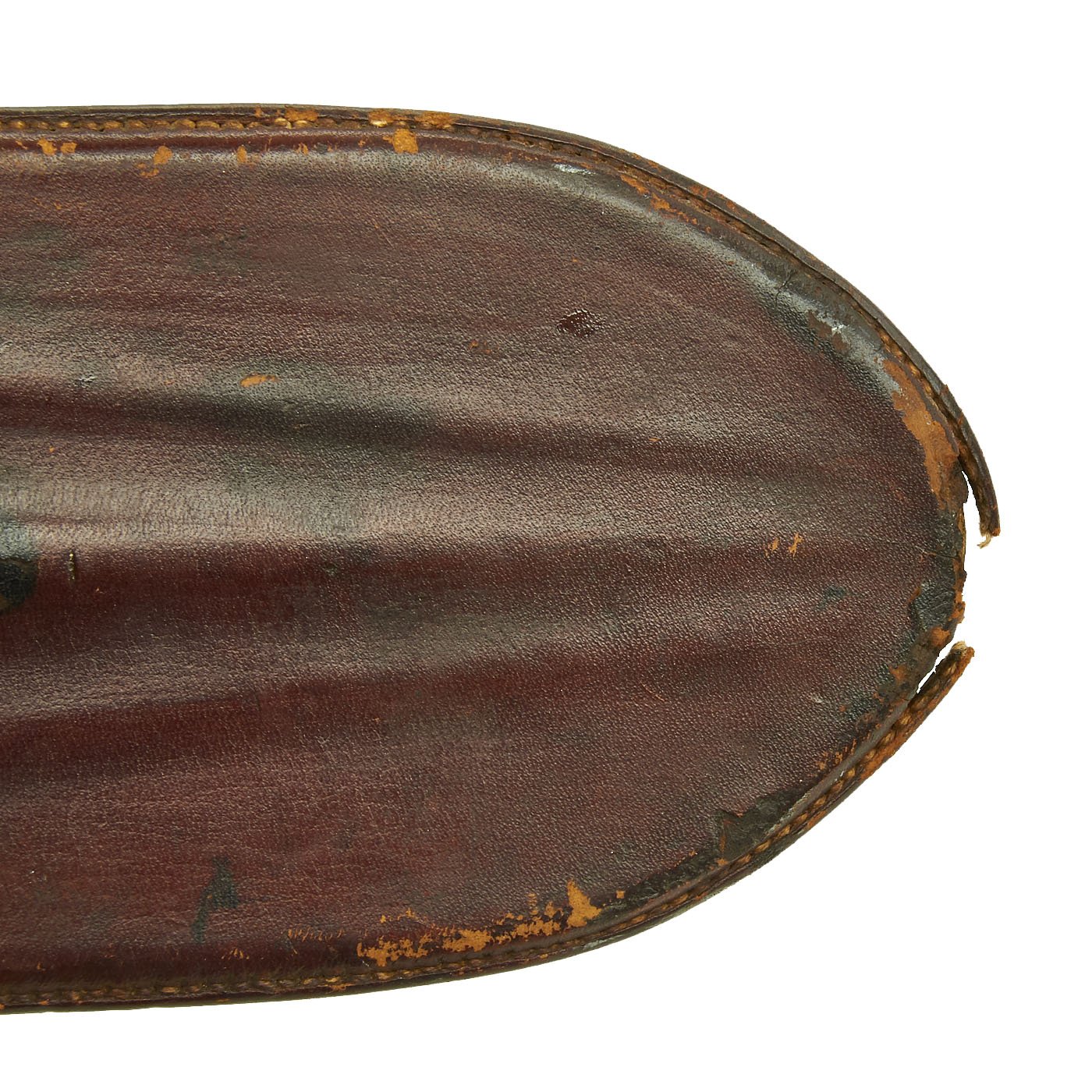 This example is in very good condition, showing some oxidation and staining on the blade, with minor dings on the wood handle. There are scuffs on the leather, which is a dark aged brown, with a great patina of age. There are a few areas of cracking, and the underlying metal can be seen. There is also a split area at the bottom of the scabbard with missing stitching and leather. These were typically used, abused, and in some cases thrown away by the troops they were issued to, so examples in any condition are rare.
