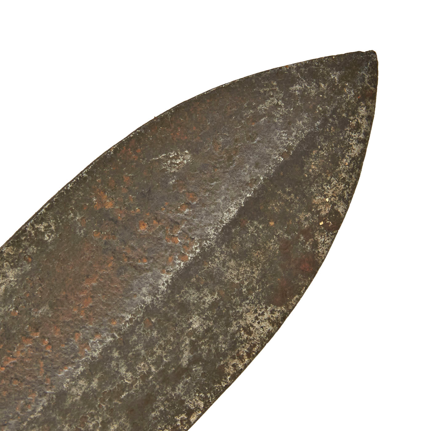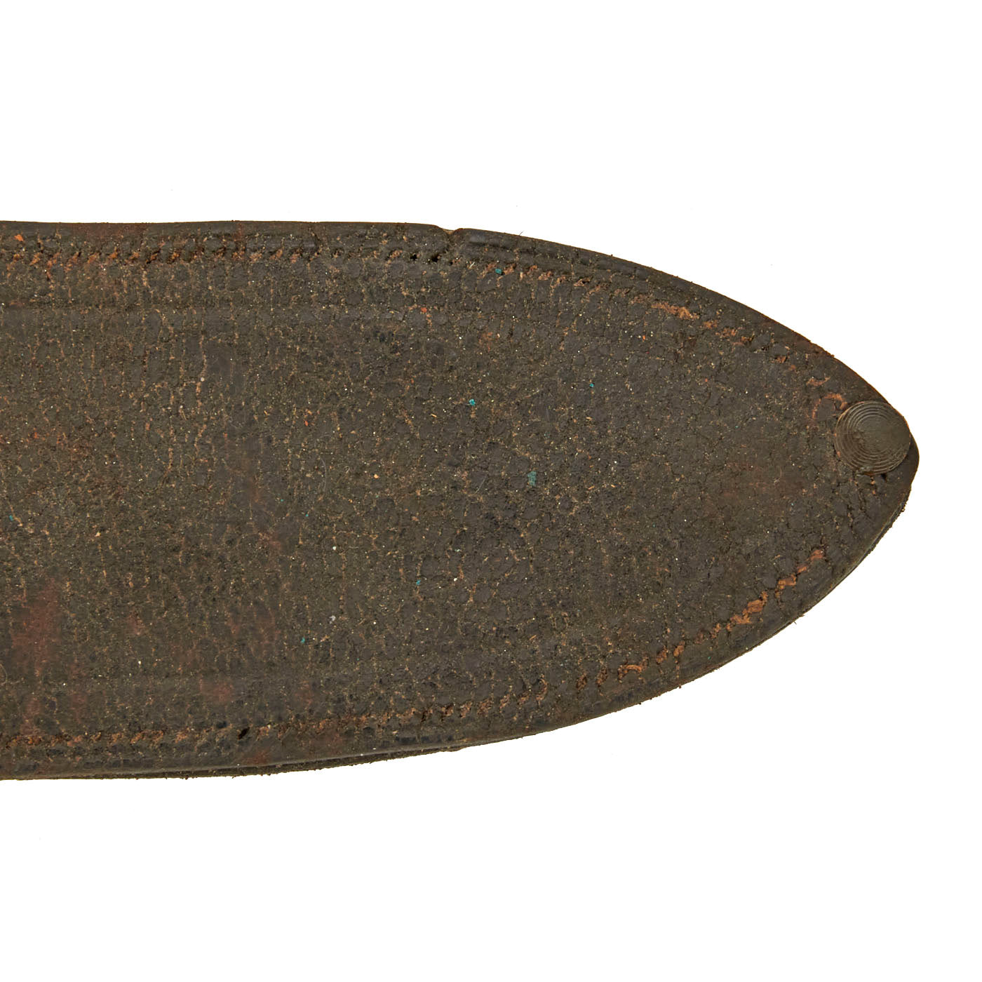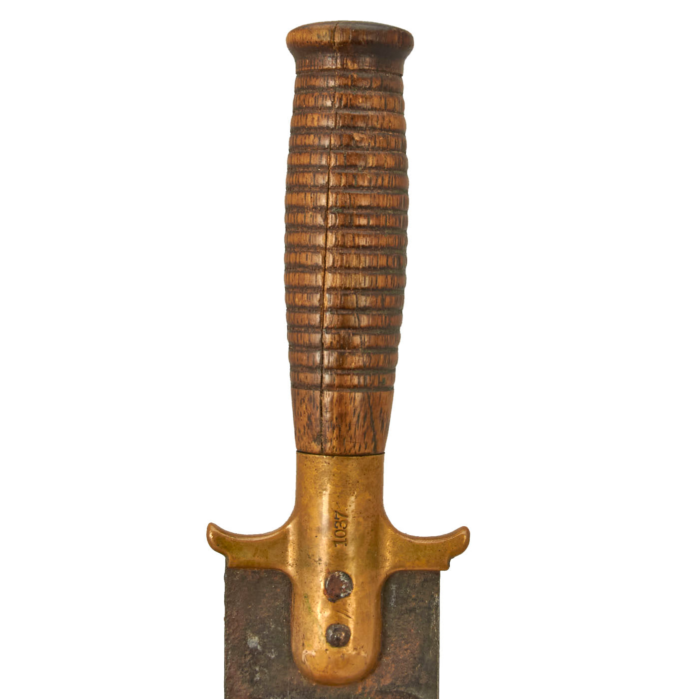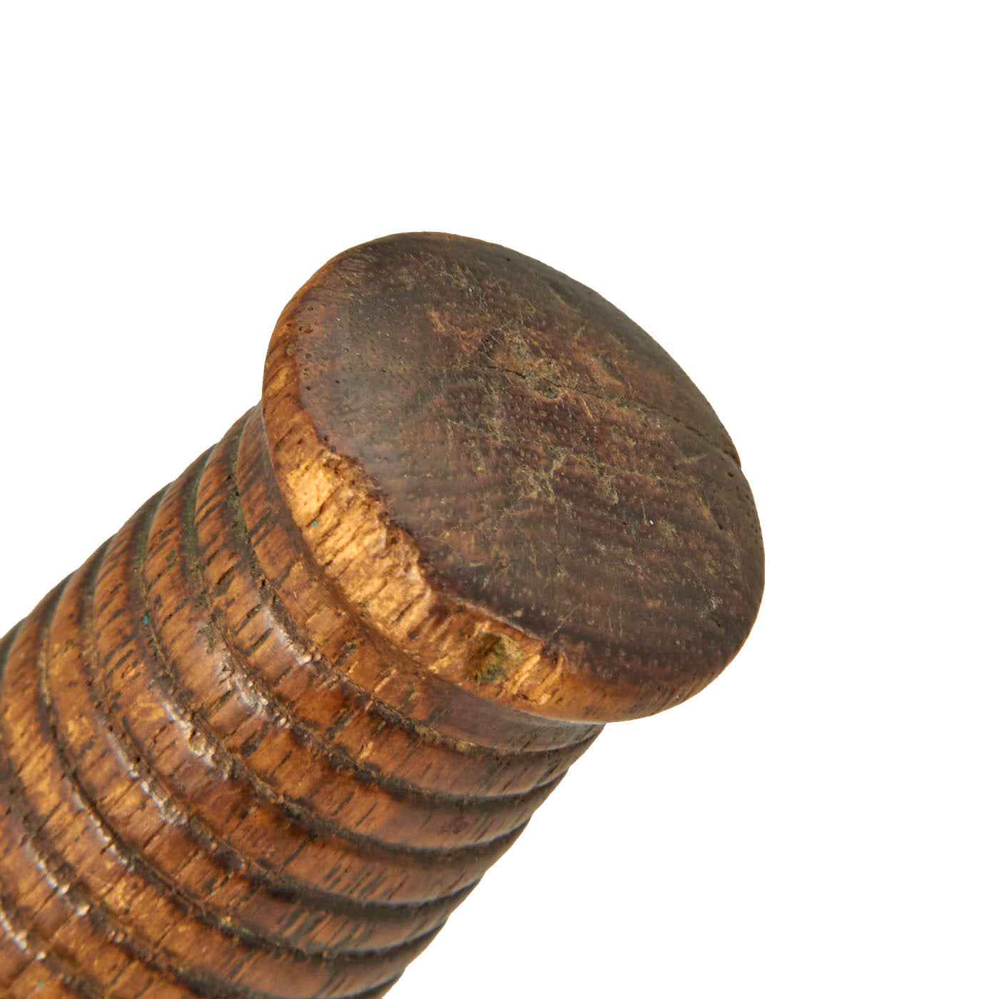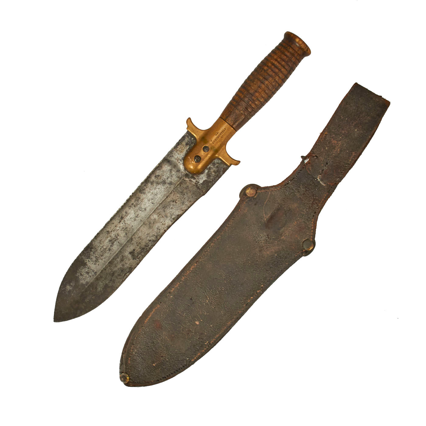 Reproductions of this sought after knife are common, as are finding legitimate ones with replacement handles. Collectors should use caution. This knife is 100% genuine with an original lovely condition wood handle. All of the factory ribbing is intact with minor chipping around the base. The brass fitting for the handle has a lovely aged patina. These were typically used, abused, and in some cases thrown away by the troops they were issued to, so examples in any condition are rare.
