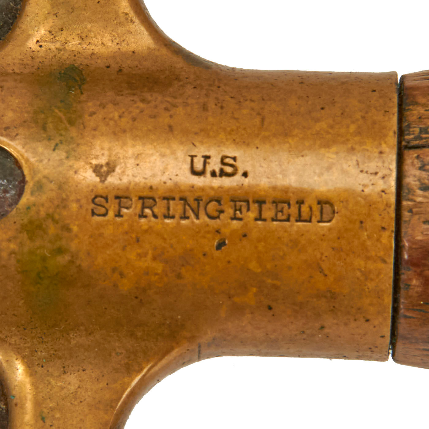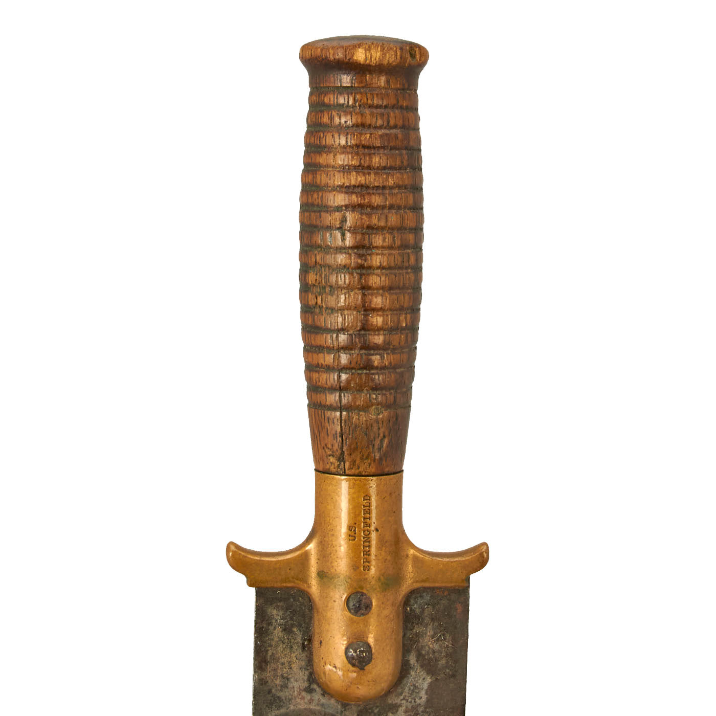 Original Item: Only One Available. This is only the second example of one of these hunting knives that we have had! Developed during the same period of American "multi-use" military experimentation that produced the Springfield Trapdoor ramrod and trowel bayonets, the Springfield Model 1880 "Hunting Knife" was quite similar in size and appearance to the entrenching tool developed in the same year. The handle and bolster design is very similar, though it is fitted with brass, and not steel.