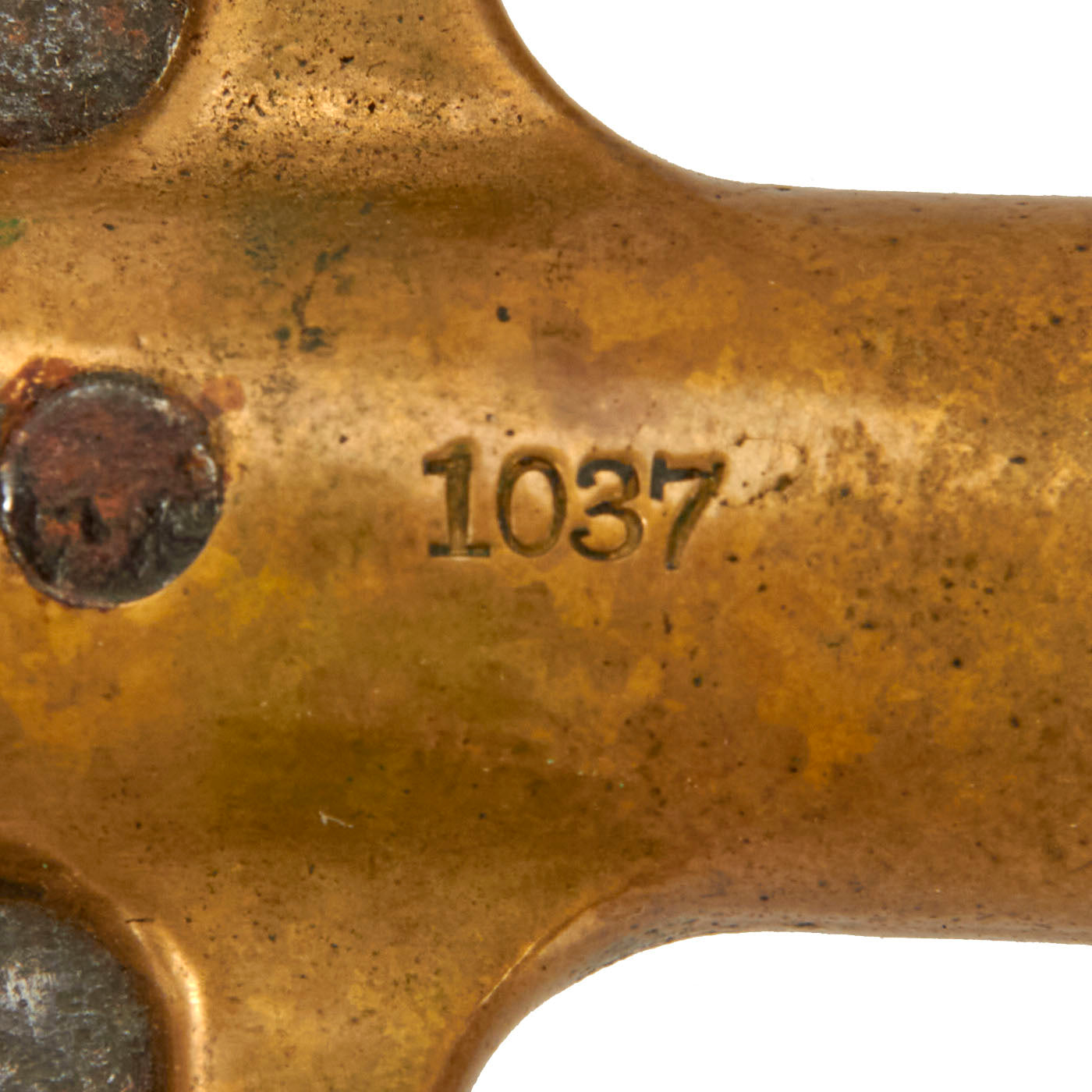 All M-1880 Hunting Knives were serial numbered. This one is numbered 1037 and is also marked U.S. / SPRINGFIELD on the top brass portion. The knife was used heavily in western outposts, accounting for the wide distribution and usually sharpened or pitted condition found by collectors. This one is pitted throughout the blade but does retain a sharp edge! The purposes of the knife included skinning game, digging shallow trenches, and clearing brush.