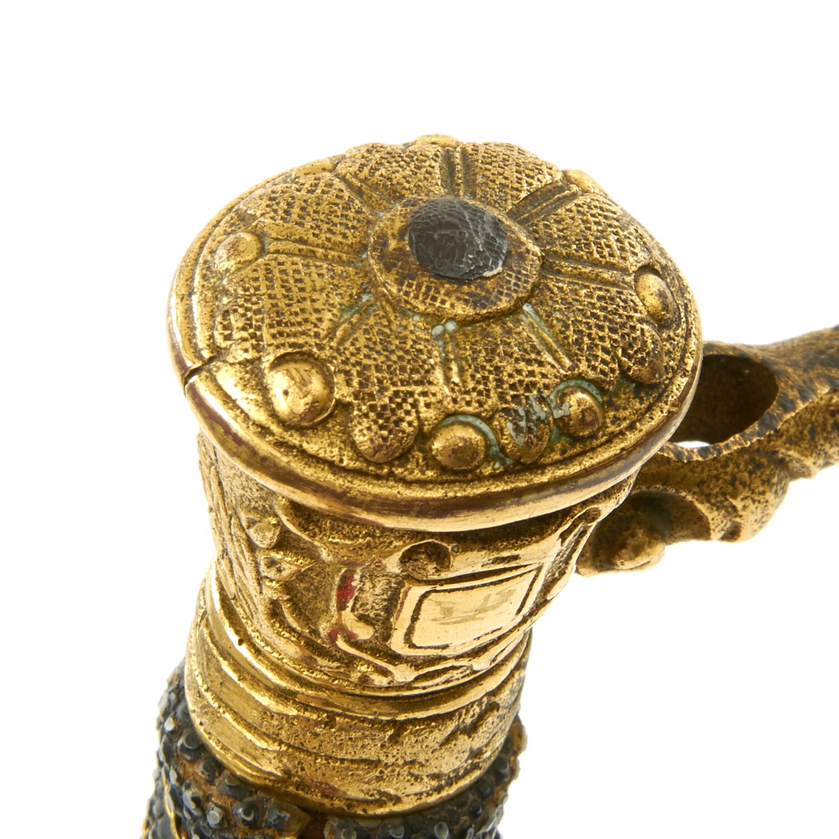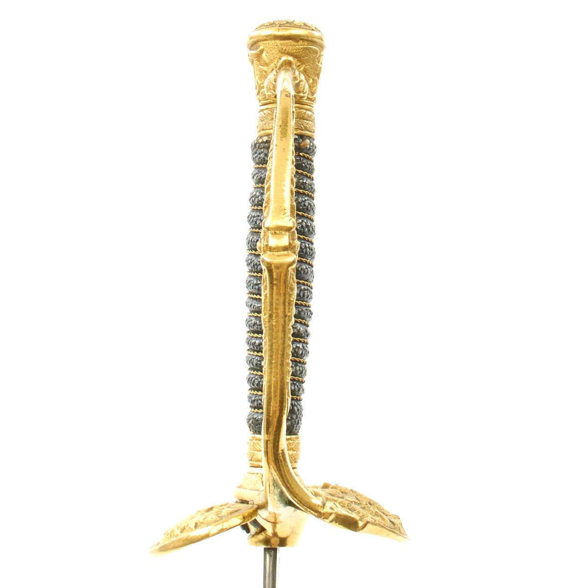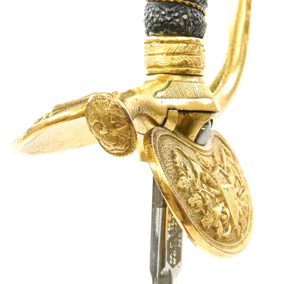 The sword measures 37" overall, and the hilt and "shell" Guard are of gilded bronze/brass, all of which is intricately engraved. There is also a foldaway guard, which makes the sword easier to wear at the side. A most of the original gilding is present, making the sword very attractive. The ribbed lacquered ray skin grip is in great shape, with the original twisted brass wire wrapping fully intact.