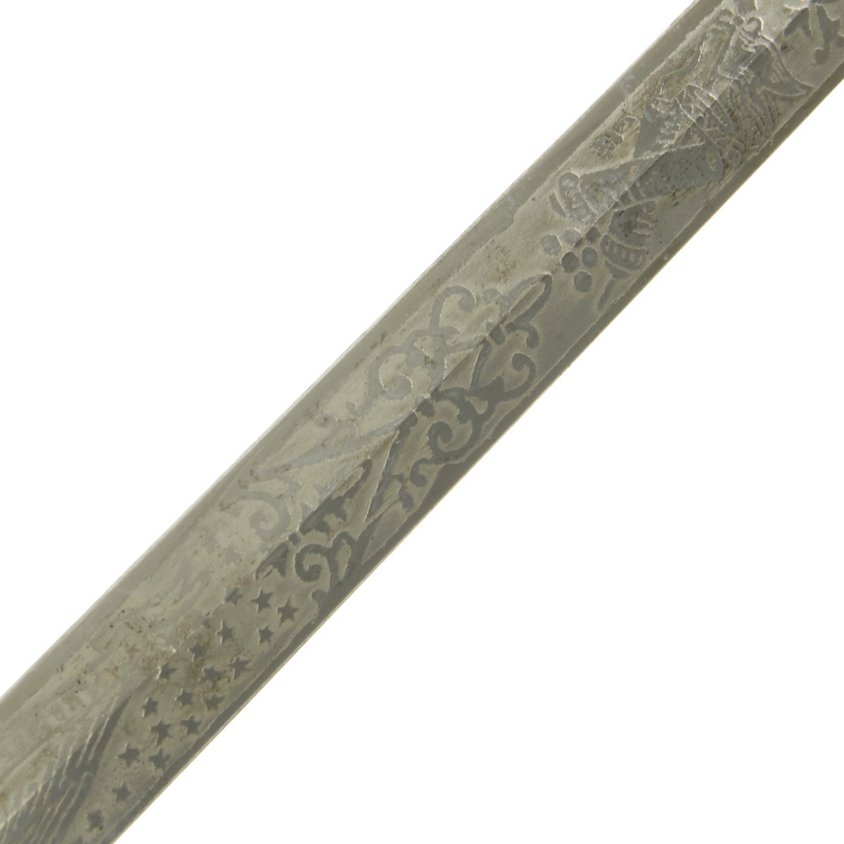 The 30 1/4 " blade is extensively etched with U.S. symbols, including the E. PLURIBUS UNUM motto under a U.S. Eagle, several U.S. Shields, as well as crossed cannons on both sides, and a cannon with a flag. The blade is in very good condition, with clear etching, and mostly only runner wear on the nickel plate. There is a bit of plating loss in areas, but nothing major.