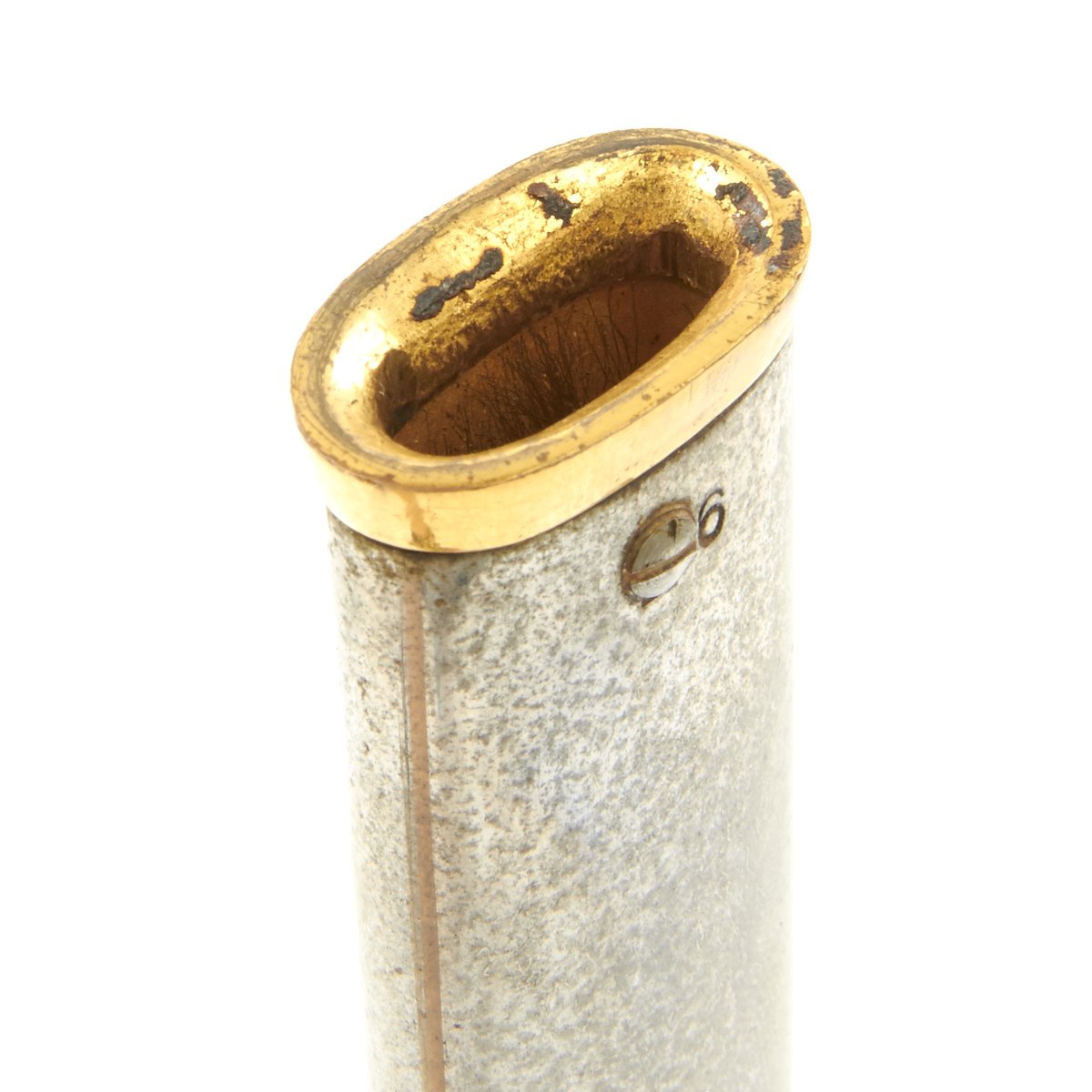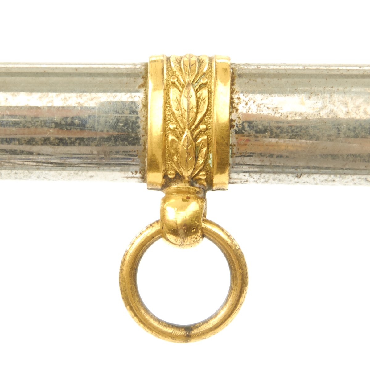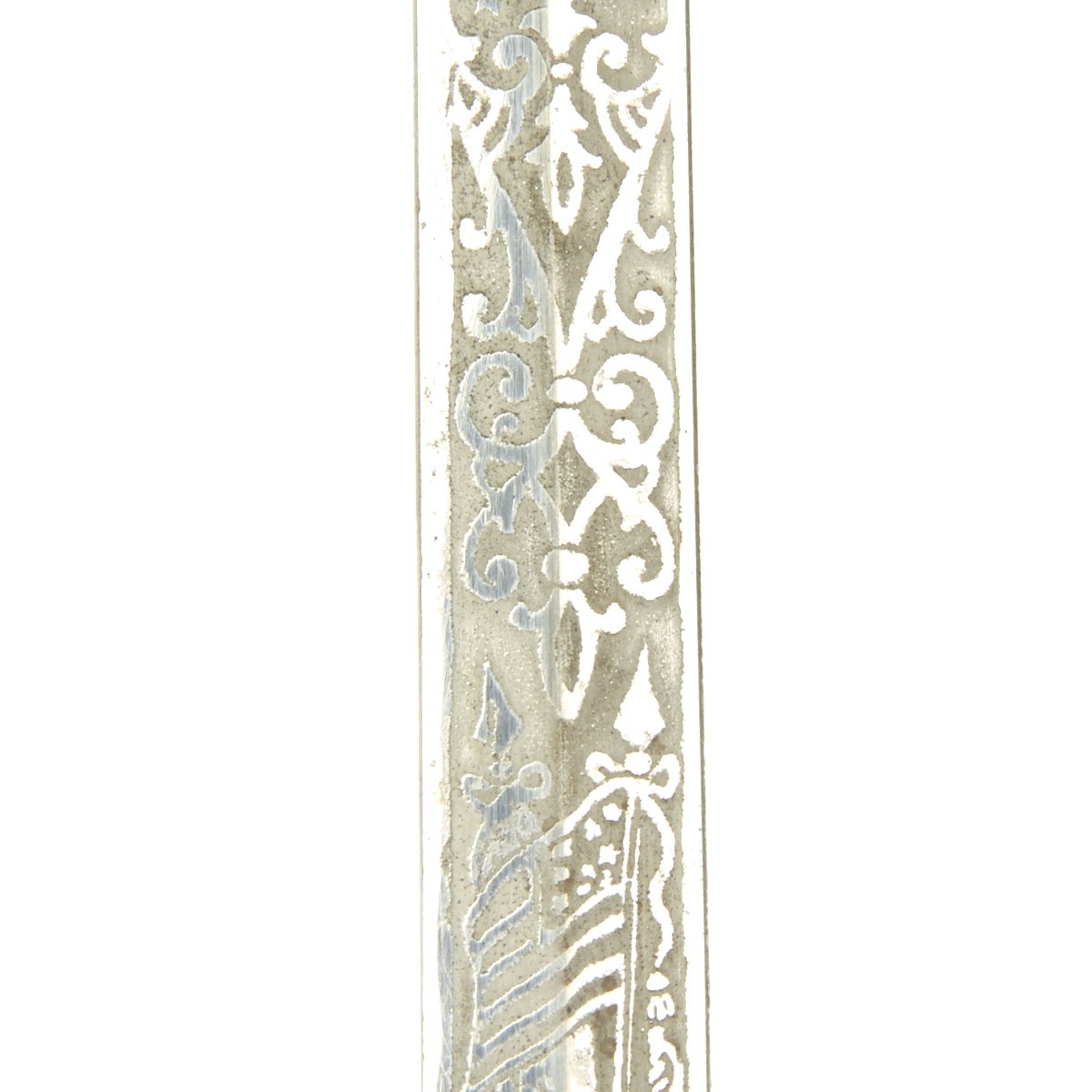 The sword comes in its original decorated brass mounted nickel-plated scabbard. Scabbard is straight, and the plating is in good shape, with no dents that we can detect. Plating is in good shape, with the usual speckled patina of age.