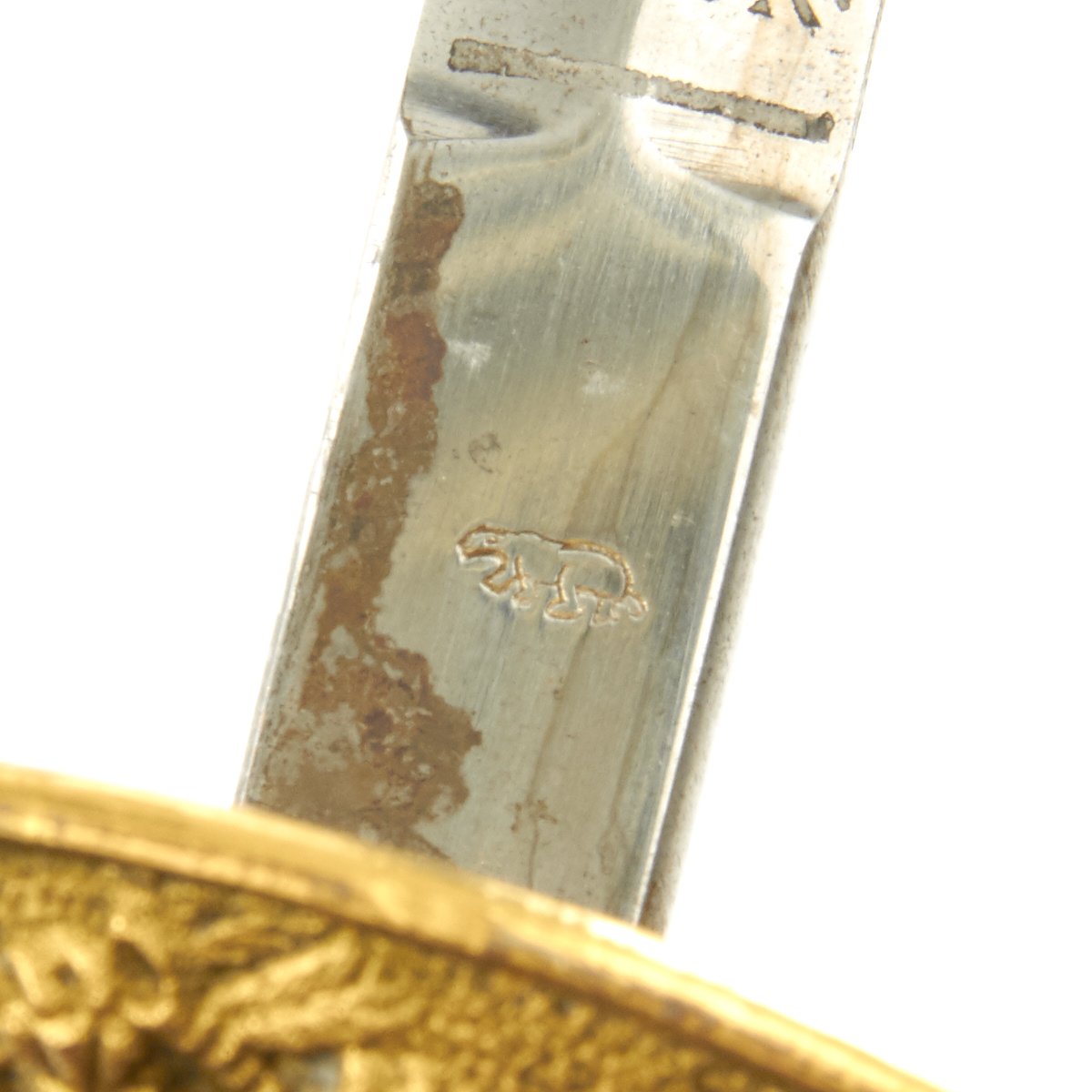 On the reverse ricasso there is what looks to be some type of animal, possibly a bear or dog, stamped into the steel. Many of these upmarket swords were made with sword blades imported from Europe, particularly from France and Germany, so this may be the mark of the original maker.