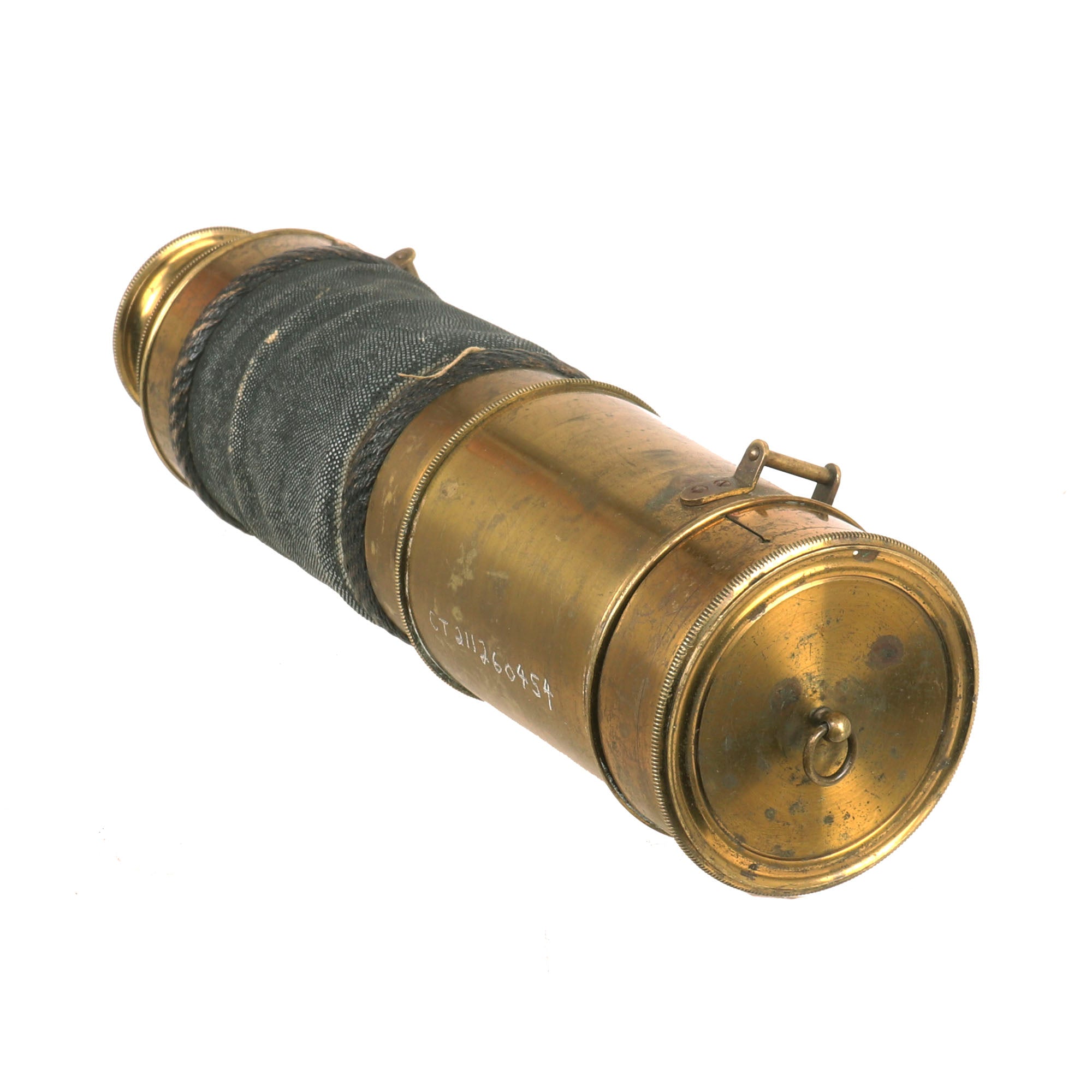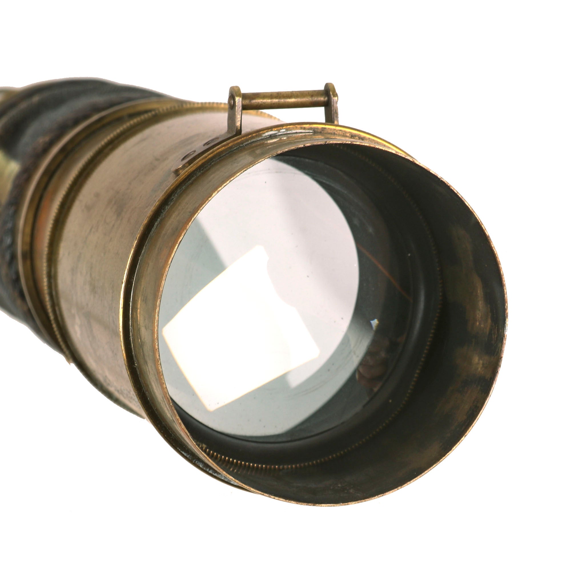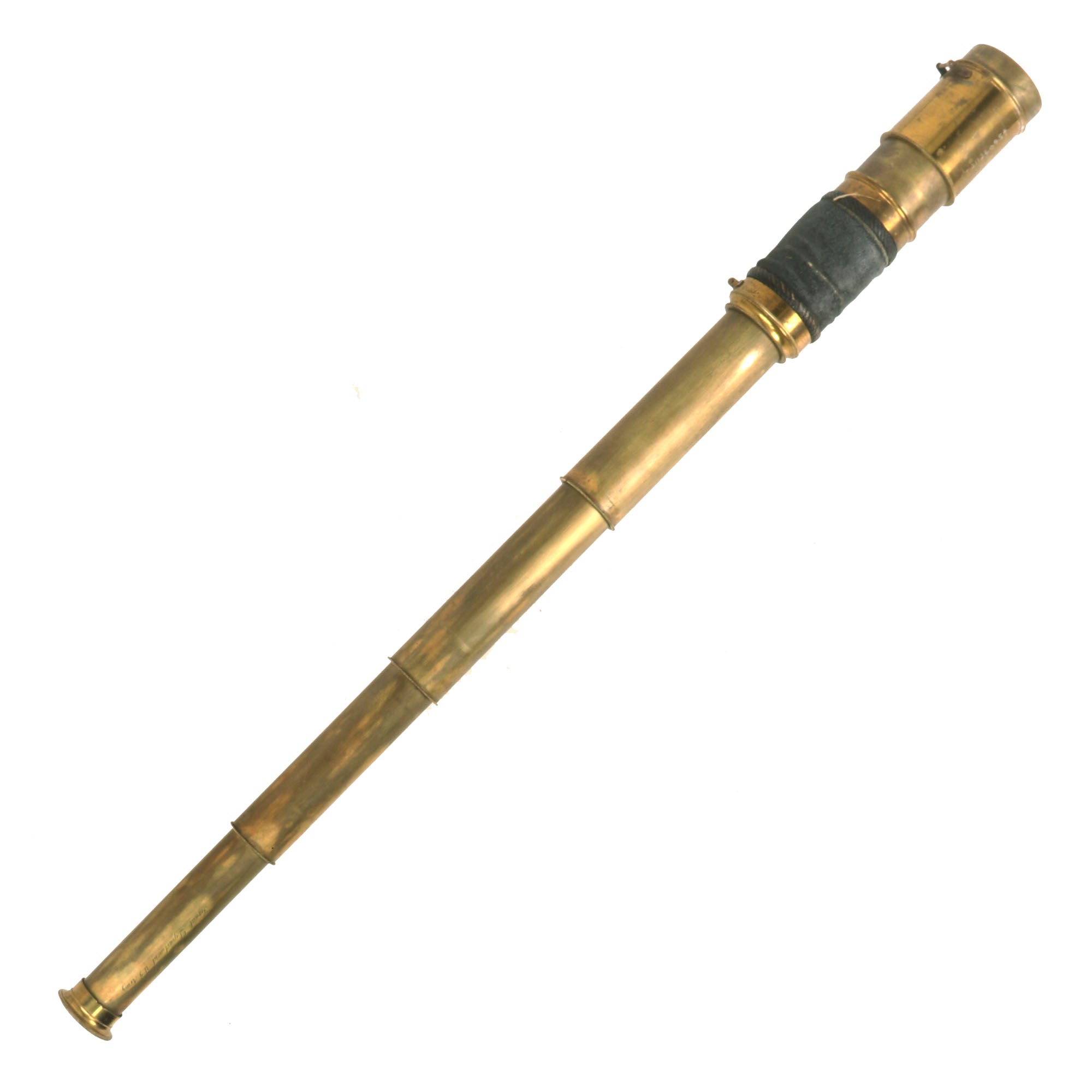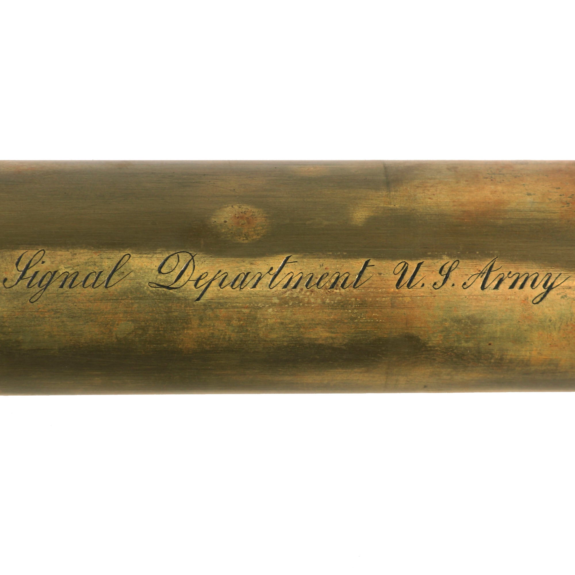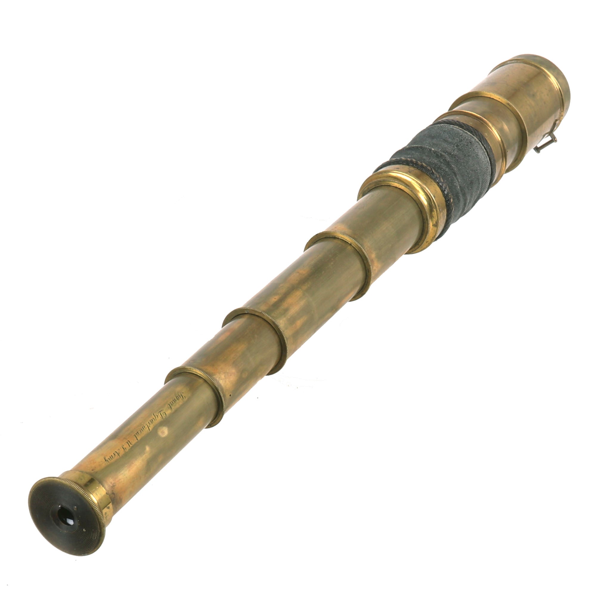 Original Item: Only One Available. This is a lovely four draw spotting telescope from the Spanish-American War era, and it definitely appears to be a rather upmarket example, with a sharkskin cover for the main barrel. There are also fittings on either end, which look like they originally took some type of shoulder strap or carry handle. The telescope is marked on the smallest barrel by the eye piece with the issue information: