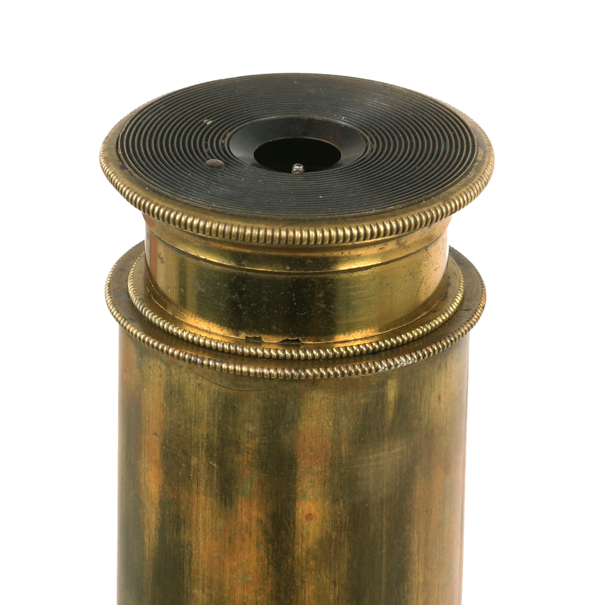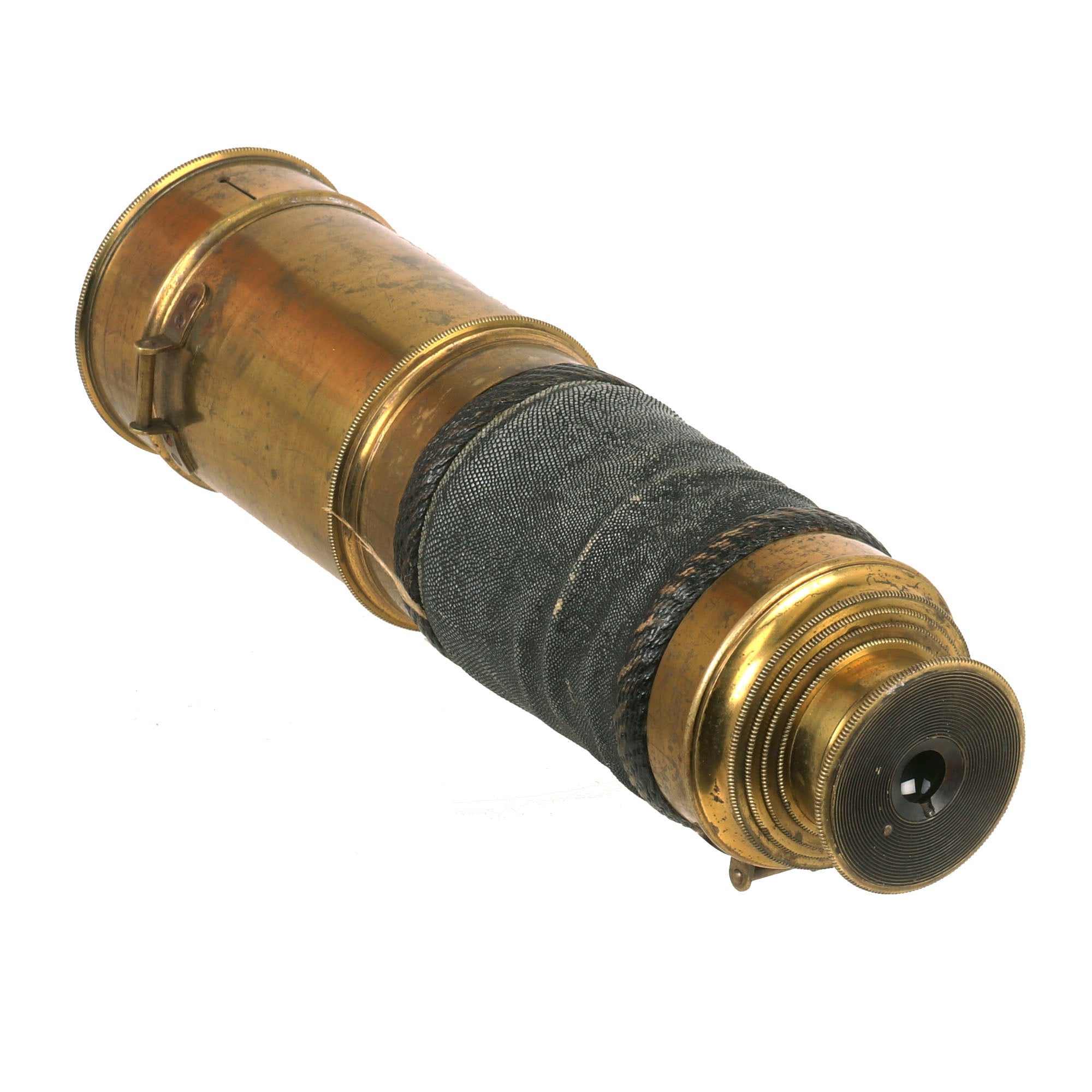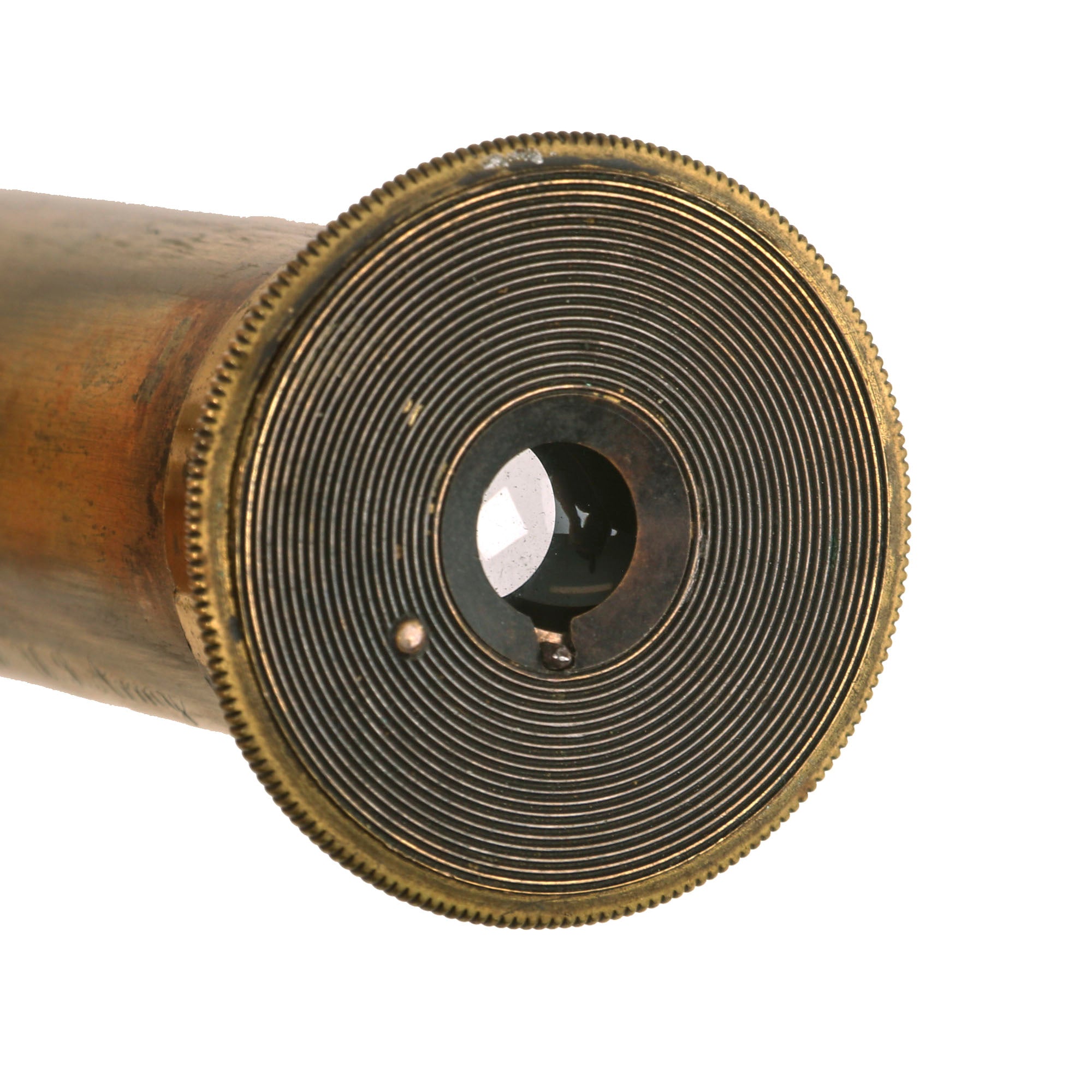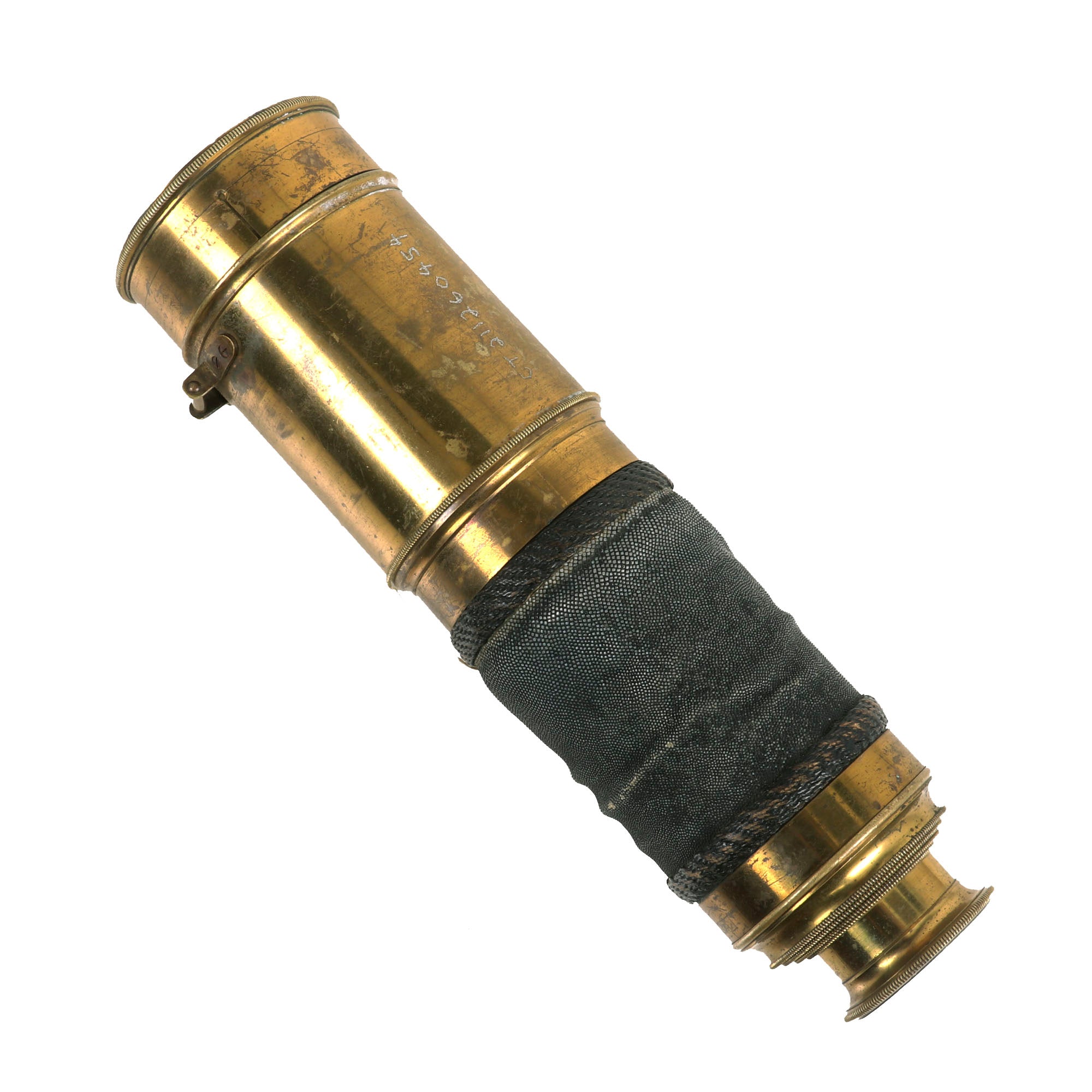 This is a FOUR DRAW telescope measuring 30 3/4" when fully extended including its Sun Shade, and just 8 1/2" when fully compressed. It has a protective sliding eyepiece lens cover, which looks to have some type of filter, which is VERY dark. It also has a cover for the objective lens, which has a small ring in the center. This would be perfect for a signals officer service in the field, in Cuba or elsewhere. Fully brass mounted with sharkskin and fabric barrel covering, this is a most attractive instrument that still gives a good image, though the lenses could use a good cleaning. There is what looks to be an asset tag number scratched into the sunshade, which we have not been able to identify.