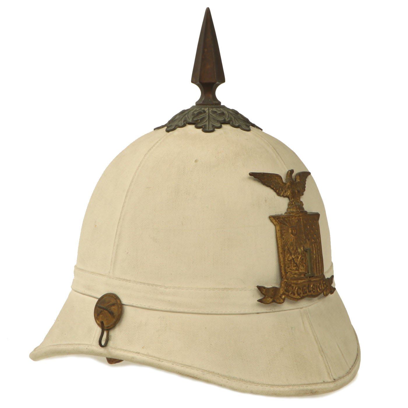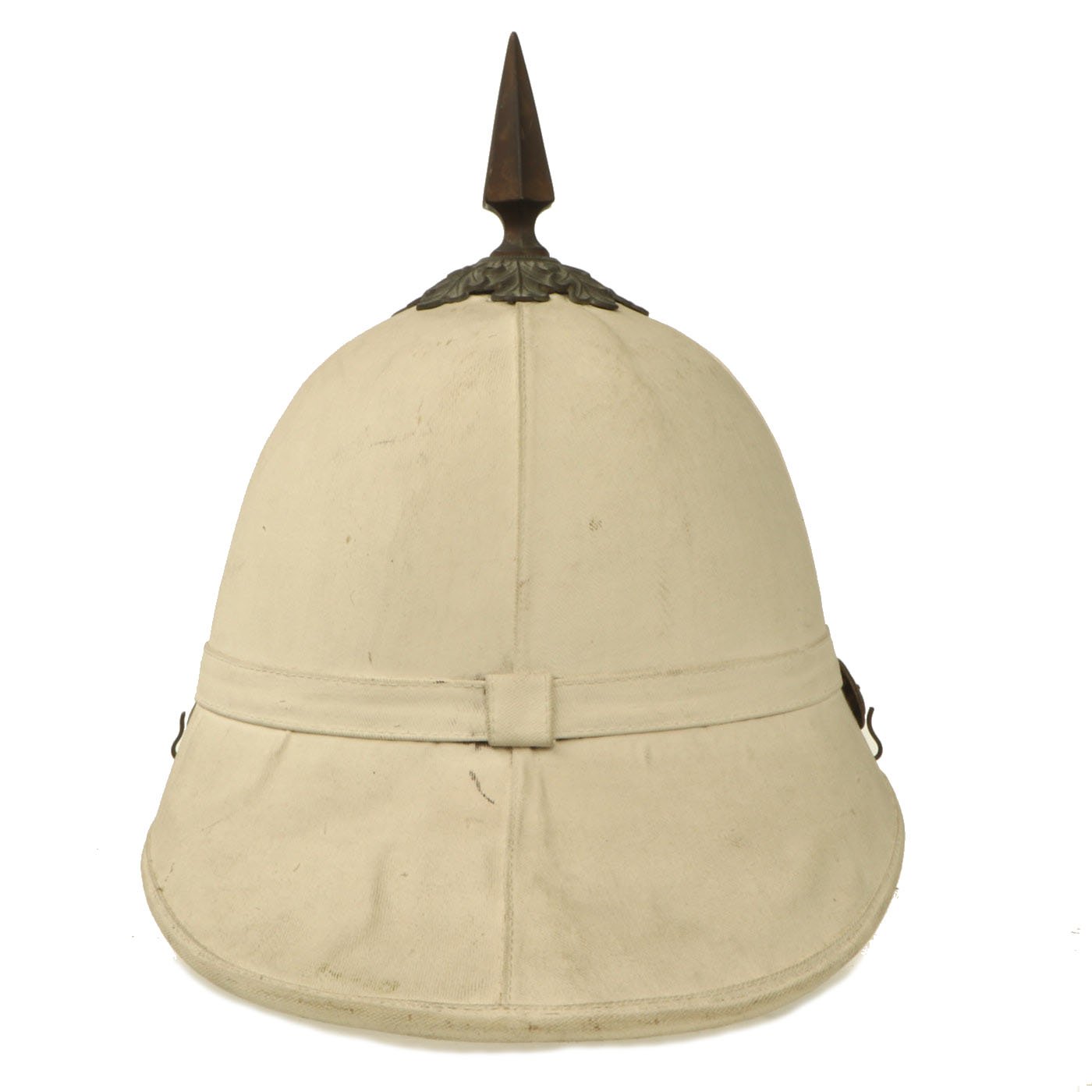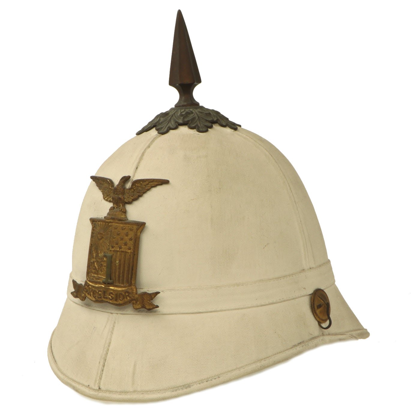 Original Item: One Only. Much like our European cousins in the 1880s, the U.S. Army started to adopted spiked pith helmets, sometimes in white, with all brass mounts and occasionally plumes. These saw active service in the Spanish American War of 1898 especially in the tropical climate in Cuba. While often called "Pith Helmets", the U.S. variety was usually made of cork or other materials.