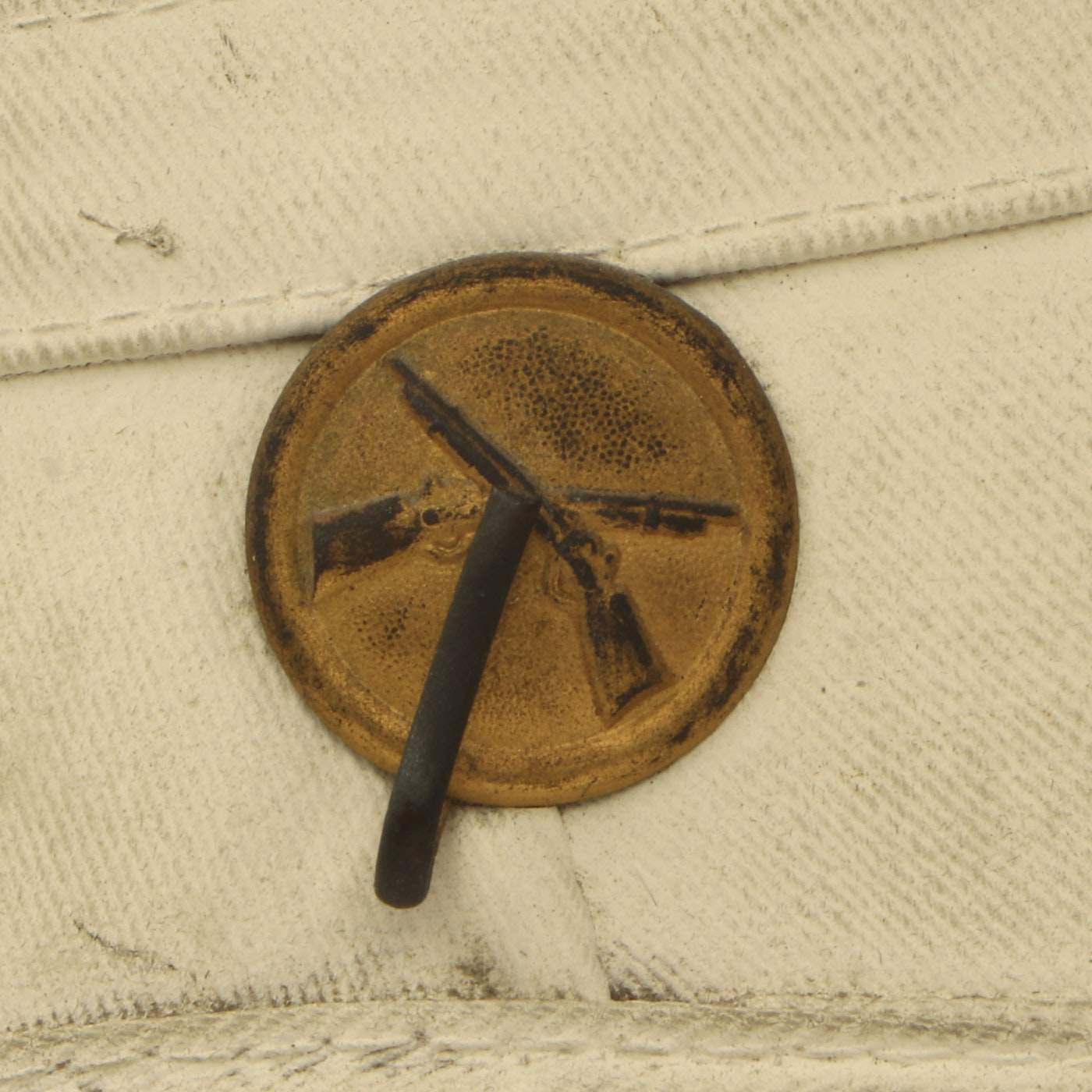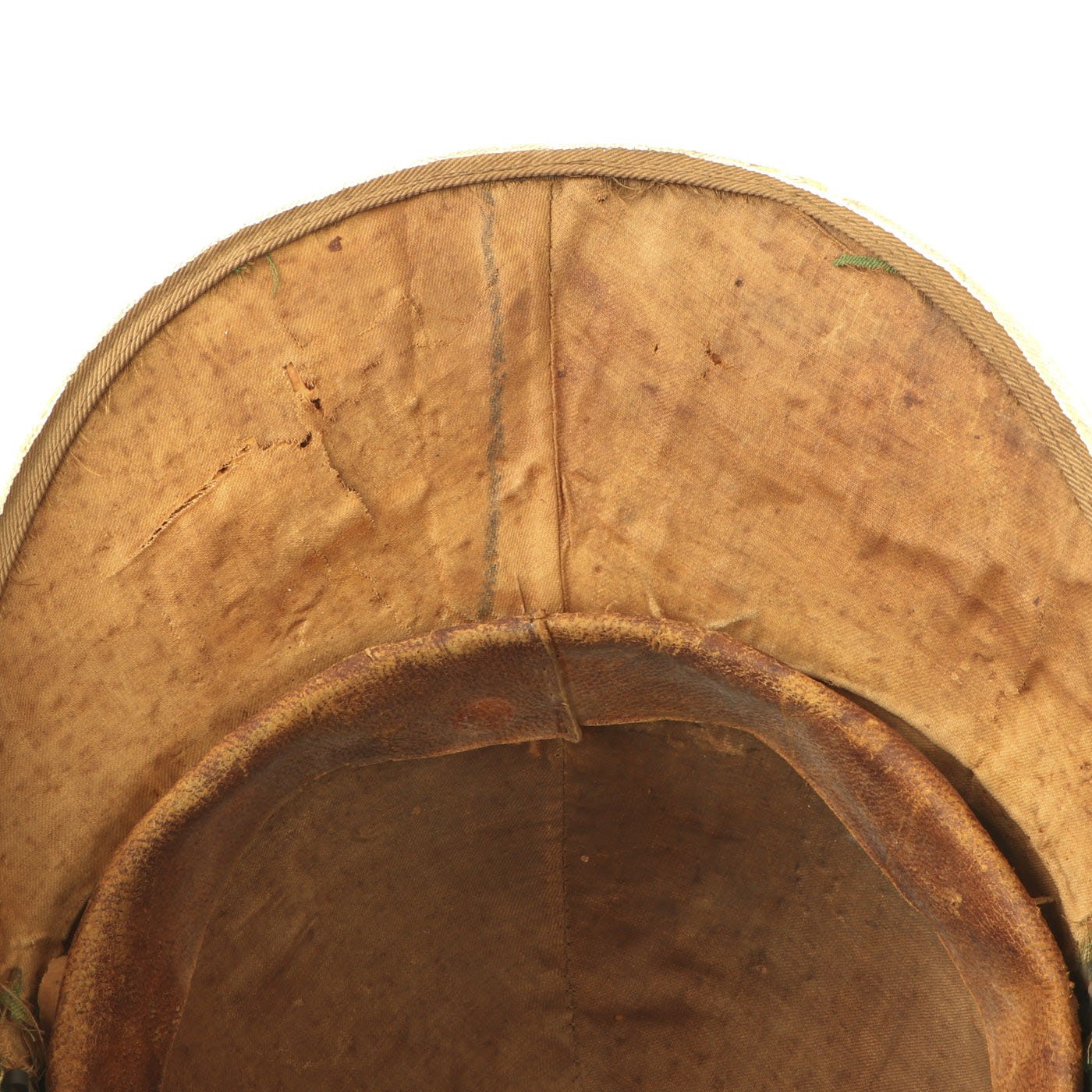 This helmet is in white, and is the standard spiked infantry helmet, possibly for an officer. It has chin strap hook buttons on the sides, with the correct "crossed rifles" insignia for infantry. There are also chin strap hooks on the interior, under the liner, which is partly detached from the helmet. It was originally attached by thick string loop stitches through the shell, which went through cork spacers. More than half of these are missing now, most likely having rotted out due to age. Also the green lining is missing under the rear visor. There is a visible PHILADELPHIA ink stamp on the underside of the sweatband, so it was processed through the Philadelphia Quartermaster Depot.