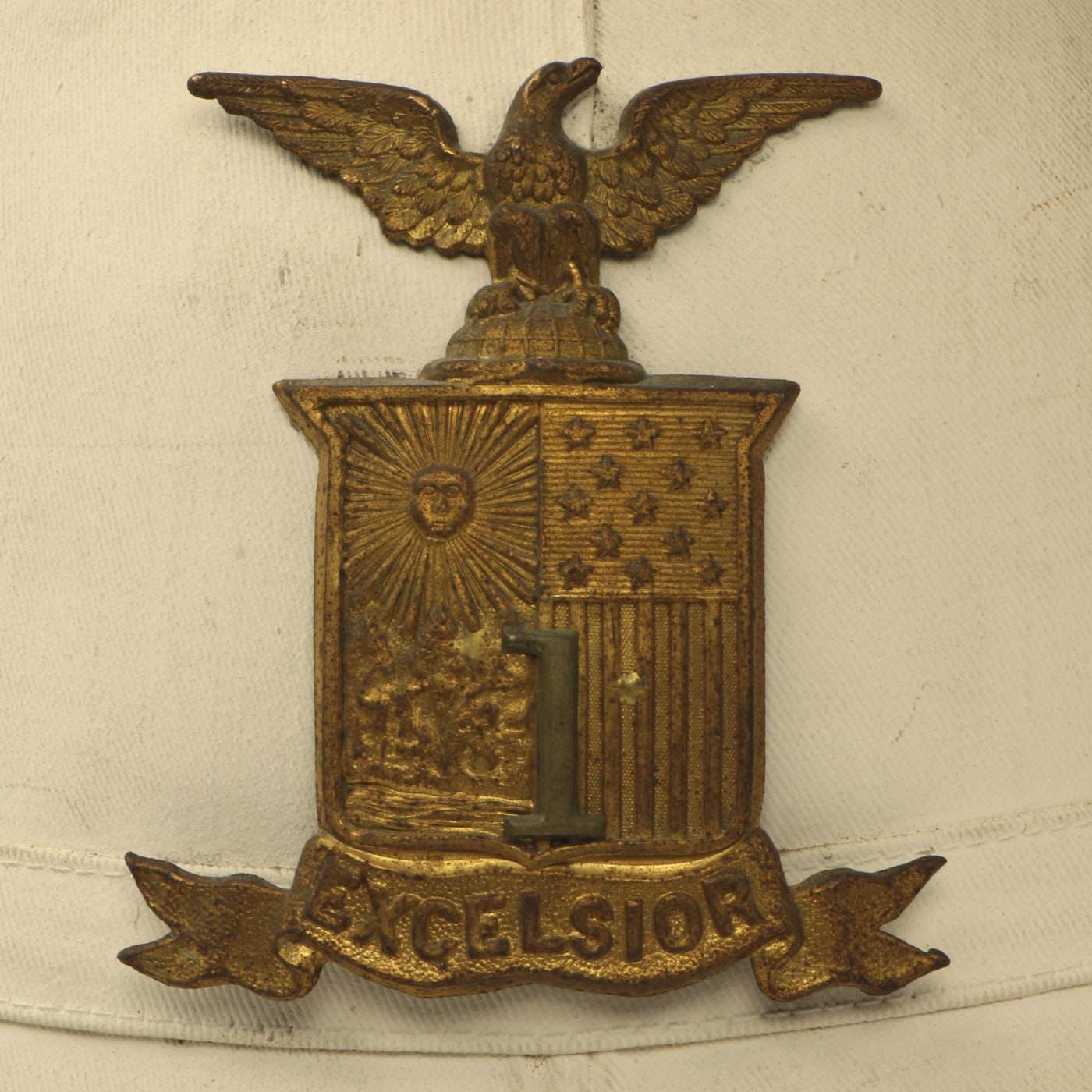 The front of the helmet has a large EXCELSIOR Brigade helmet plate, with the number 1 on the shield. As best we can tell, this was a military unit in the Civil War Union Army raised in New York State and the surrounding areas. This may have been a helmet used by former members of the group.