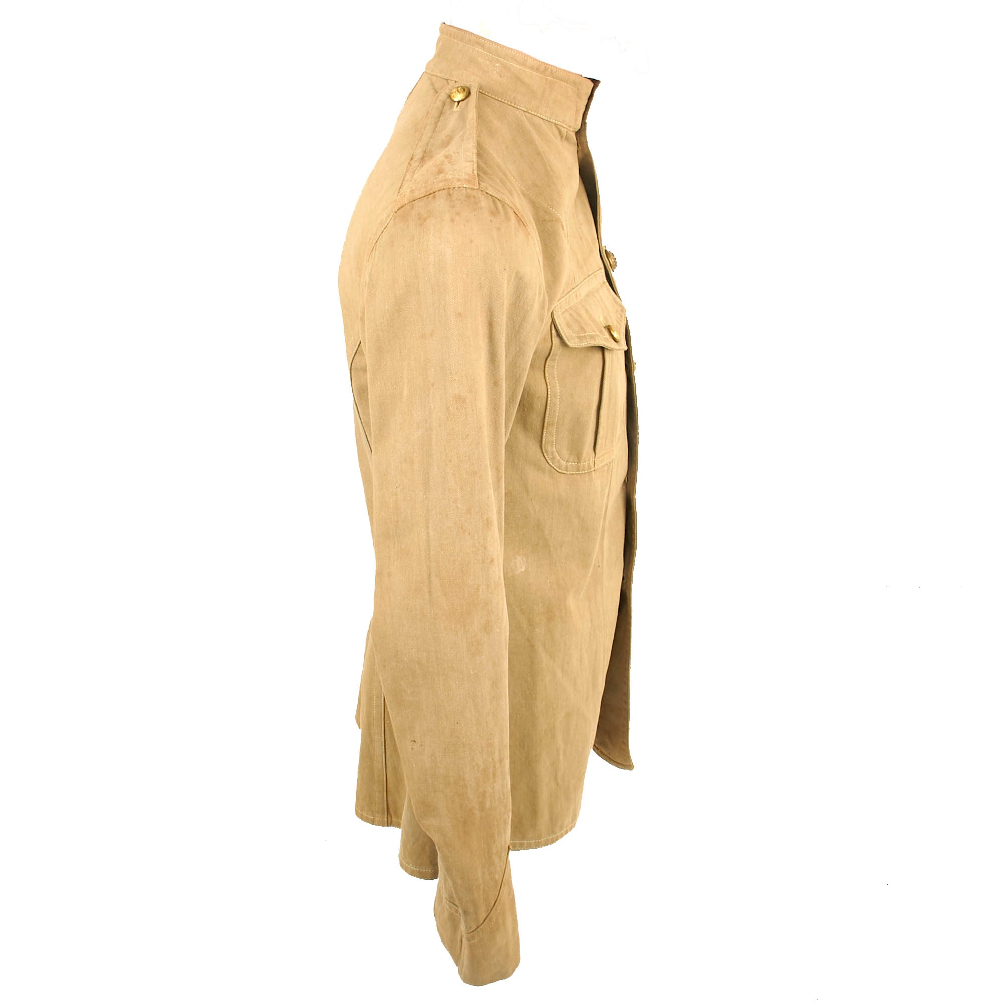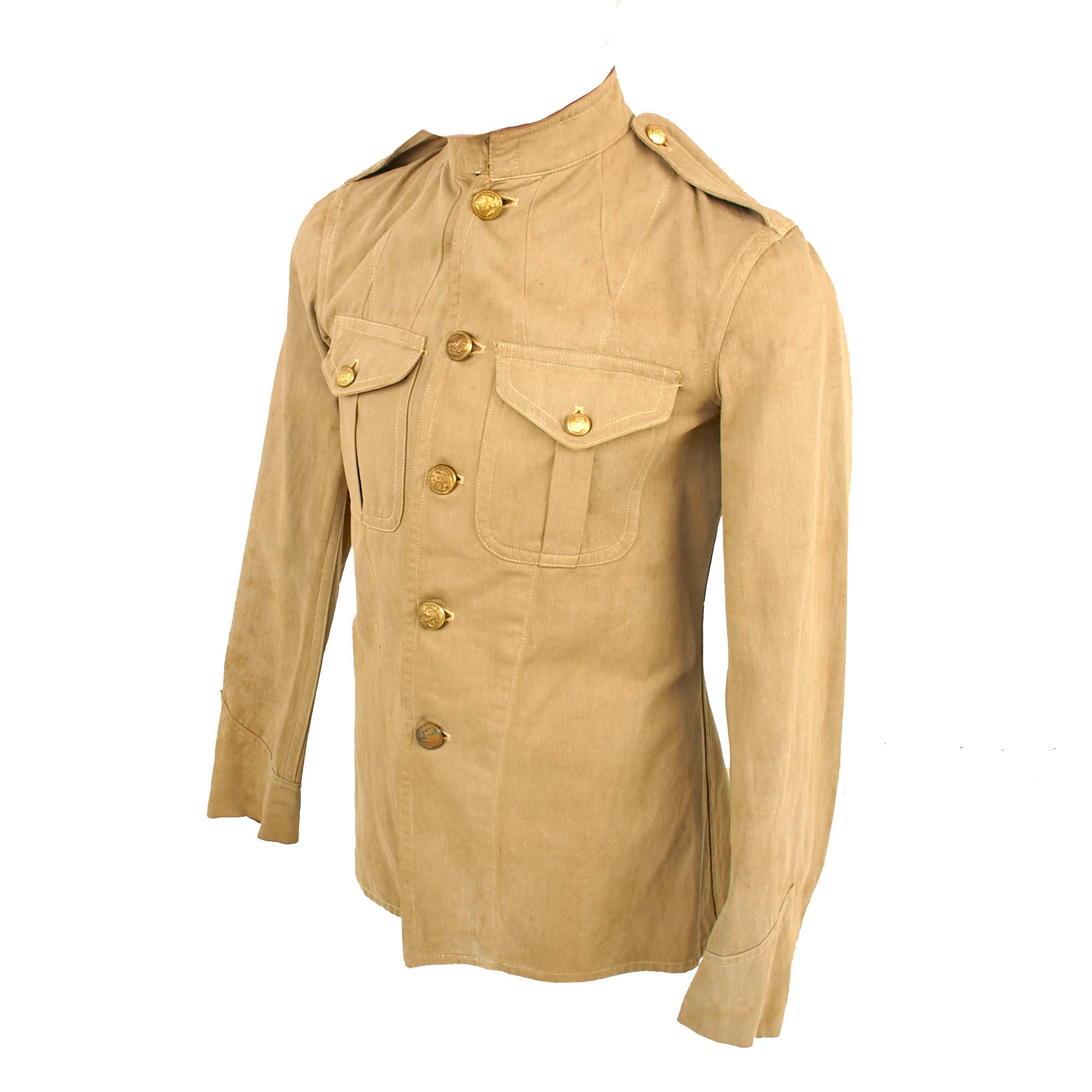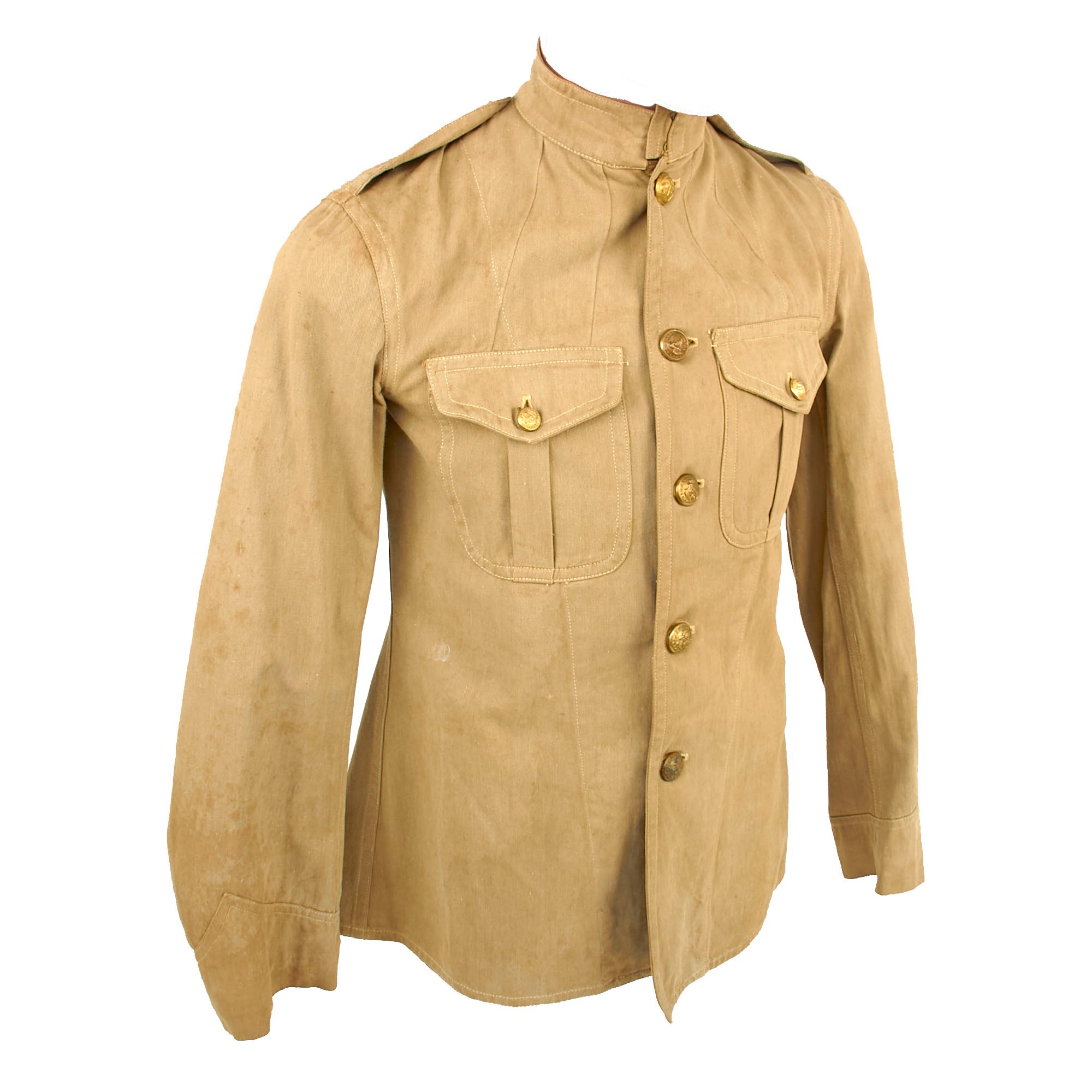 Original Item. Only One Available. This is a very scarce USMC uniform from the Spanish-American War era, a Model 1898 Khaki tropical uniform tunic. This Uniform dates from 1898-1904 period, and was first fielded by Marines in Cuba during the Spanish-American War. This has features of an early coat such as the small pocket flaps and early brass domed buttons (all marked PIPPY CO NY).