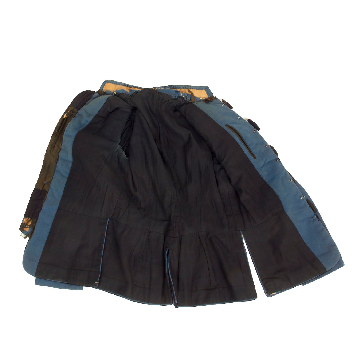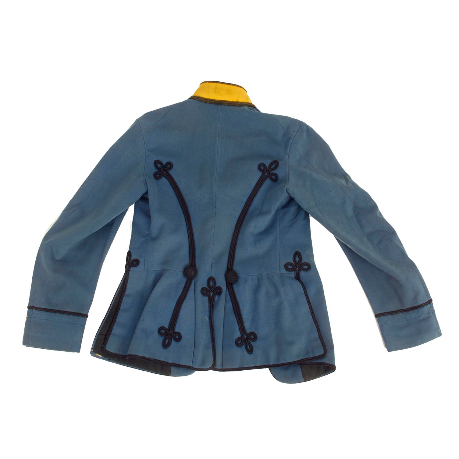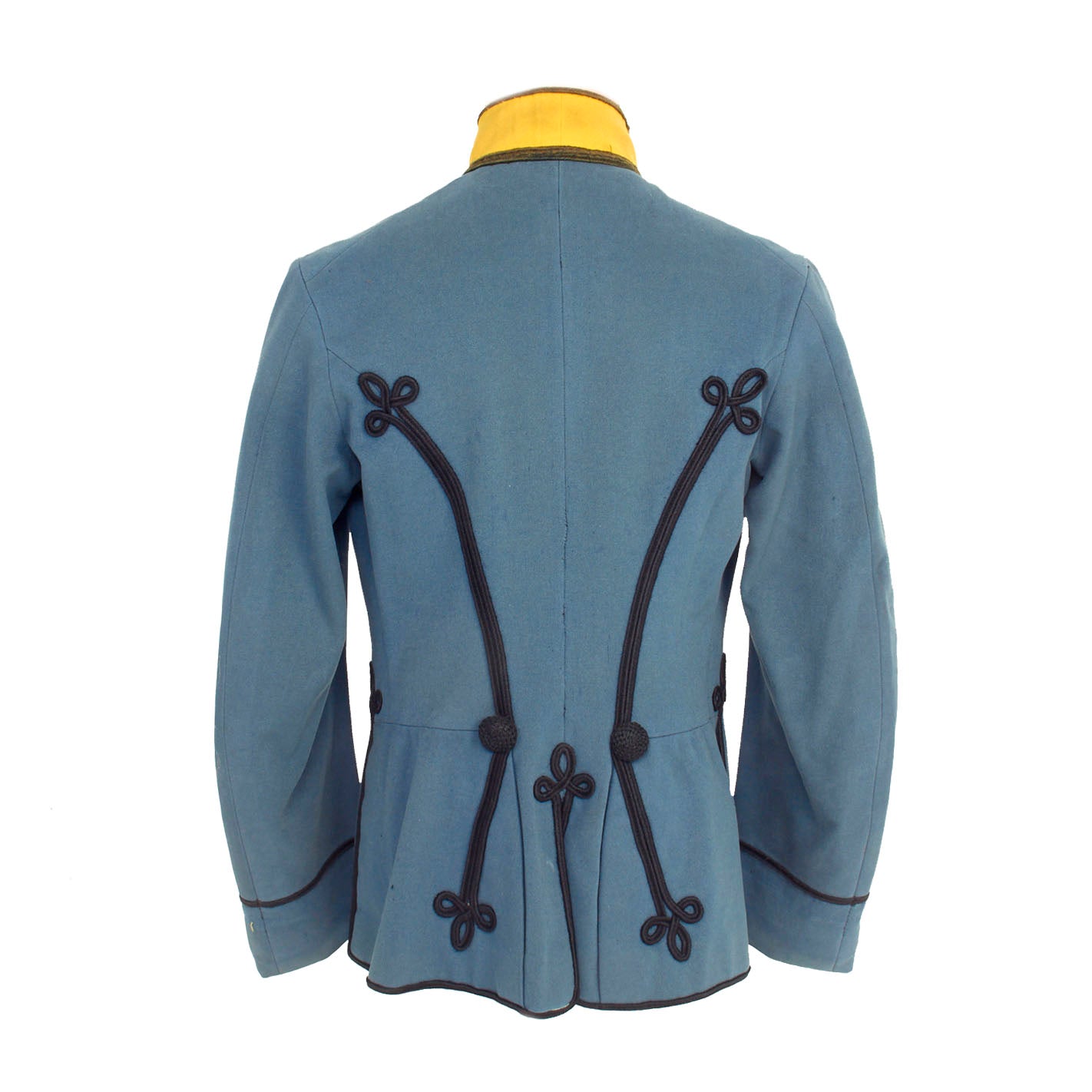 The uniform is a light blue-gray wool Attila with black frogging and features an A on both sides of the yellow wool cuff style collar, denoting the squadron. Only damage to note is the cuff style collar stitching is coming undone and minor, very light staining, beyond that it is in remarkable condition.