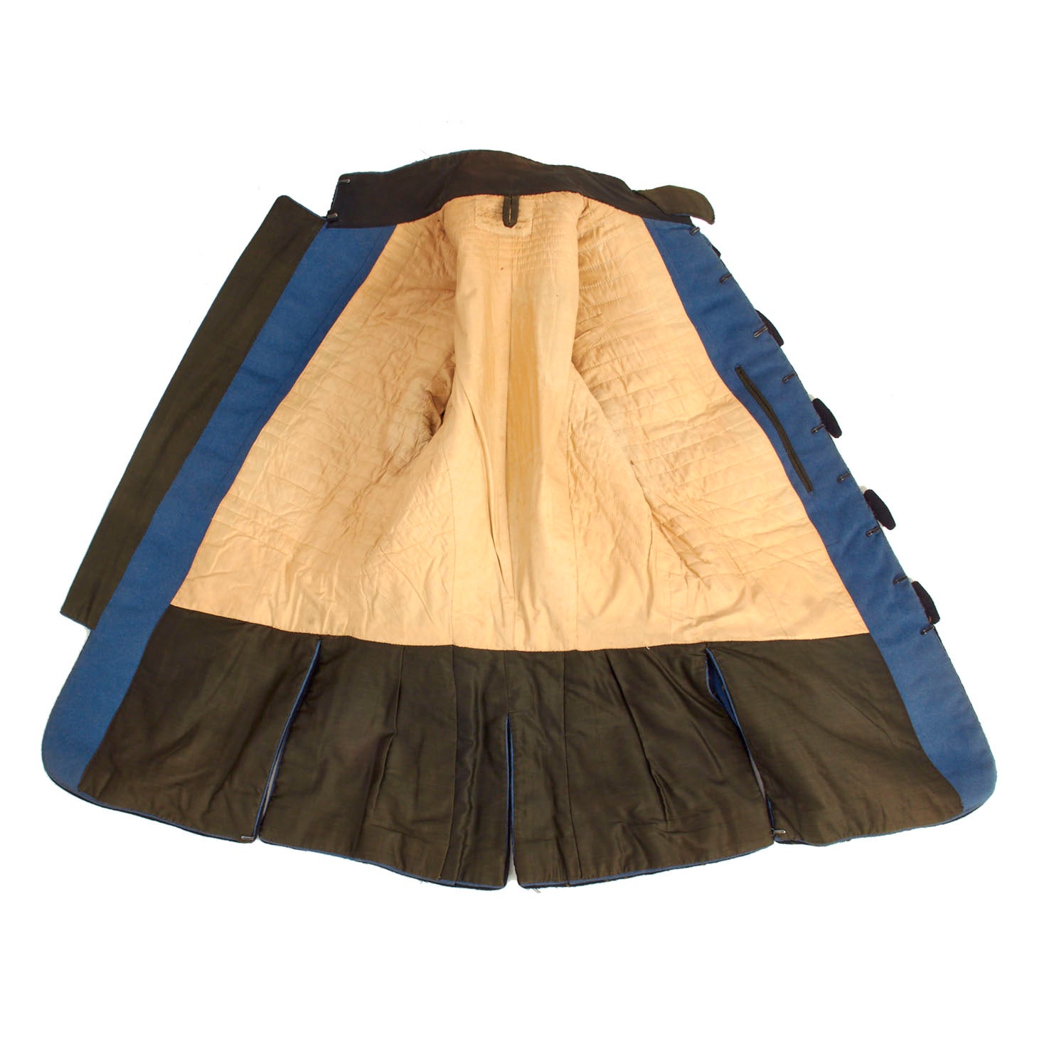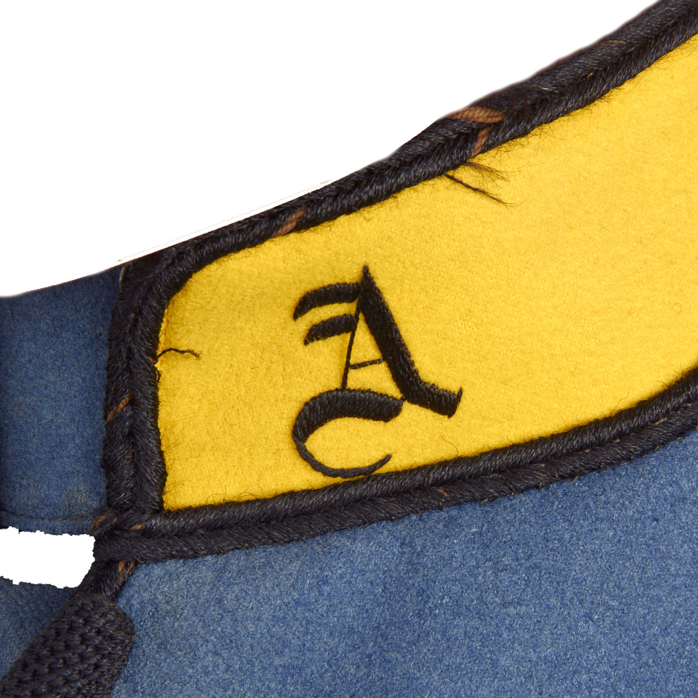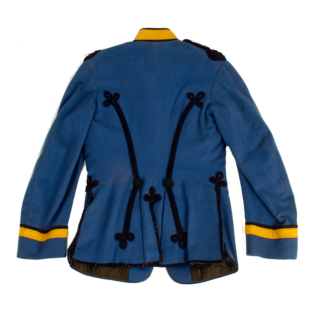 The uniform is a light blue-gray wool attila with black frogging and yellow trimmed cuffs and features an A on both sides of the yellow wool cuff style collar, denoting the squadron. Only damage to note is the cuff style collar stitching is coming undone and minor, very light staining, beyond that it is in remarkable condition.
