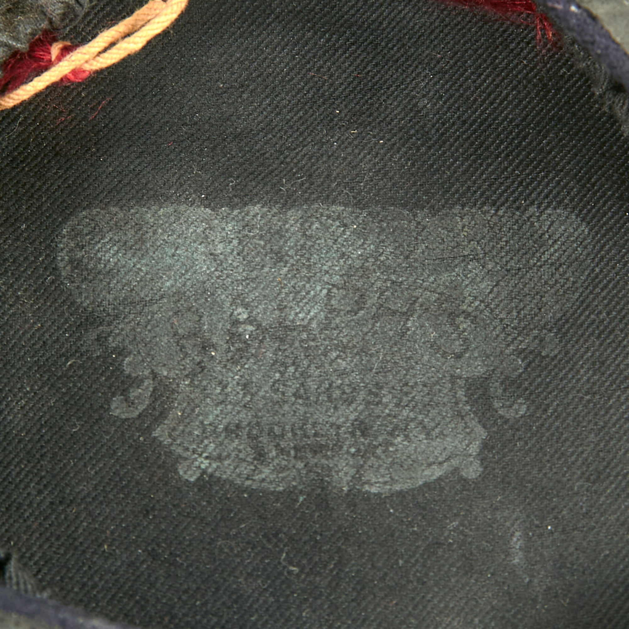 The interior bears a logo for “Ralph’s” located at 133 Sands St., Brooklyn, New York, although it is rather faint. This is very rare, the first flat hat we have ever seen with a maker’s mark. The hat retains the original tie-string that tightens the cap around the head, with the proper red pom-pom end.