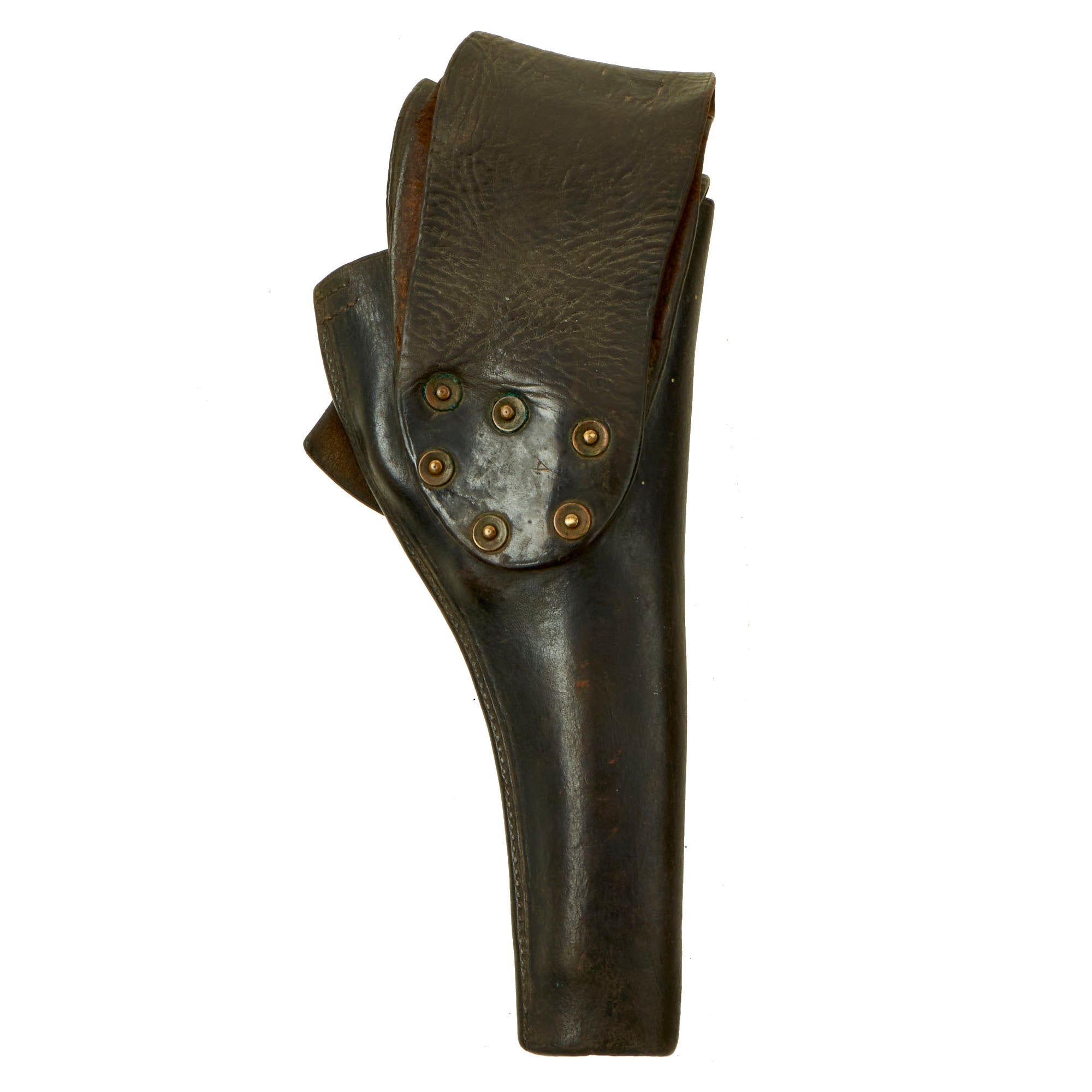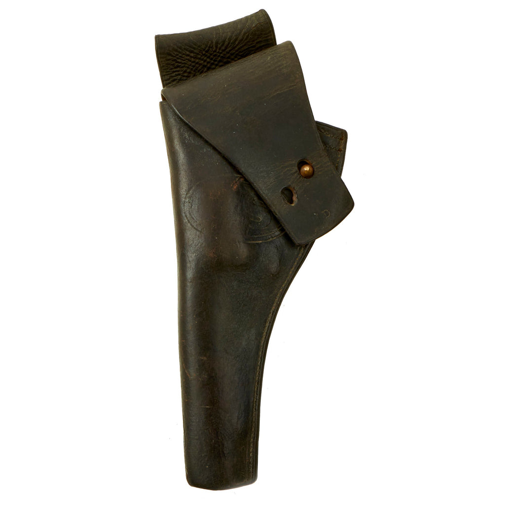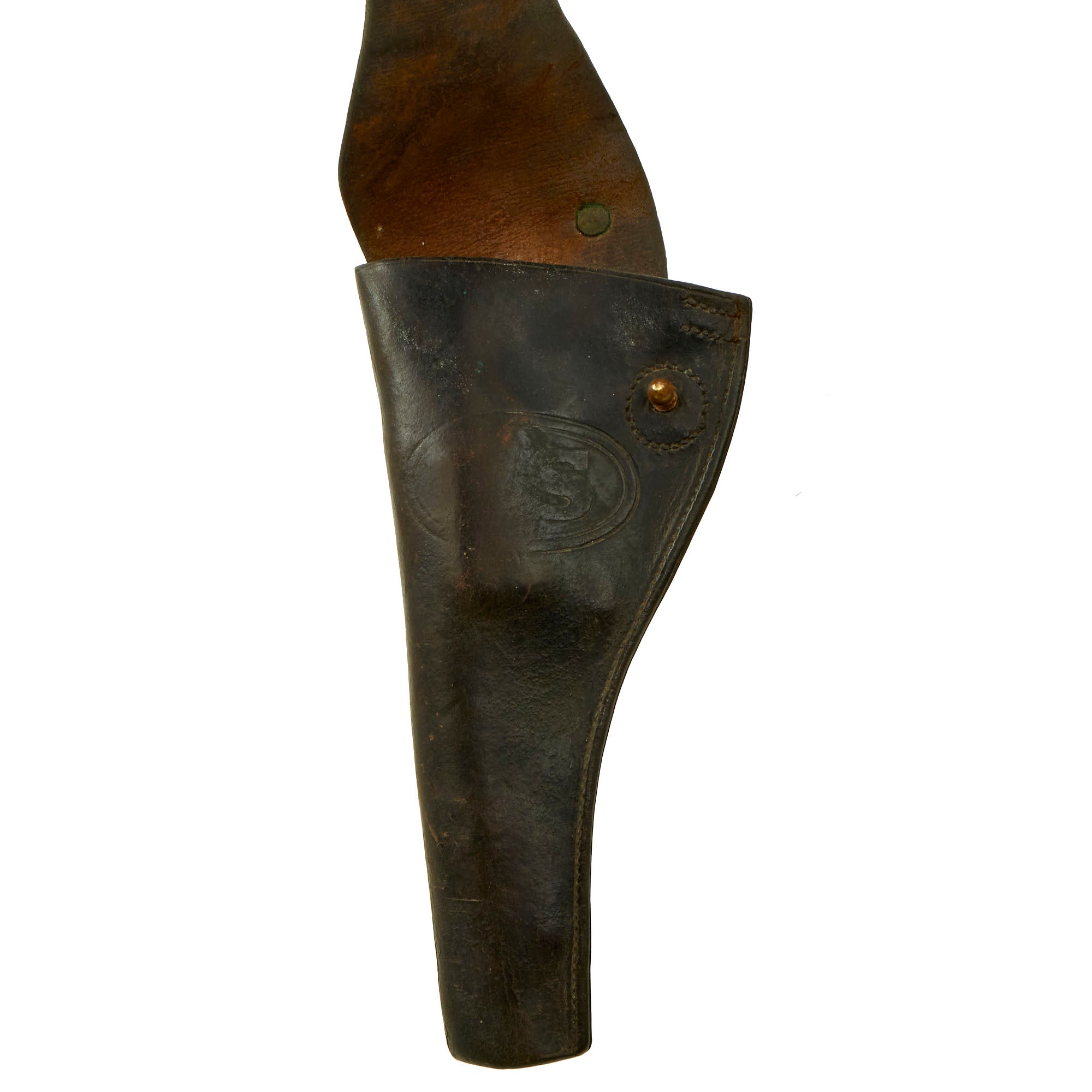 Original Item: Only One Available. This is a very nice example of a full-length 1892 pattern cavalry holster for the Colt .38 caliber revolvers. Both were issued to cavalry units and the 1881 pattern holster was provided with two holes in the flap to allow the angle to be changed to contain either revolver. These holsters were often shortened later for use with the shorter barrel Colts issued to all branches of service, but usually called the “artillery” model. This holster, however, is still full length and the body shows a wonderful, smooth finish with minor crazing and a visible US stamp on the front flap.