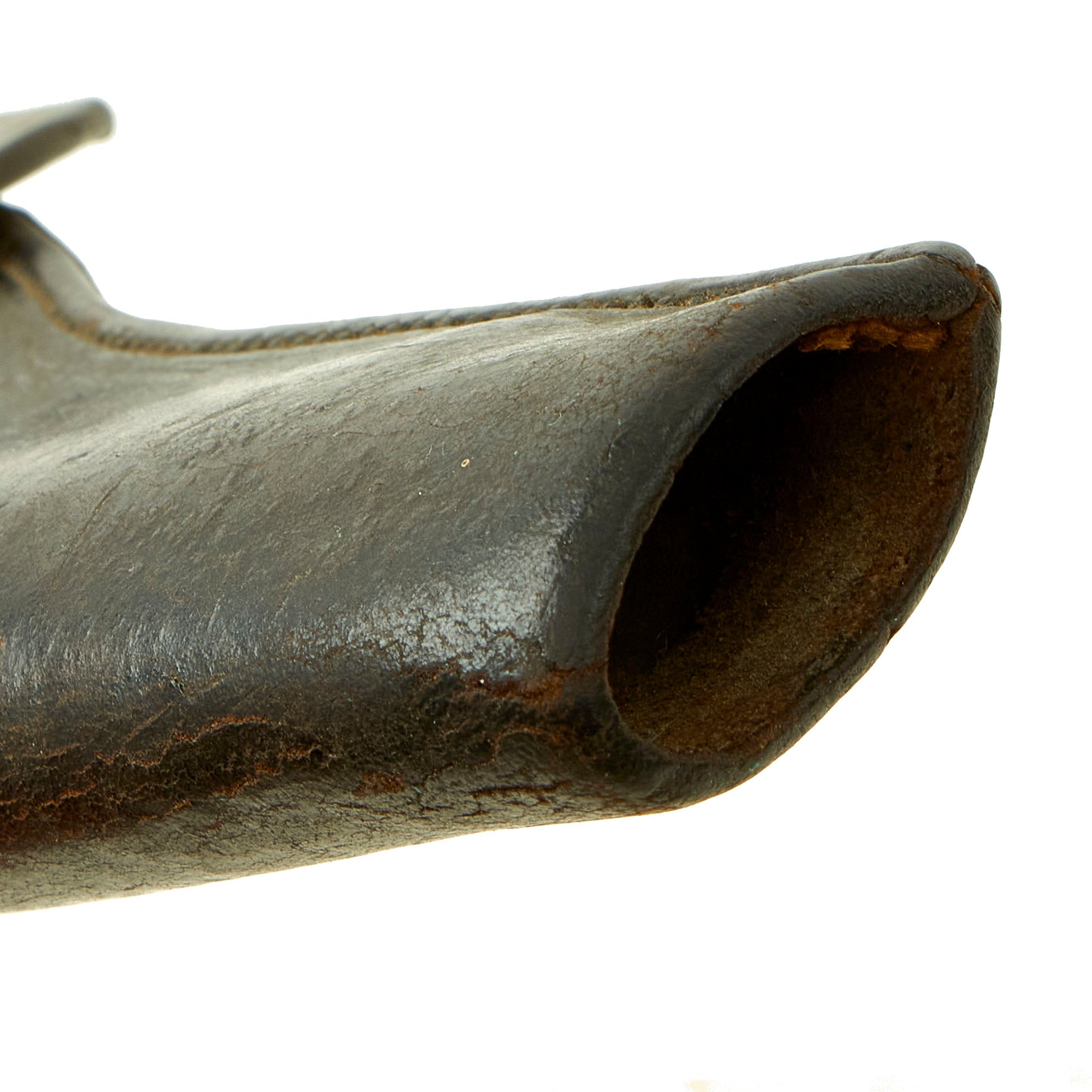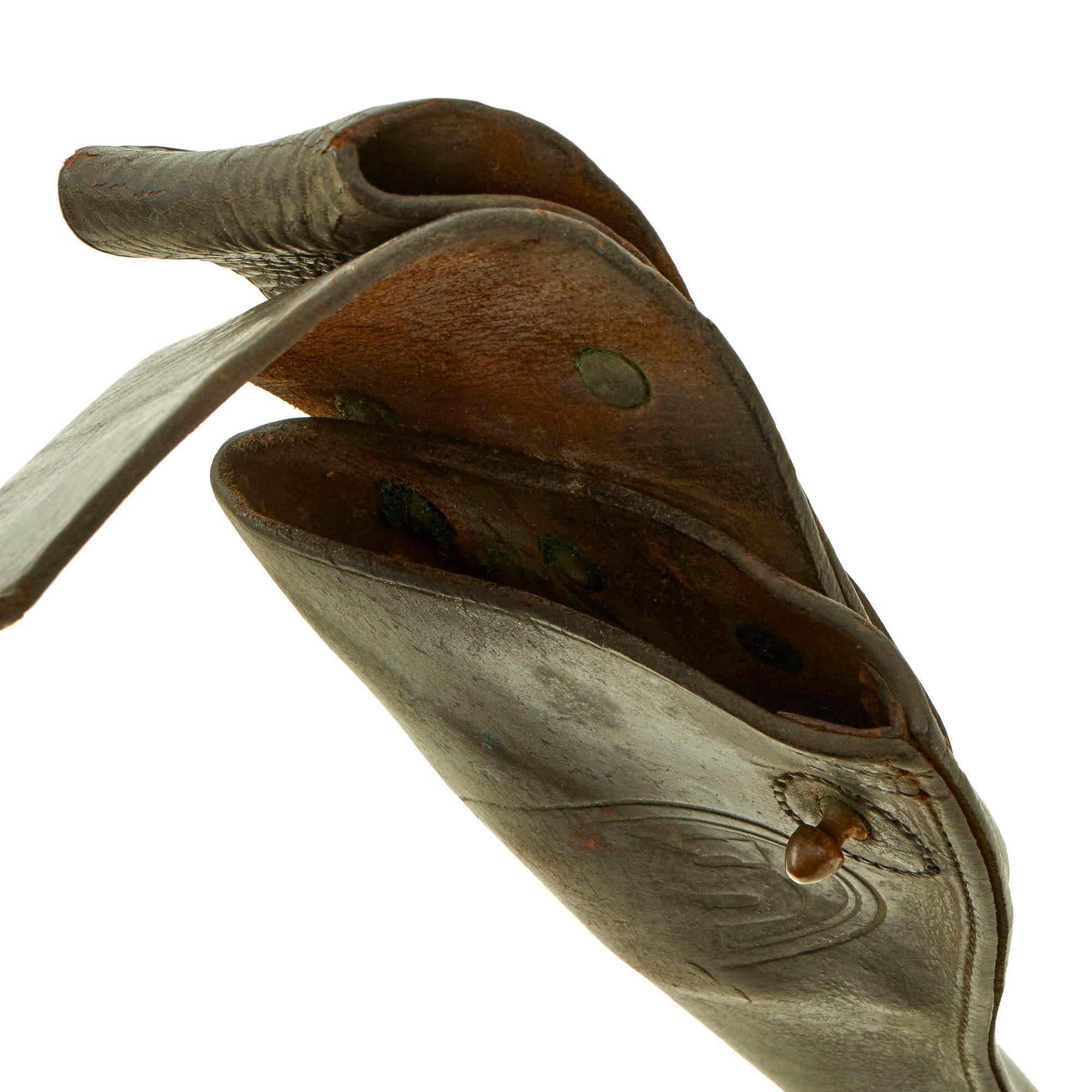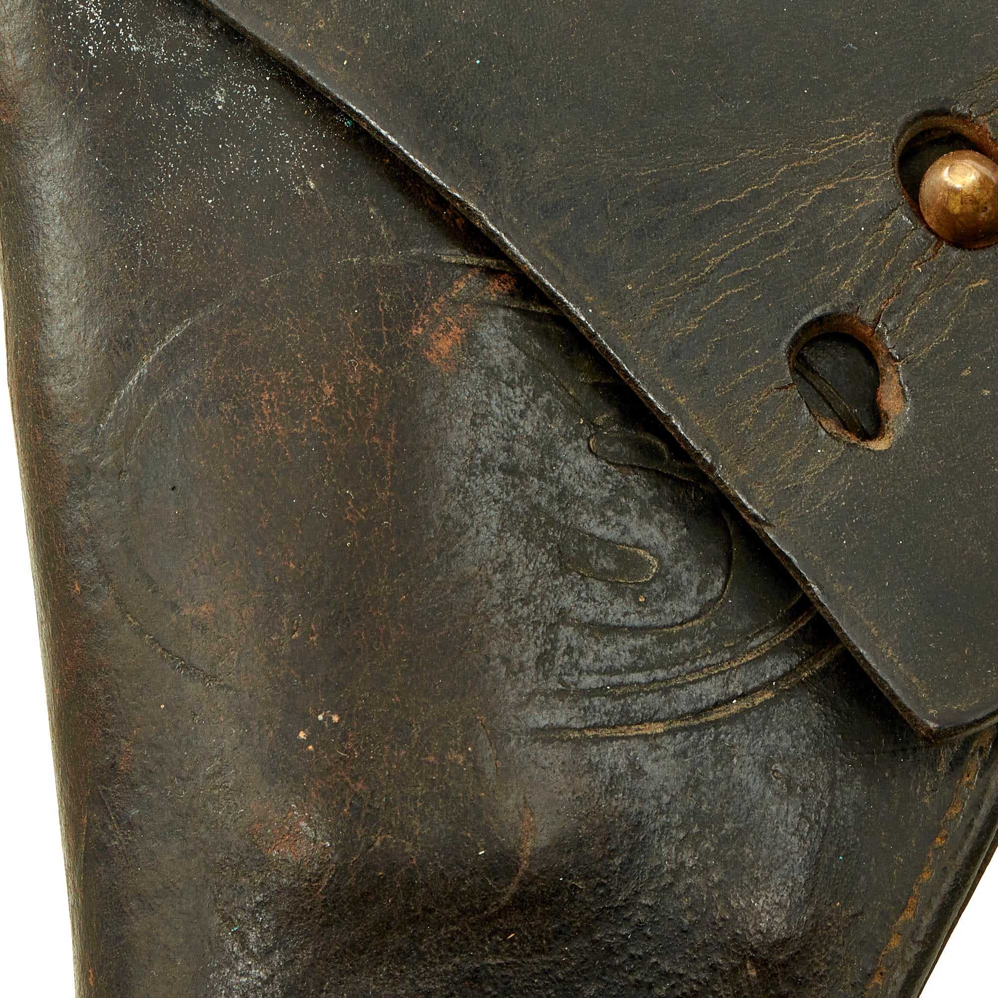 Original Item: Only One Available. This is a very nice example of a full-length 1892 pattern cavalry holster for the Colt .38 caliber revolvers. Both were issued to cavalry units and the 1881 pattern holster was provided with two holes in the flap to allow the angle to be changed to contain either revolver. These holsters were often shortened later for use with the shorter barrel Colts issued to all branches of service, but usually called the “artillery” model. This holster, however, is still full length and the body shows a wonderful, smooth finish with minor crazing and a visible US stamp on the front flap.
