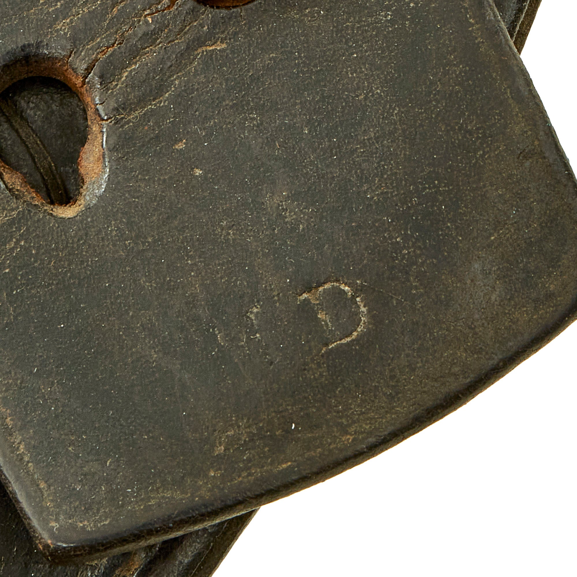 The belt loop has a six-rivet attachment that is characteristic of the 1896 belt loop alteration. The army discovered the old loops would not accommodate a filled double-loop .30-40 cartridge belt and sent out larger replacement loops to cavalry companies to be attached by post or company saddlers. They were instructed, unless otherwise directed by a company commander, to use three additional rivets along the bottom of the loop rather than disturb existing stitching by sewing on the new ones. The maker mark is still faintly visible on the loop and reads as: