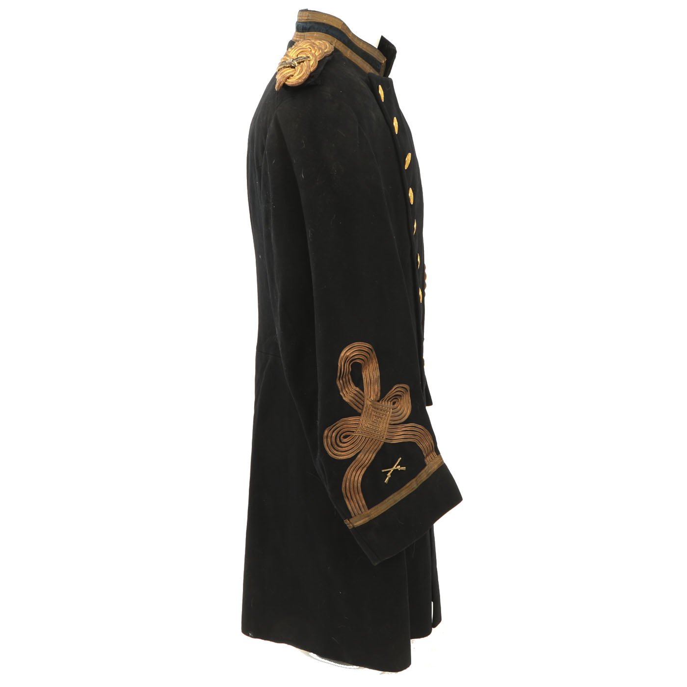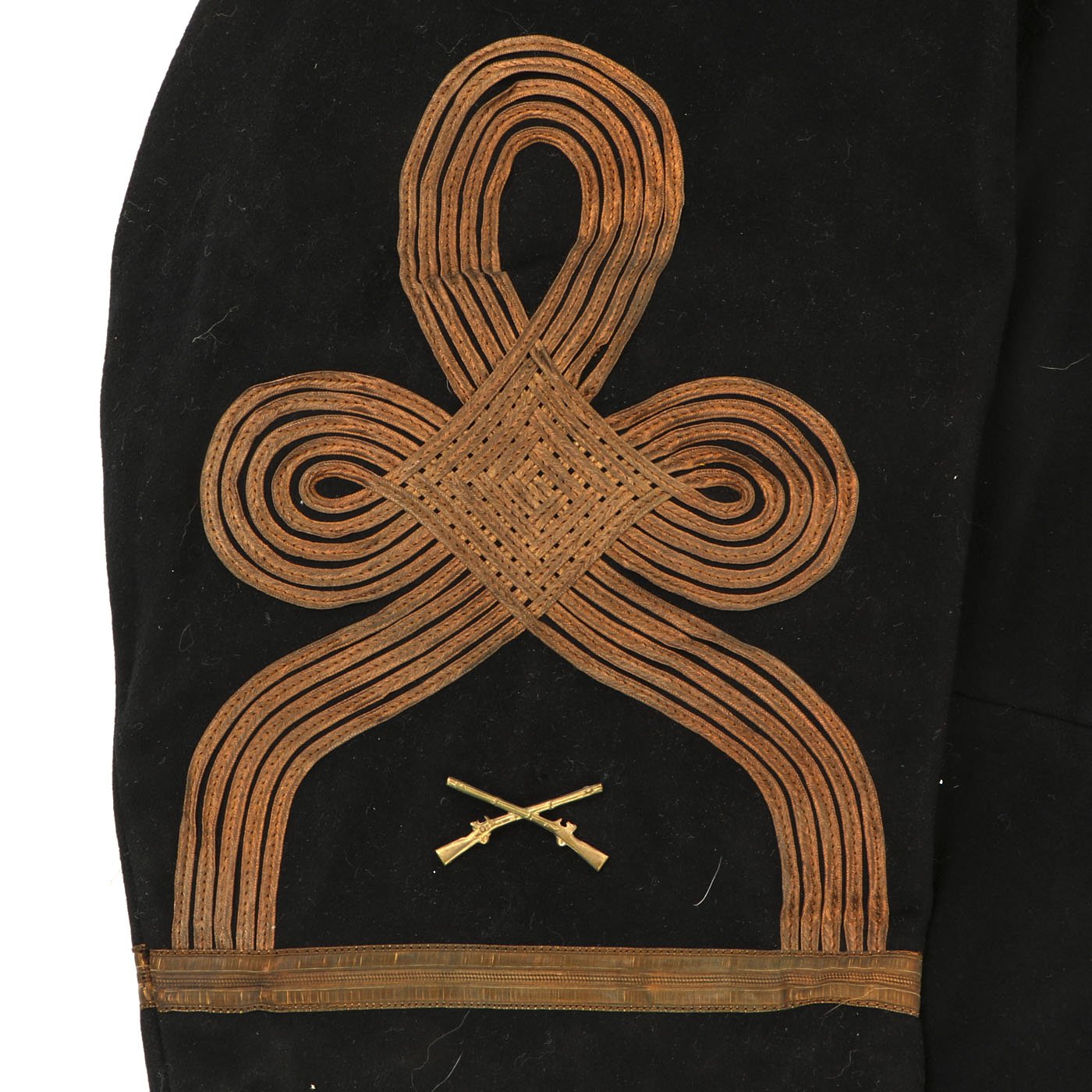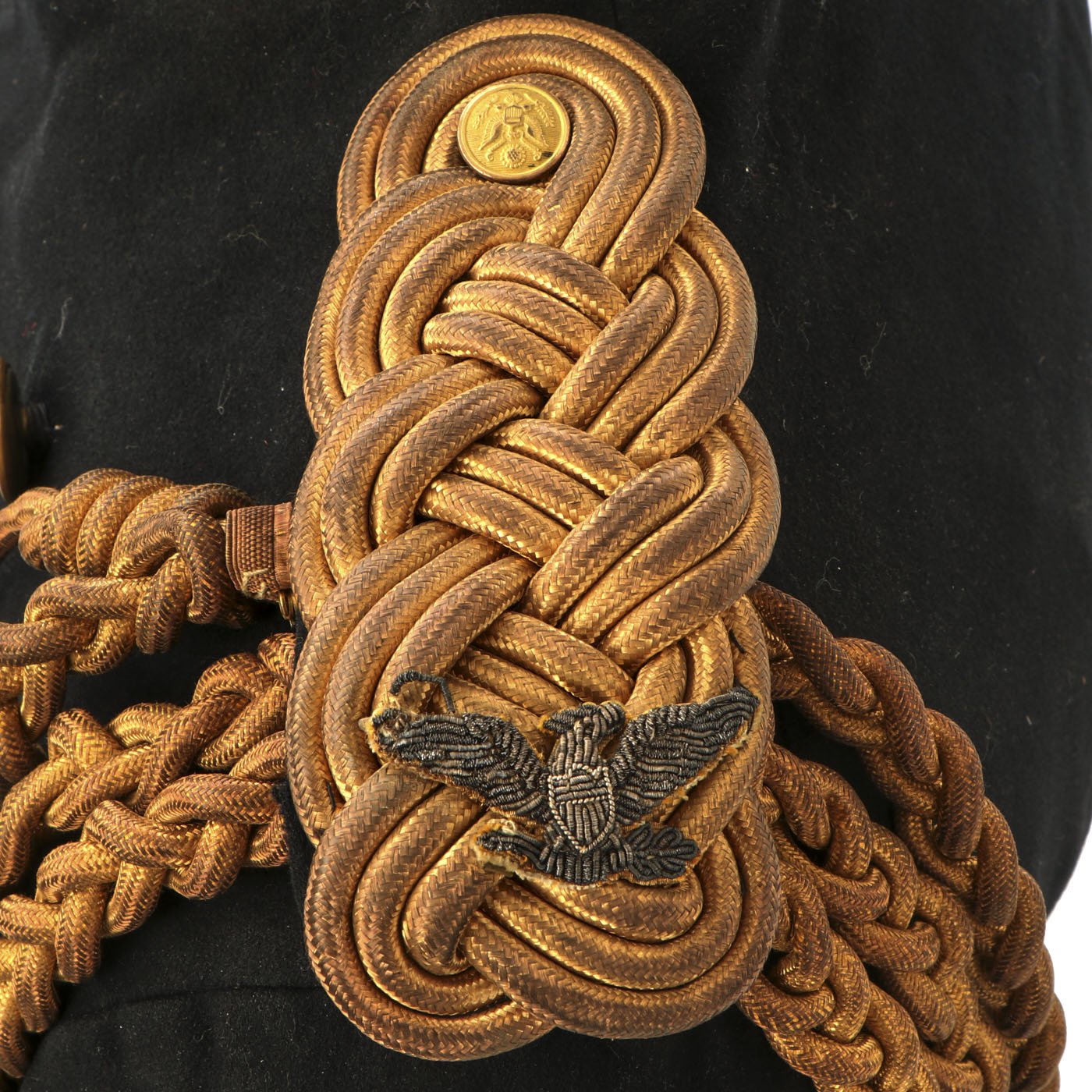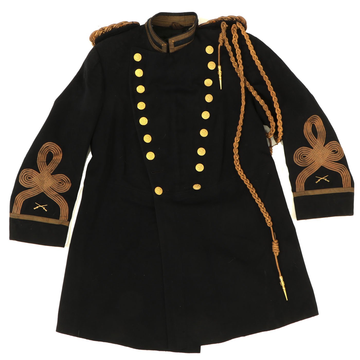 Original Item: Only One Available. U.S. Army 1902 Officer's Blue Wool Frock Coat. Bullion embroidered crossed rifles pins on each sleeve. Collar bordered with gold bullion tape. Heavy gold bullion interwoven shoulder boards with bullion Colonel insignia on both. Gold bullion entwined tape on sleeves to show rank, four rows for rank of Colonel. The buttons back marked and all present but one. It has a very nice quilted lining with two breast pockets and two hidden rear skirt pockets. The condition is very good with little wear.