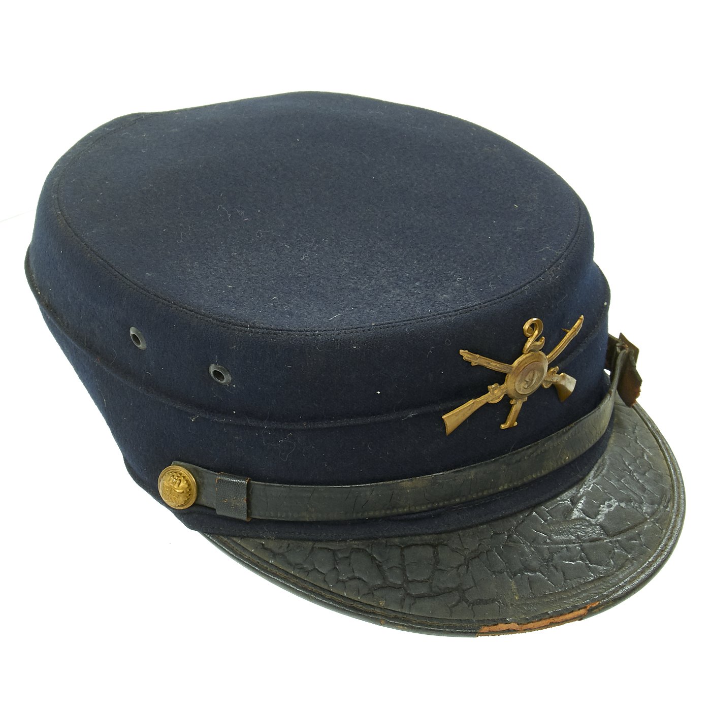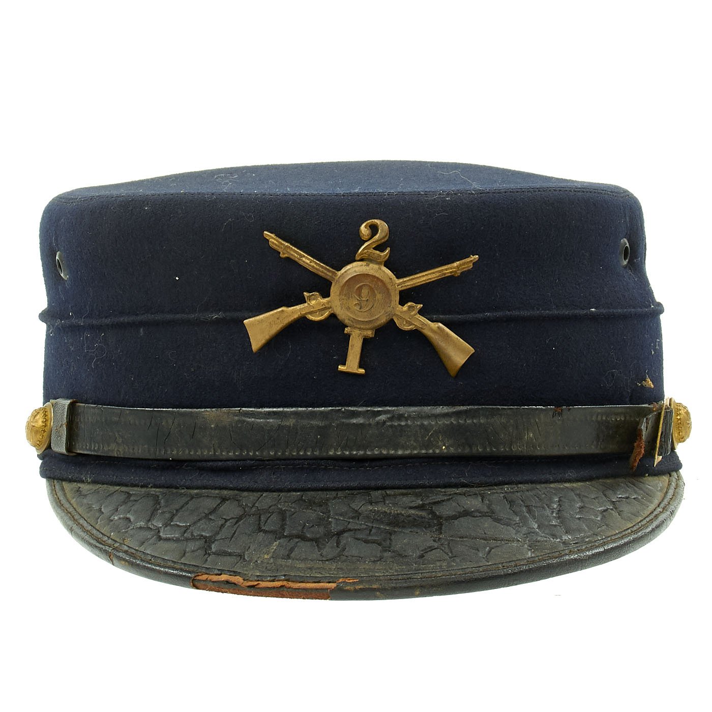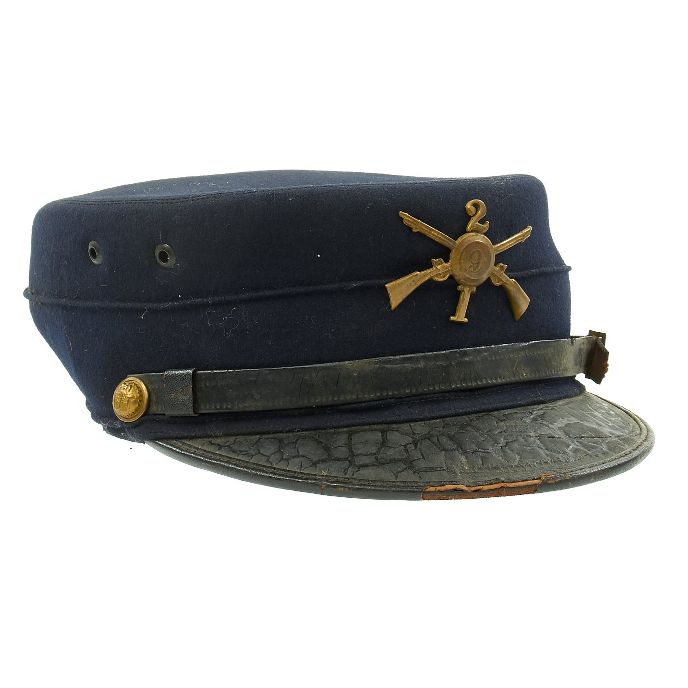 Original Item: Only One Available. This is a size 7 1/8 regulation M1895 enlisted forage cap. This was the U.S. Army's first transition to a visor cap after leaving the traditional kepi design. Made of dark blue wool with enameled leather visor bound with patent leather, and a tarred leather chinstrap. Hat retains original russet brown leather sweatband which is damaged in a few places. Inside of crown is lined with black silk and maker marked RIDABOCK & COMPANY, NEW YORK. Gold gilt federal regulation eagle buttons to the sides with "I" Company, 2nd Infantry insignia affixed. Cap is in overall good condition.