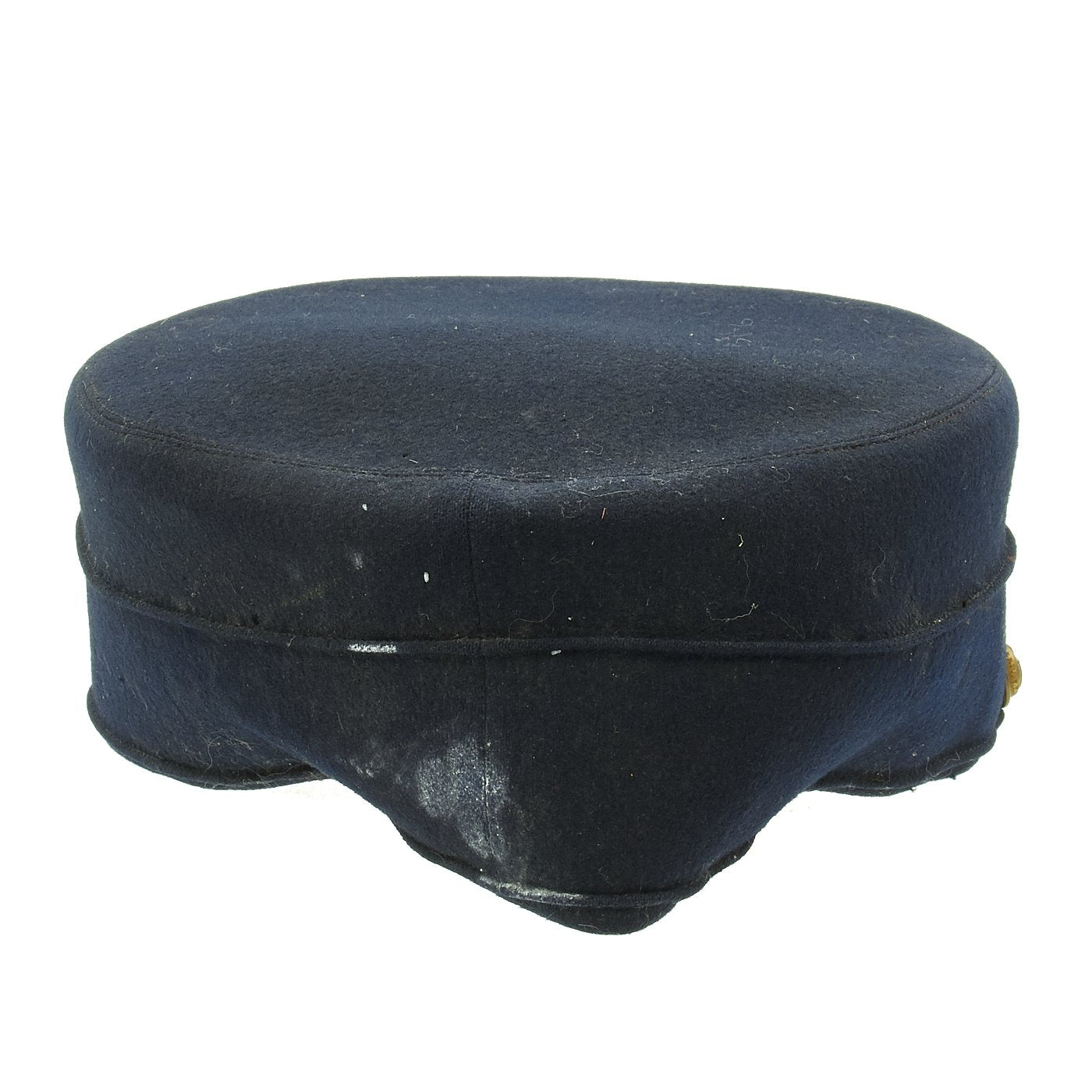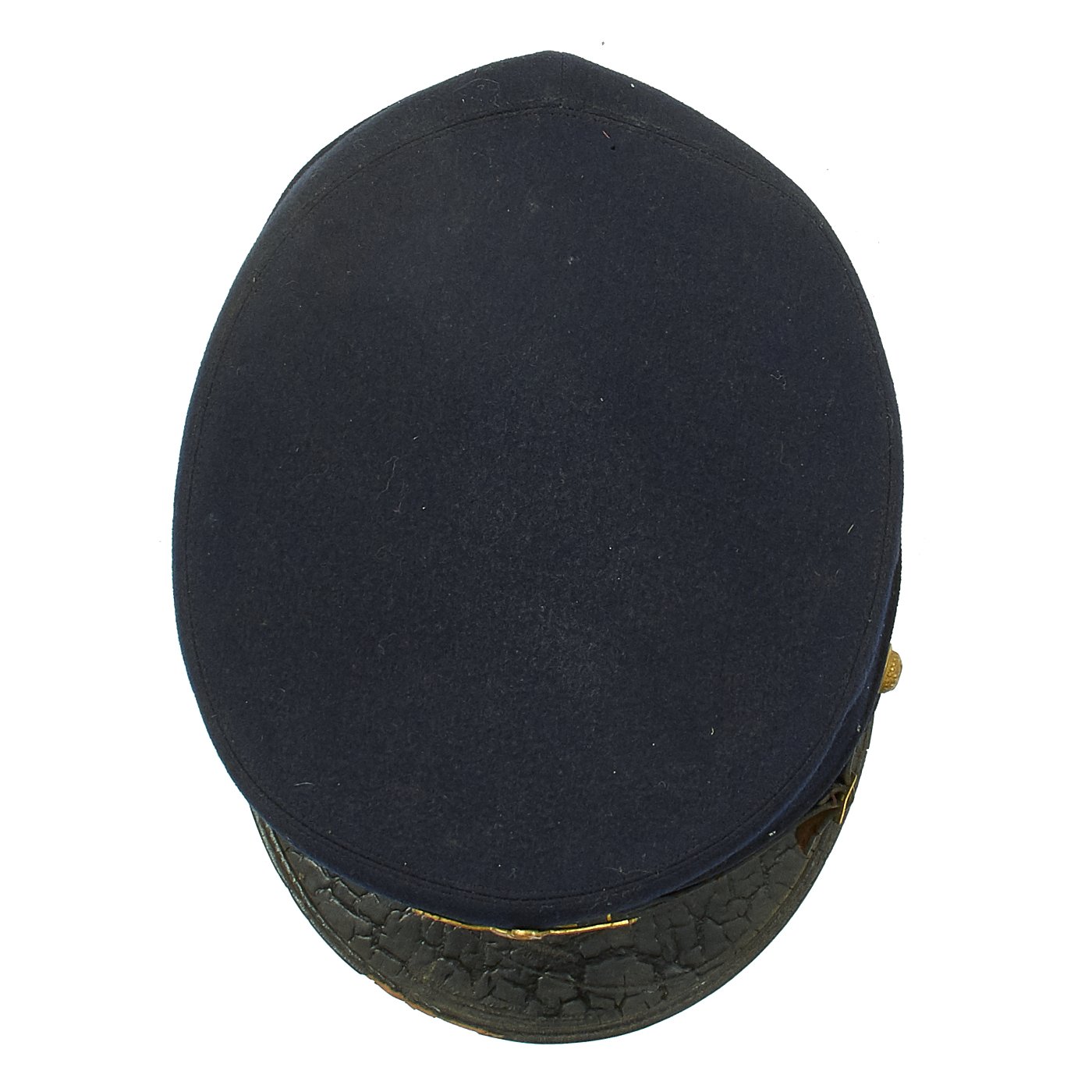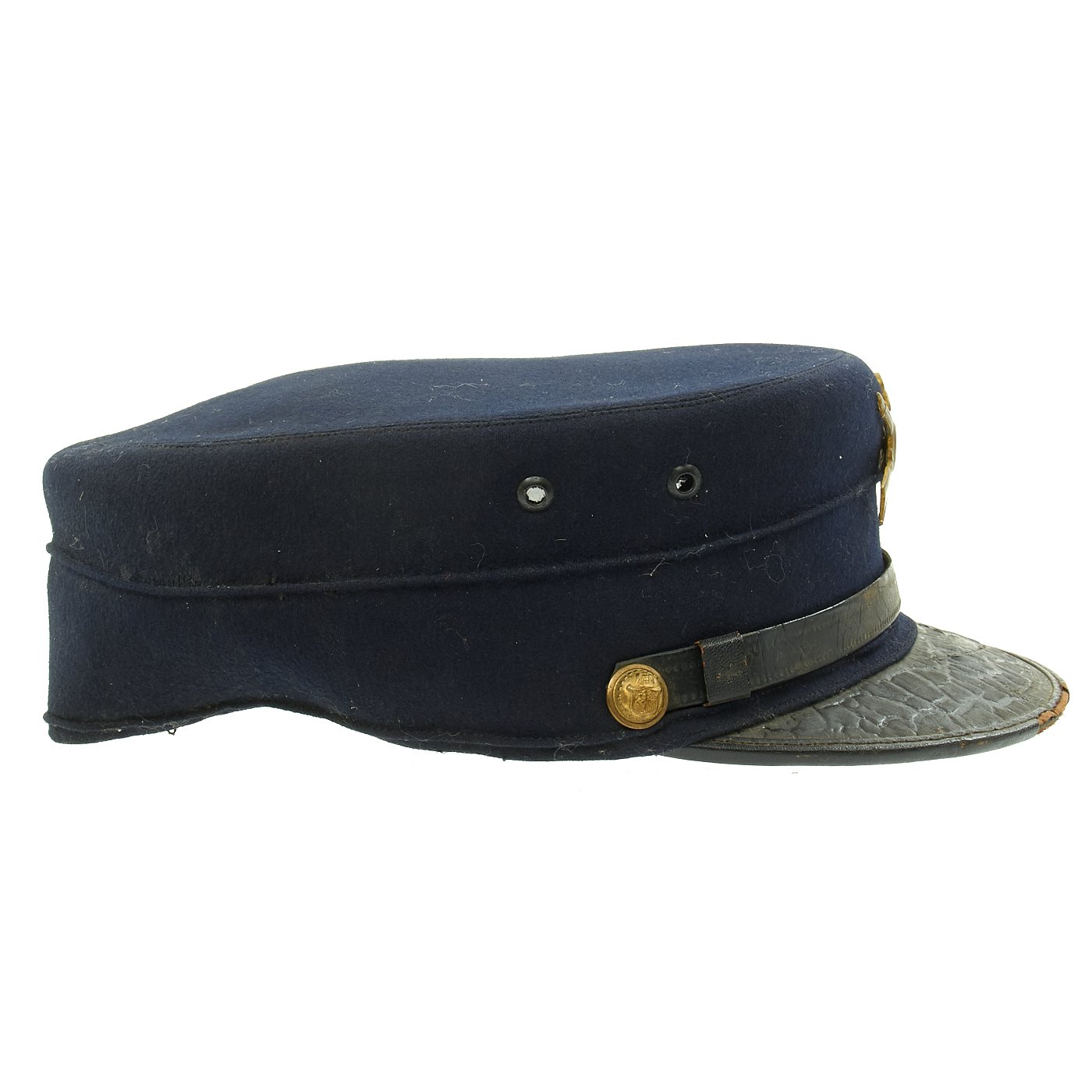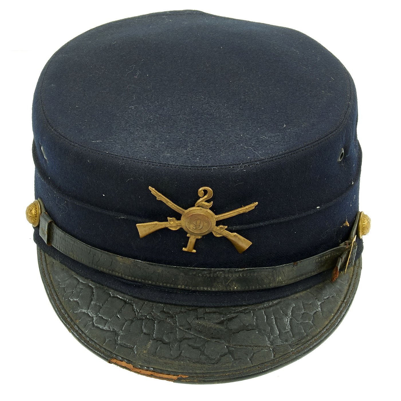 Original Item: Only One Available. This is a size 7 1/8 regulation M1895 enlisted forage cap. This was the U.S. Army's first transition to a visor cap after leaving the traditional kepi design. Made of dark blue wool with enameled leather visor bound with patent leather, and a tarred leather chinstrap. Hat retains original russet brown leather sweatband which is damaged in a few places. Inside of crown is lined with black silk and maker marked RIDABOCK & COMPANY, NEW YORK. Gold gilt federal regulation eagle buttons to the sides with "I" Company, 2nd Infantry insignia affixed. Cap is in overall good condition.