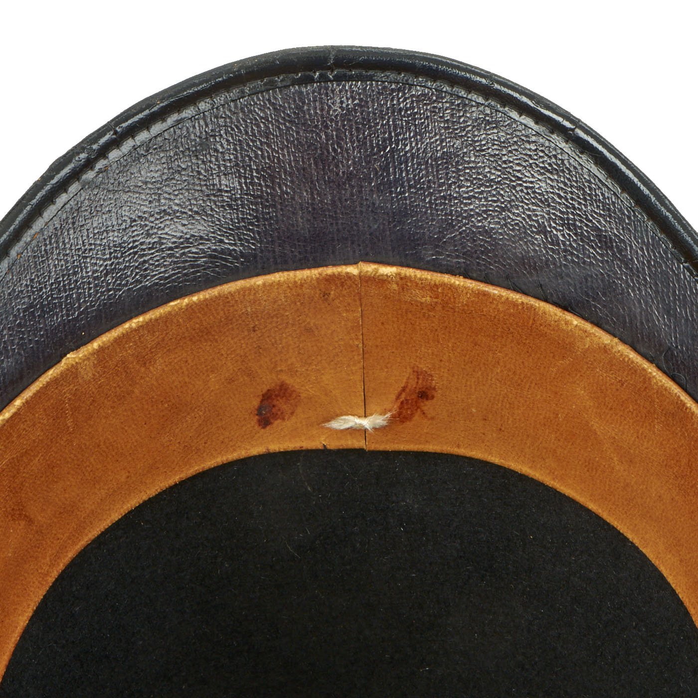 This United States Marine Corps USMC Officer's helmet is dated 1899 under the sweatband and is quite striking. This is not the type of helmet that was worn in the field, but instead one intended for use with the "dress" uniform for ceremonial occasions. It beautifully made from cork covered with black fabric and offered in truly excellent condition.