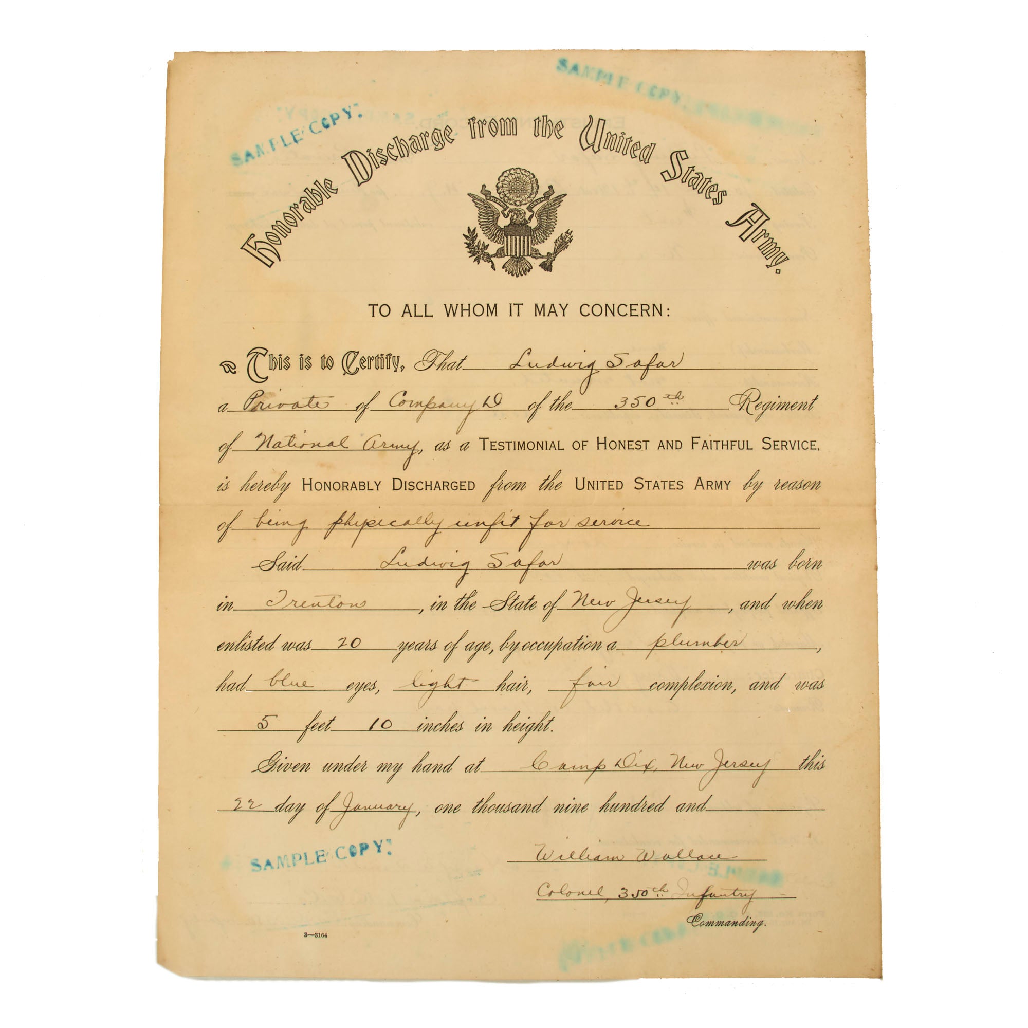 - “Sample Copy” WWI Era US Army Honorable Discharge Paperwork: The discharge is for Private Ludwig Safar of the 350th Regiment of “National Army”.