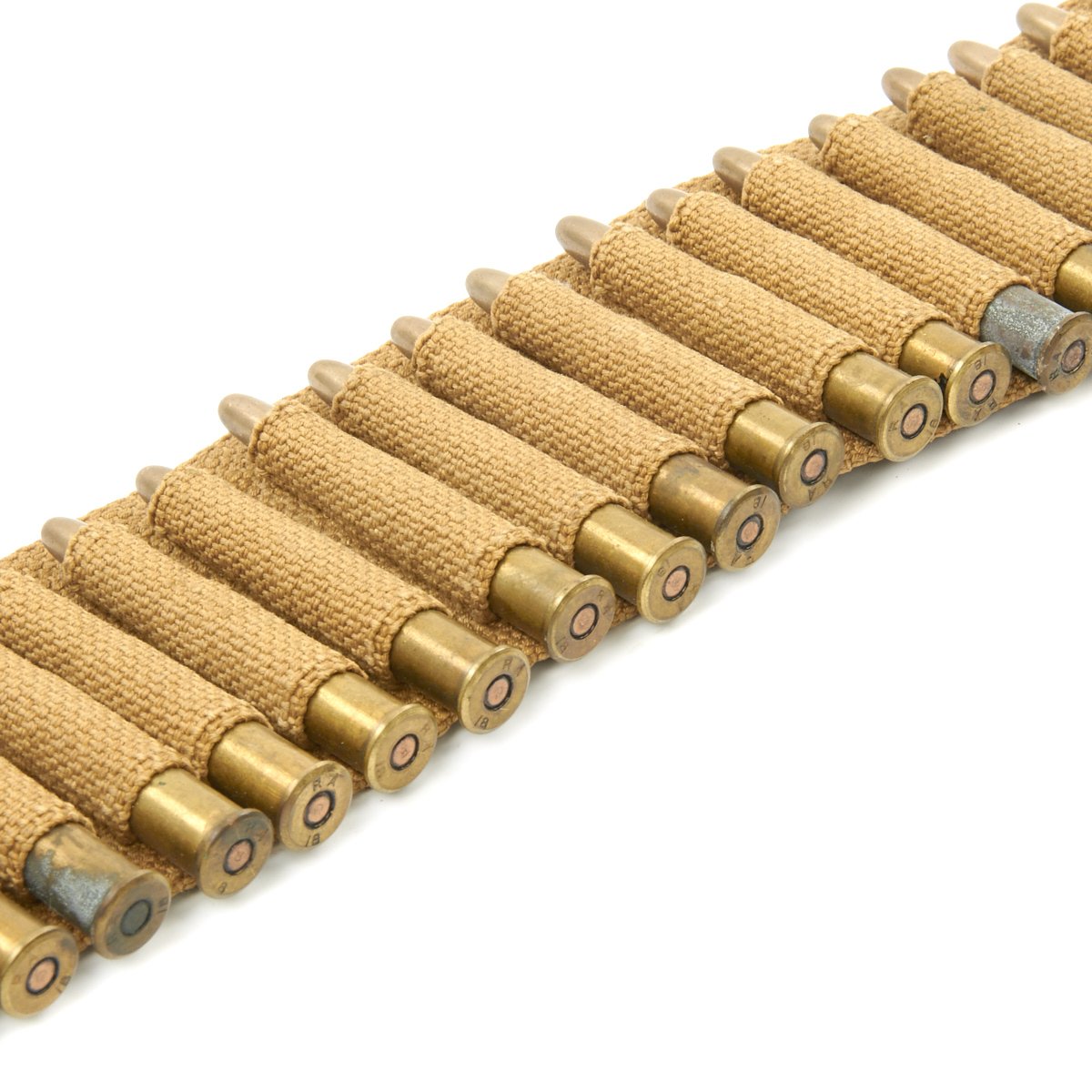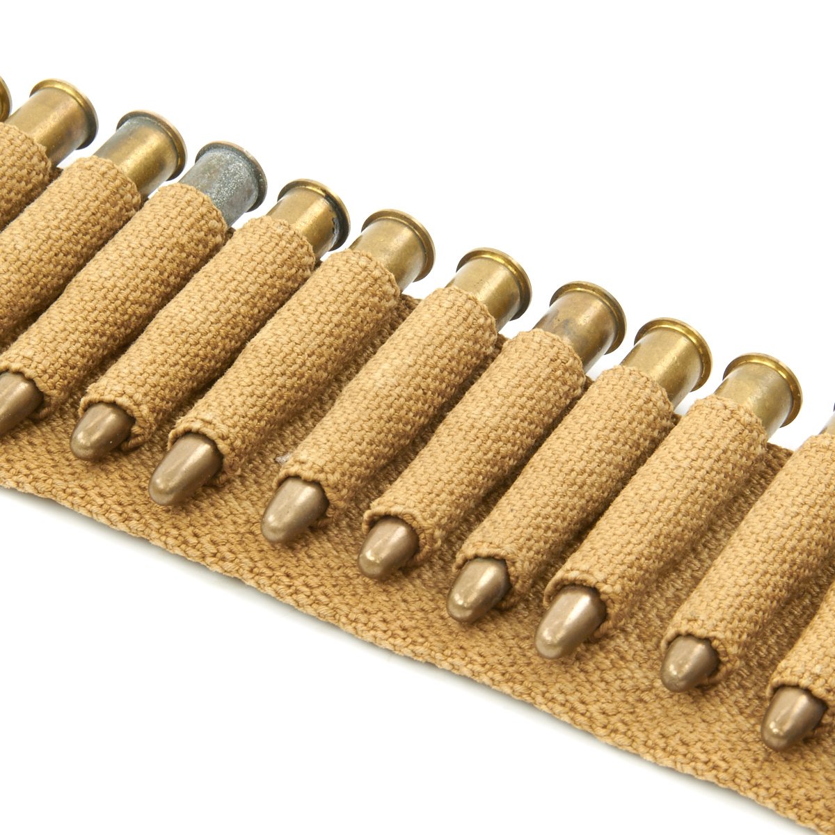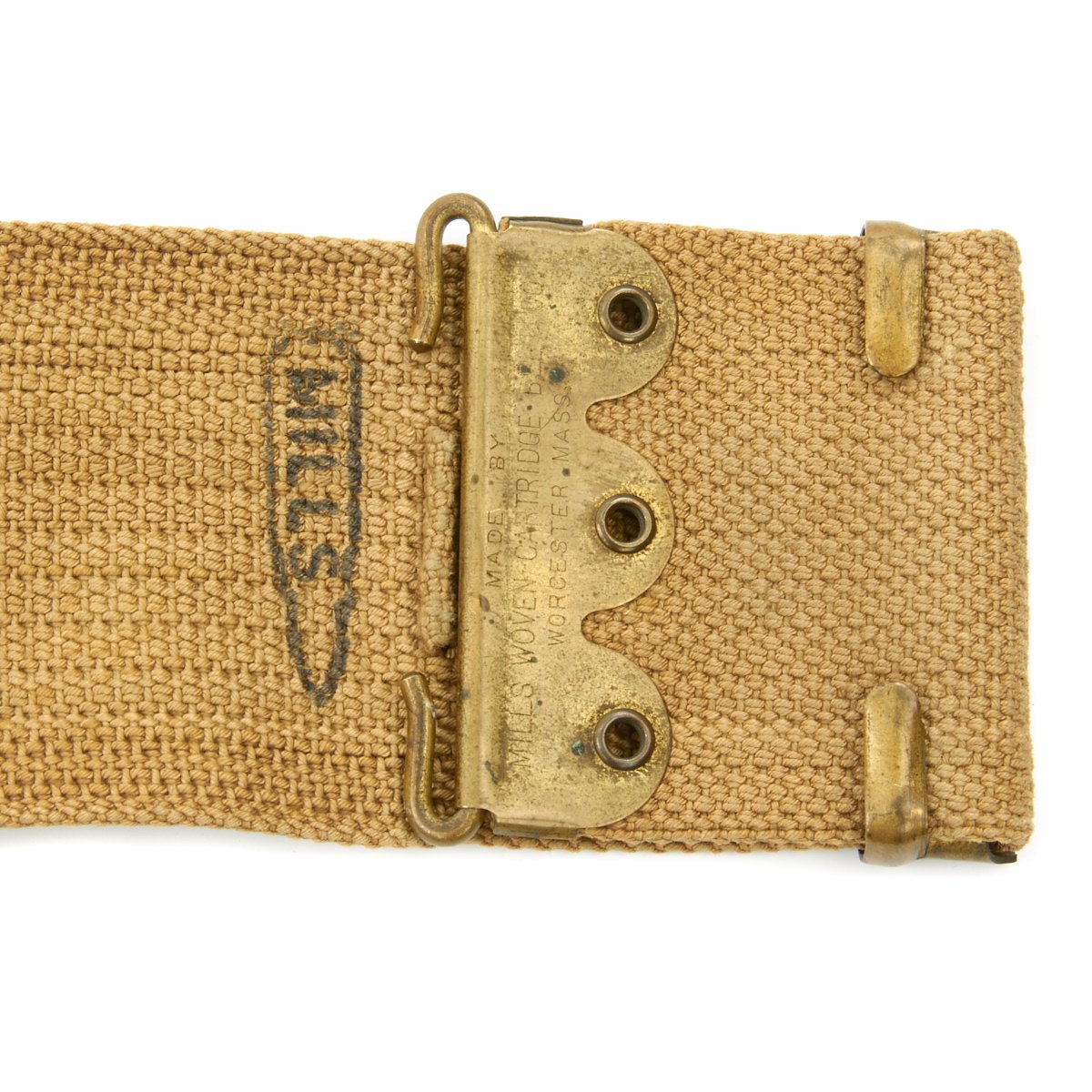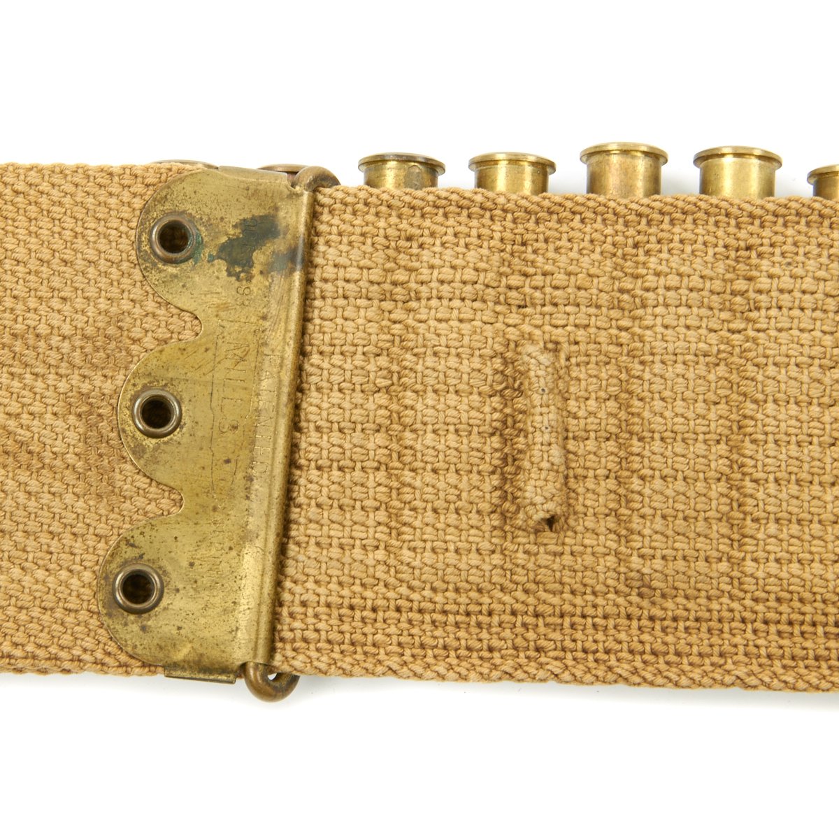 ANSON MILLS, PAT. FEB 1, 1881T. C. ORNDORFF SOLE MANF.WORCESTER MASSU.S.A.Belt is a khaki web material and has the single row for cartridges, will hold fifty 30/40 Krag cartridges. We include 50 inert rounds.