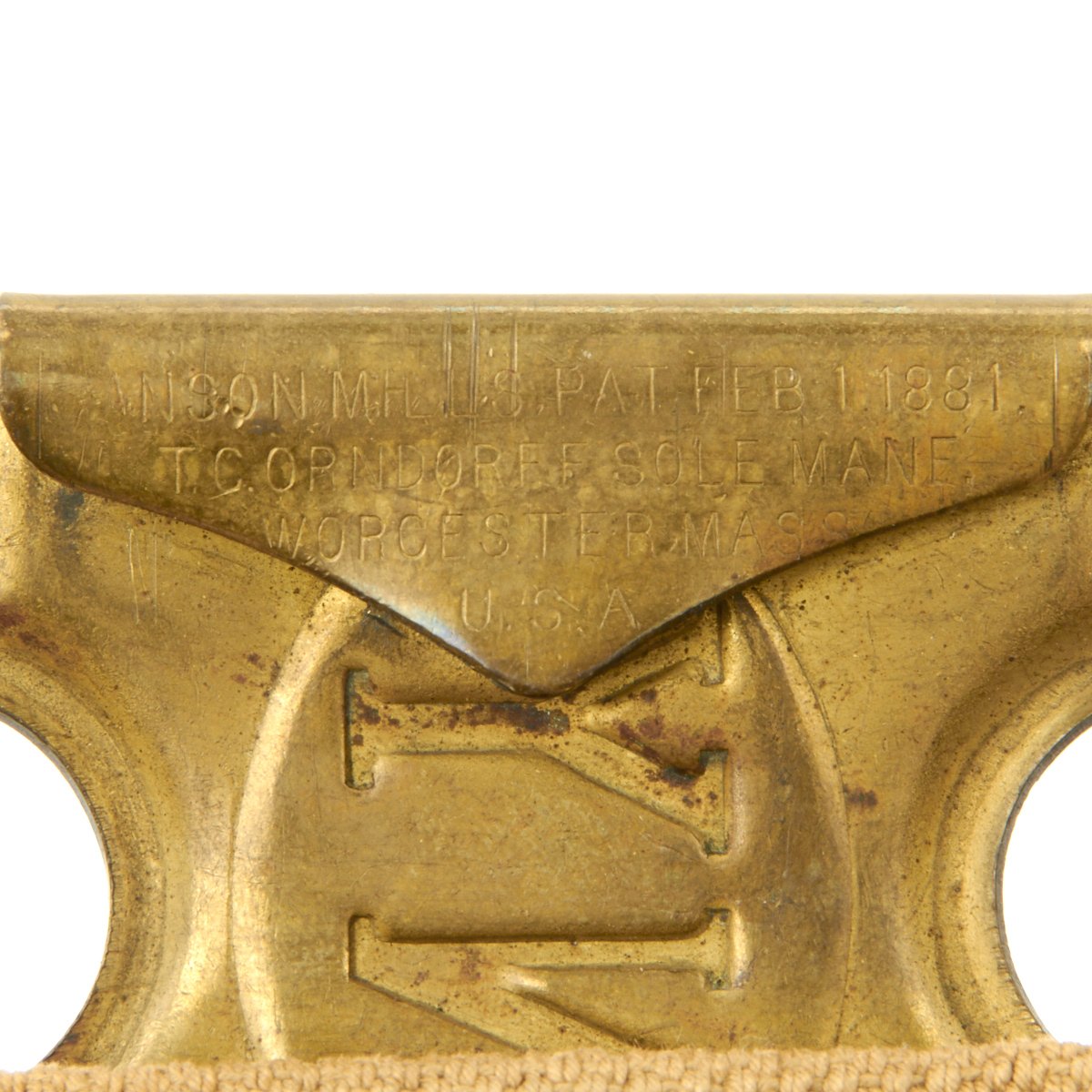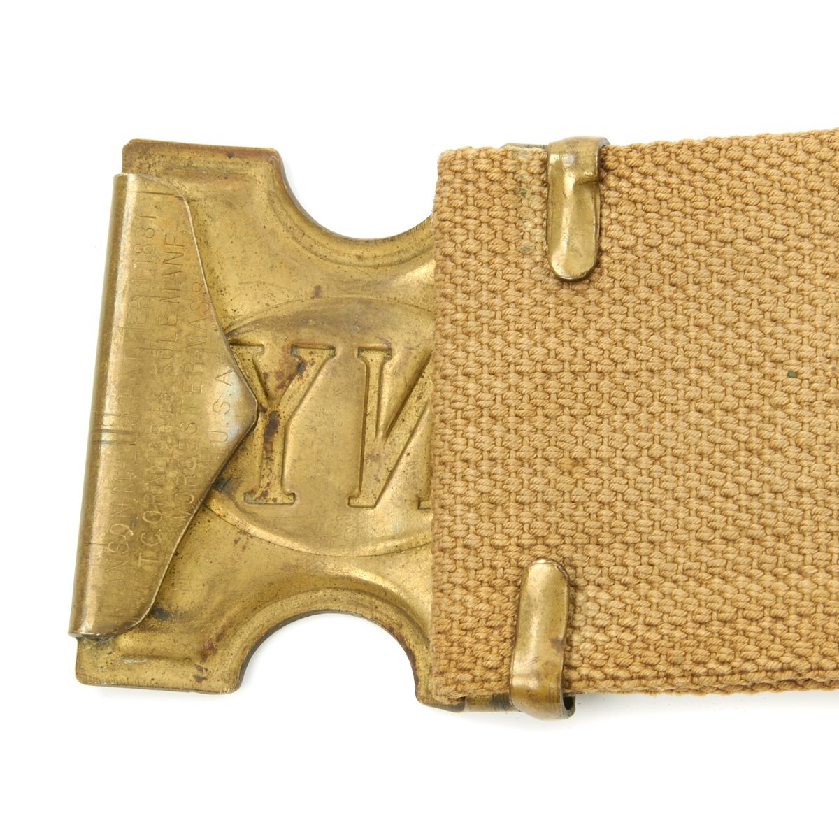 The web belt is soft and pliable and in fine condition with no rips, holes or fraying. Belt is set for 34 inches but can be adjusted for another 14 inches for a total of 48 inches. N. Y. plate is illustrated in the book "American Military Plates" by Michael O'Donnell and J. Duncan on page 570 plate #960 "WAIST BELT PLATE MILLS 1887 PATTERN N. Y. ENLISTED ca: 1890-1905". THE N. Y. PLATE IS ALSO PICTURED ON PAGE 563 ON A BUGLER ON FIELD DUTY WEARING A MILLS CARTRIDGE BELT.