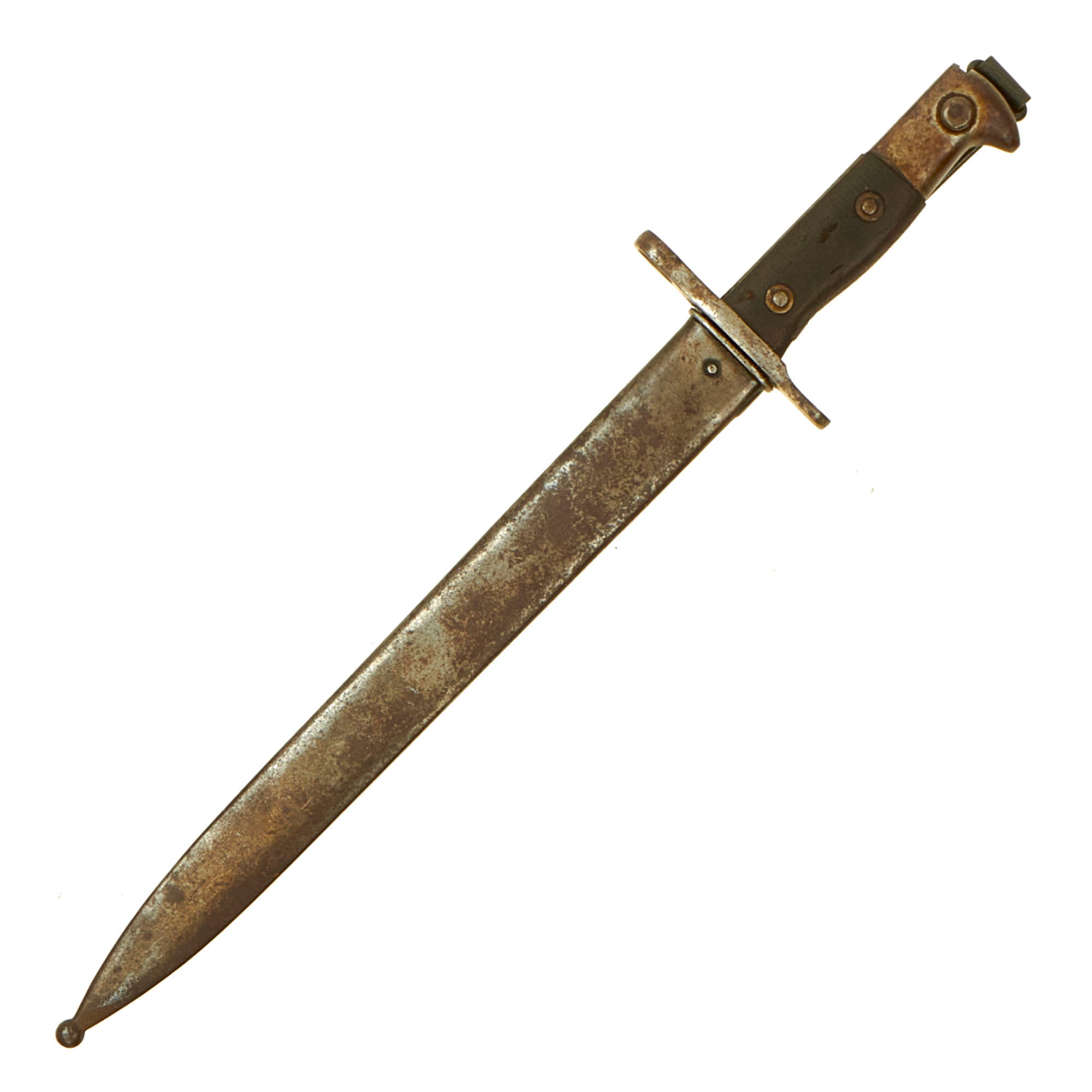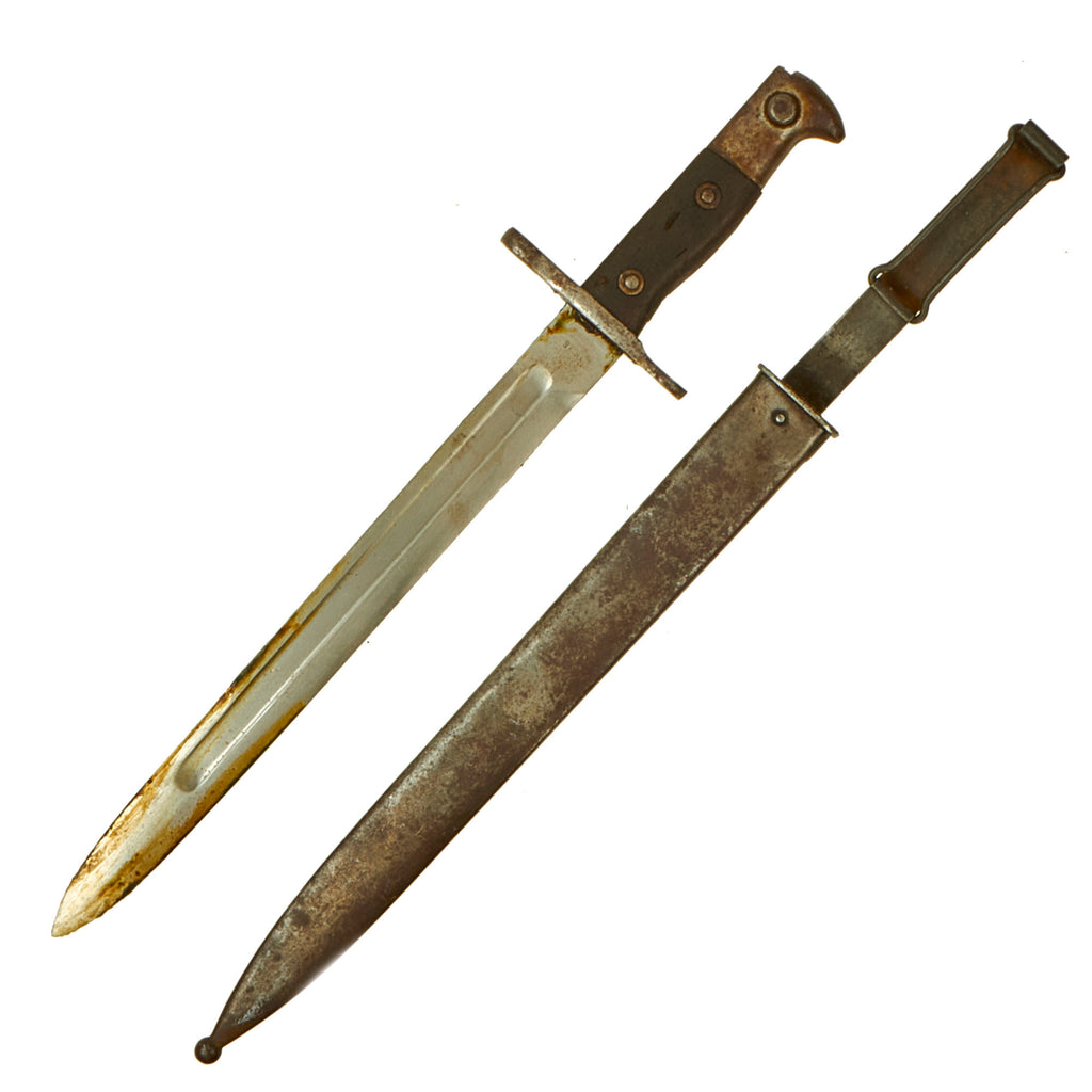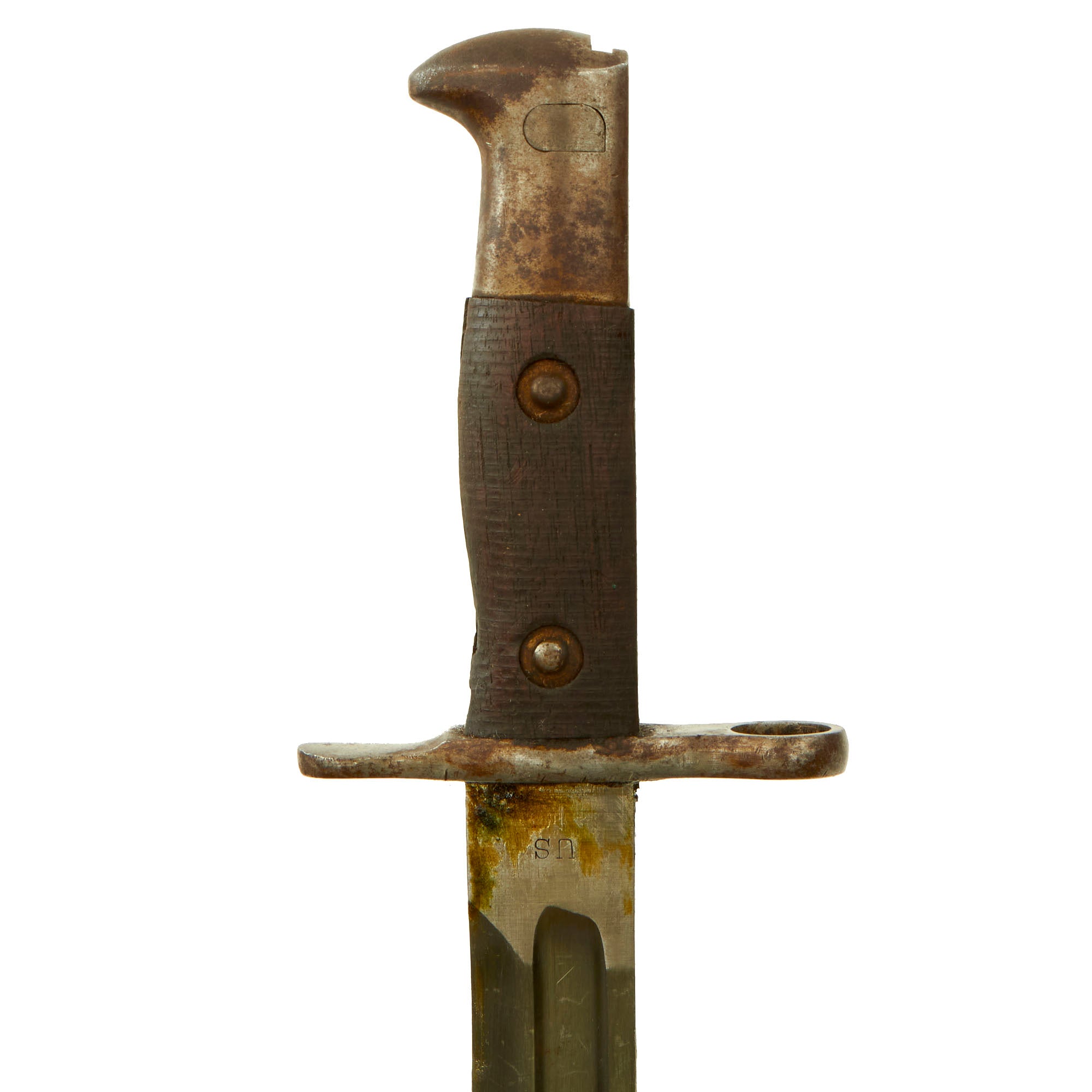 Original Item: Only One Available. These are something that we have only ever had very few of but appear to be making a comeback! It is a Pre WWI, Spanish-American War dated U.S. M1892 bayonet, made for the Springfield Model 1892–99 Krag-Jørgensen rifles, some of which were still in use during WWI. It is fitted with its original all steel scabbard with a swivel belt loop on the back. These are very rarely seen on today's market, especially with the scabbard included and fully intact.
