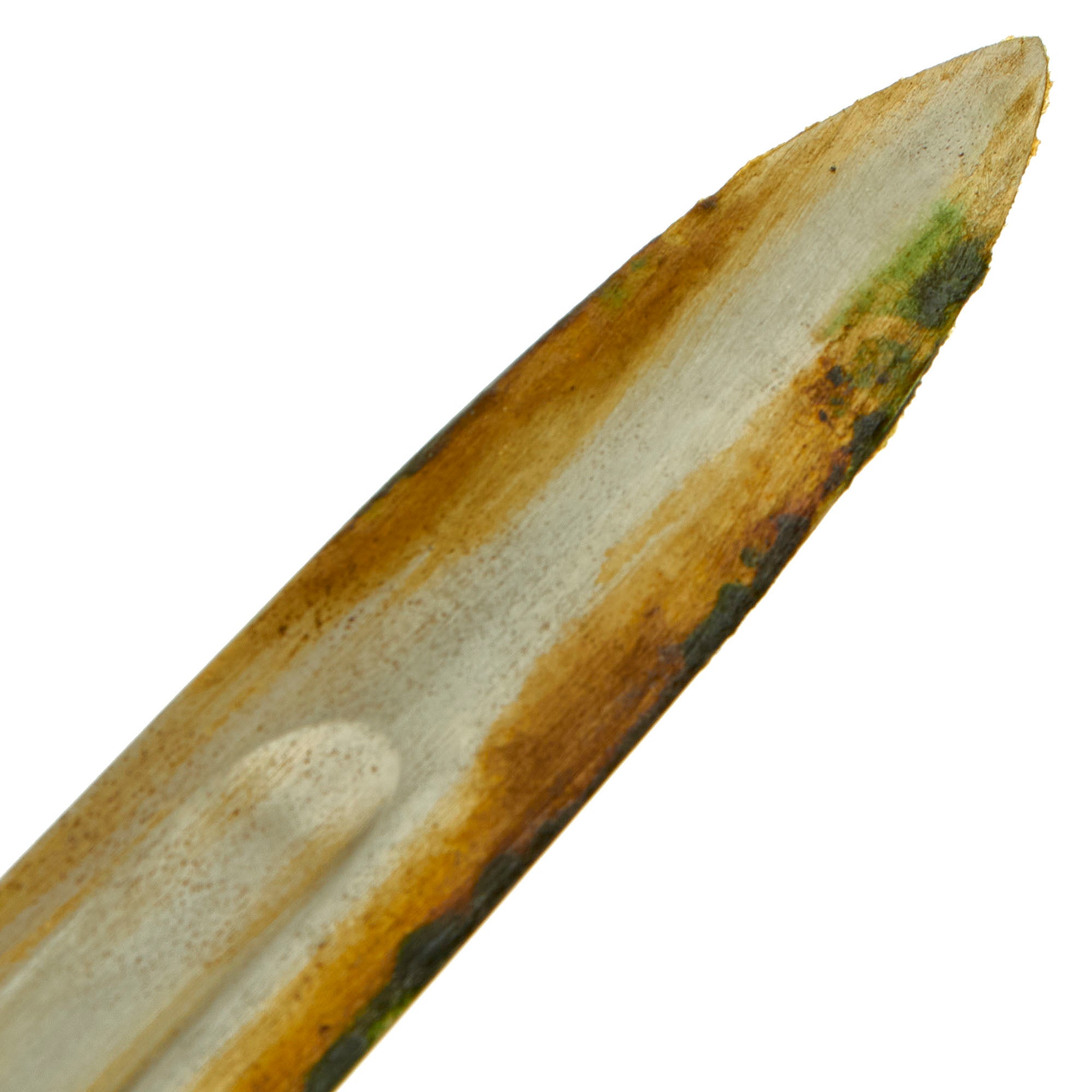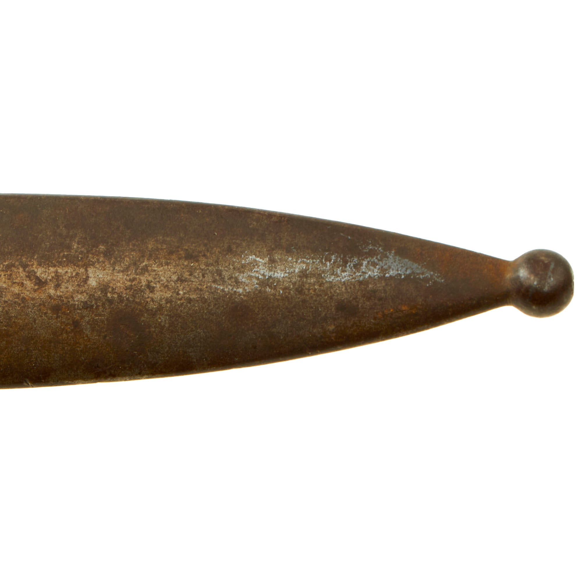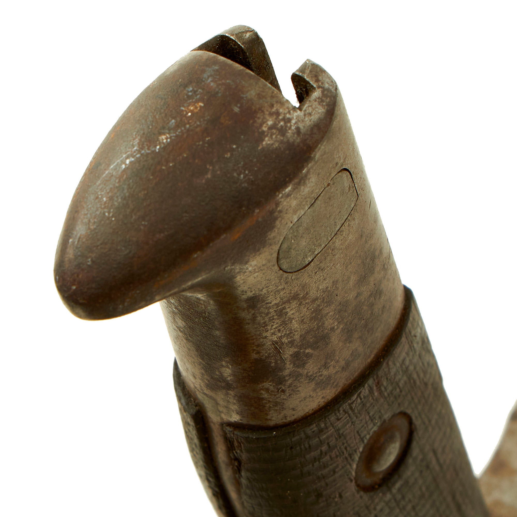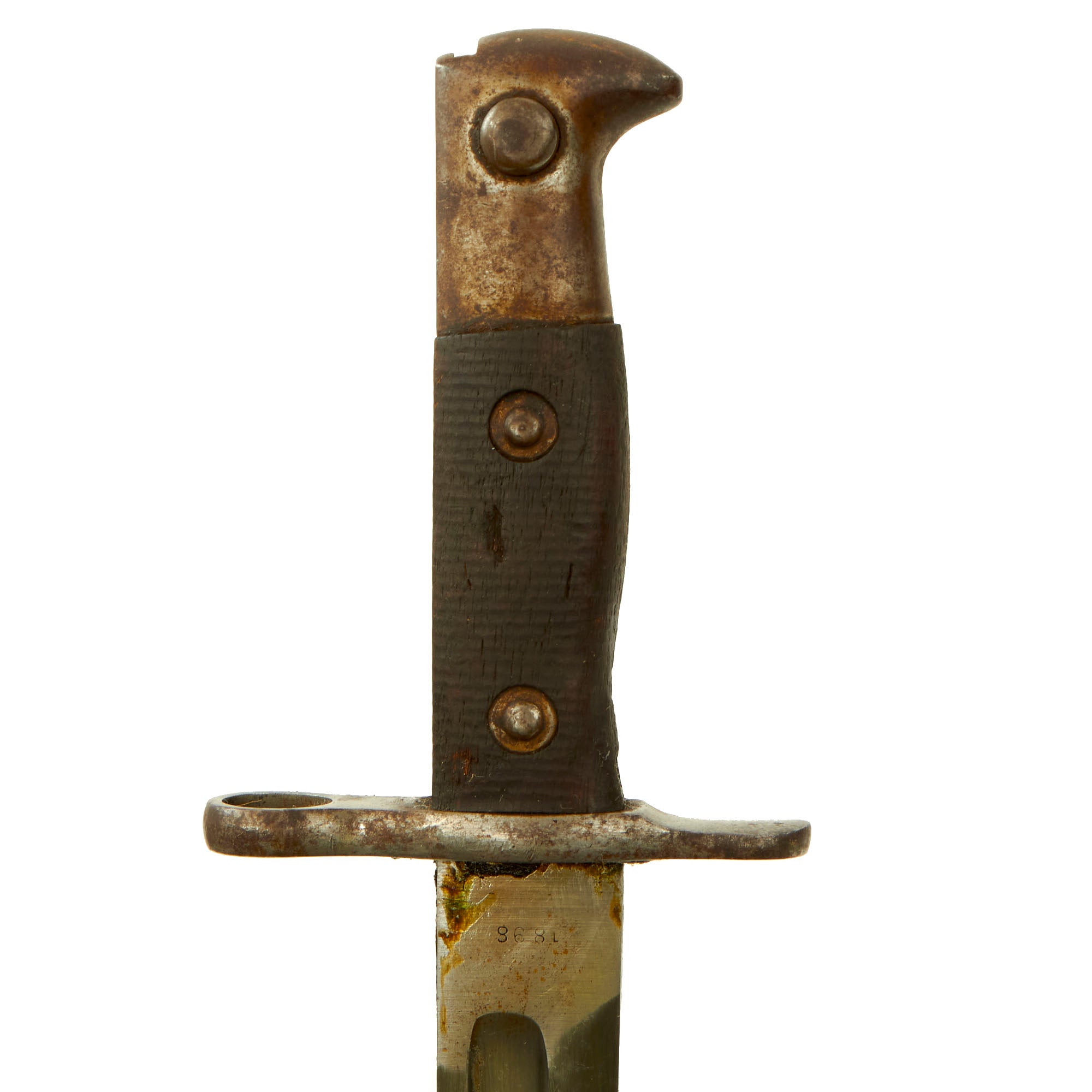 This example is in good condition, with the original bright finish oxidized to a gray coloration. Blade shows signs of sharpening, and of honest use, most likely in a tropical environment with finish loss. There is still grease present on the blade from long storage. The 1892 pattern ribbed grips are in good condition with just a few dents and chips, and are held in place by domed rivets. The wood does show some wear and open grain.