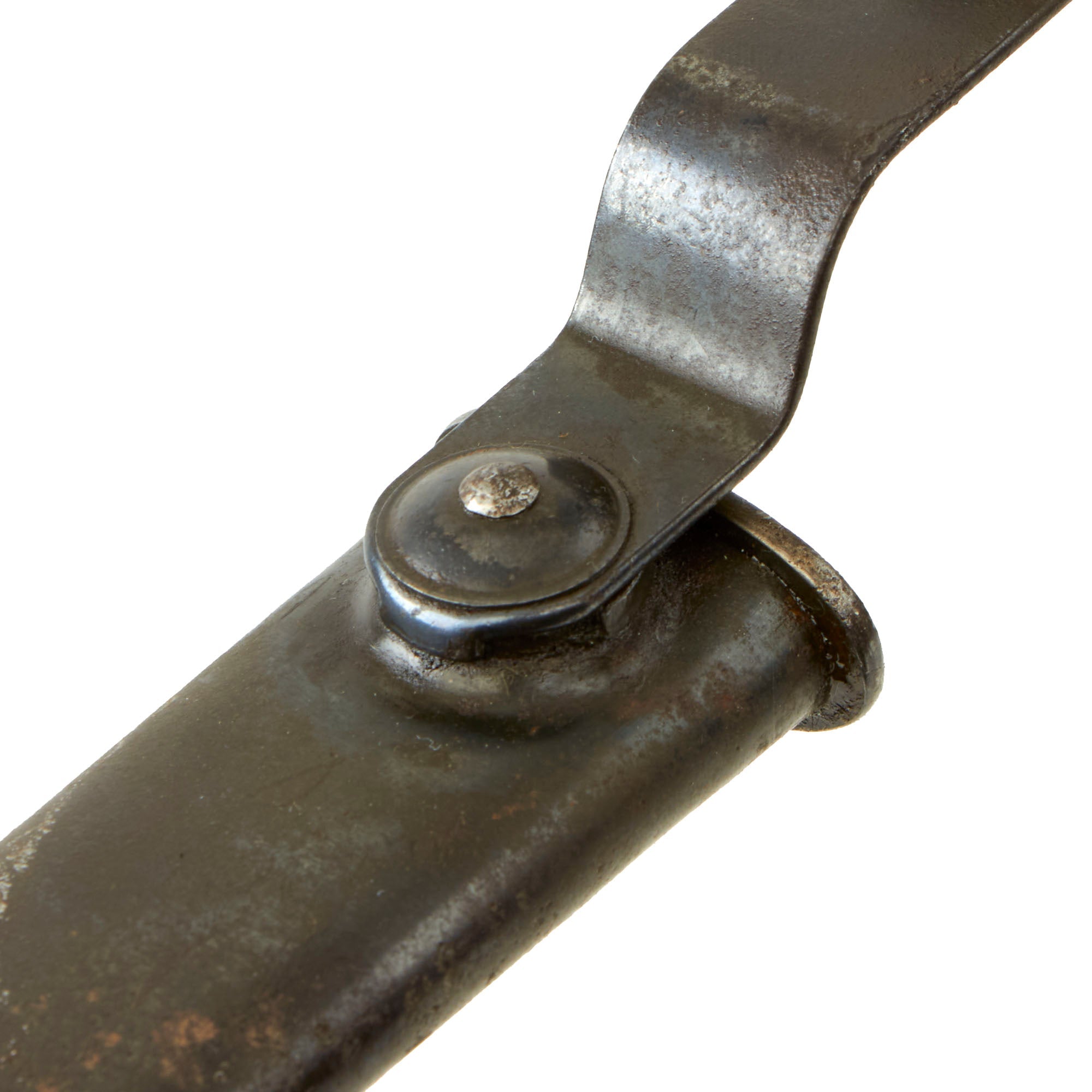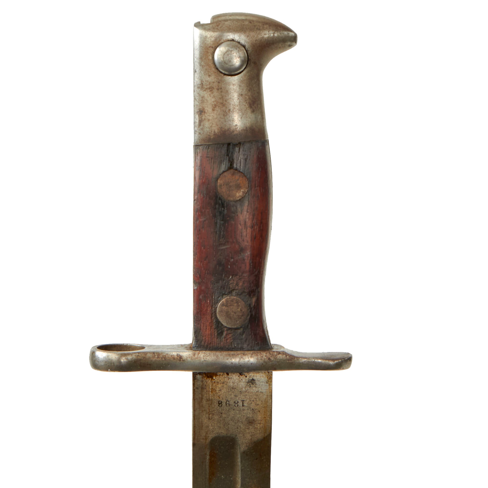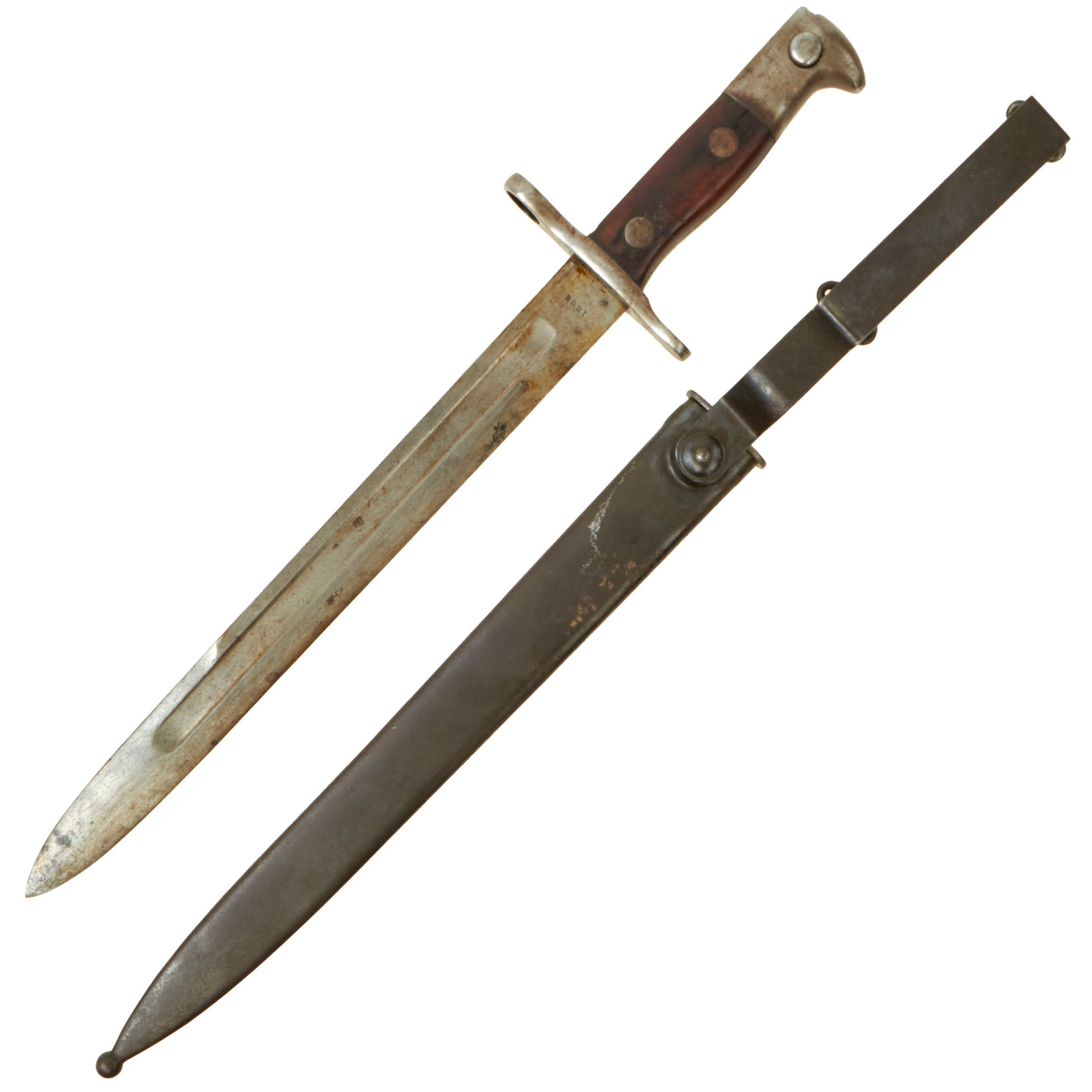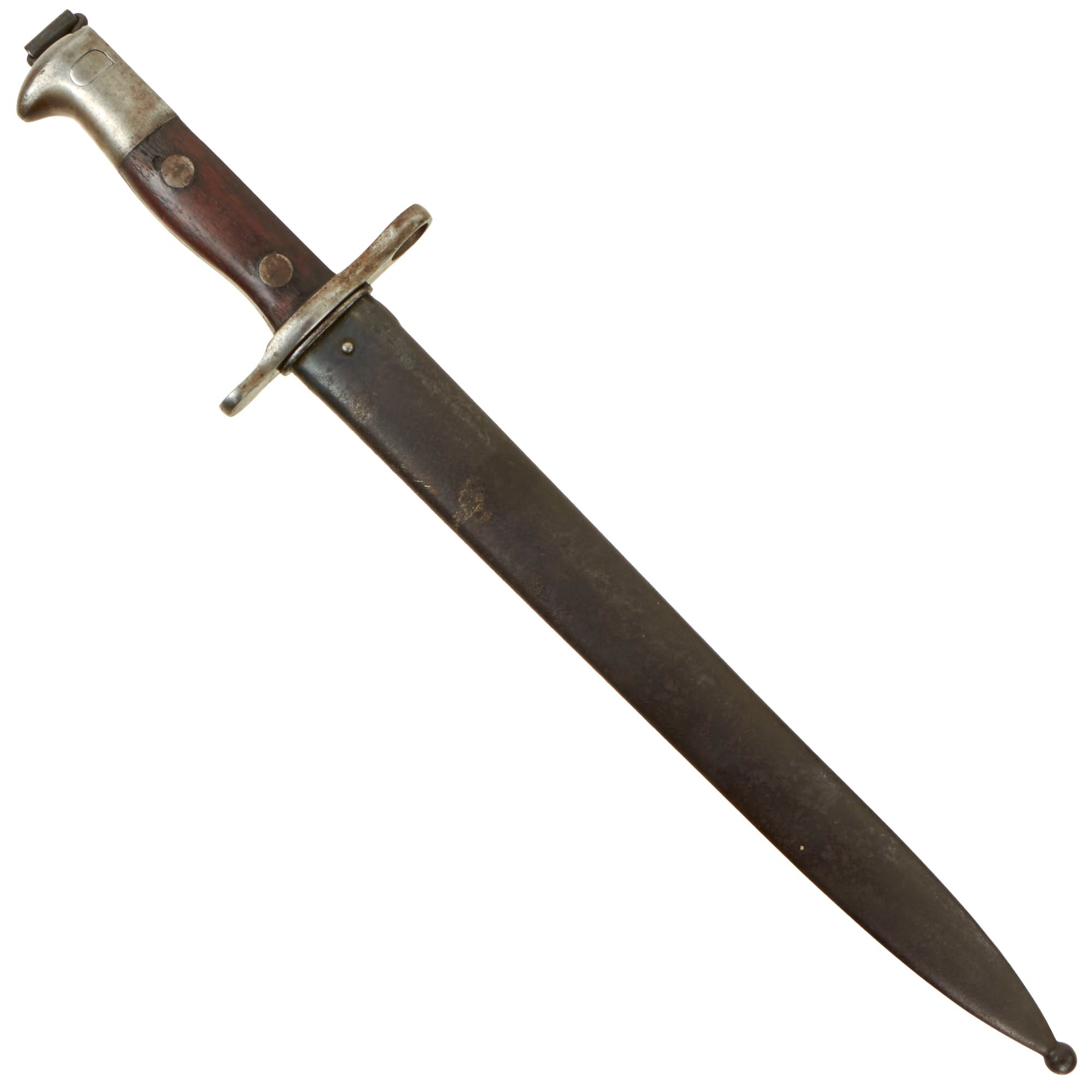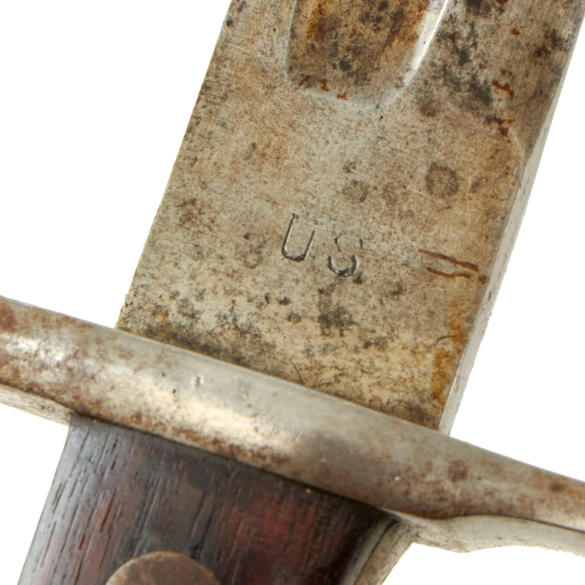 Original Item: Only One Available. These are something that we have only ever had very few of. It is a Spanish-American War dated U.S. M1892 bayonet, made for the Springfield Model 1892–99 Krag-Jørgensen rifles, some of which were still in use during WWI. It is fitted with its original all steel scabbard with a swivel belt loop on the back. These are very rarely seen on today's market, especially with the scabbard included and fully intact.