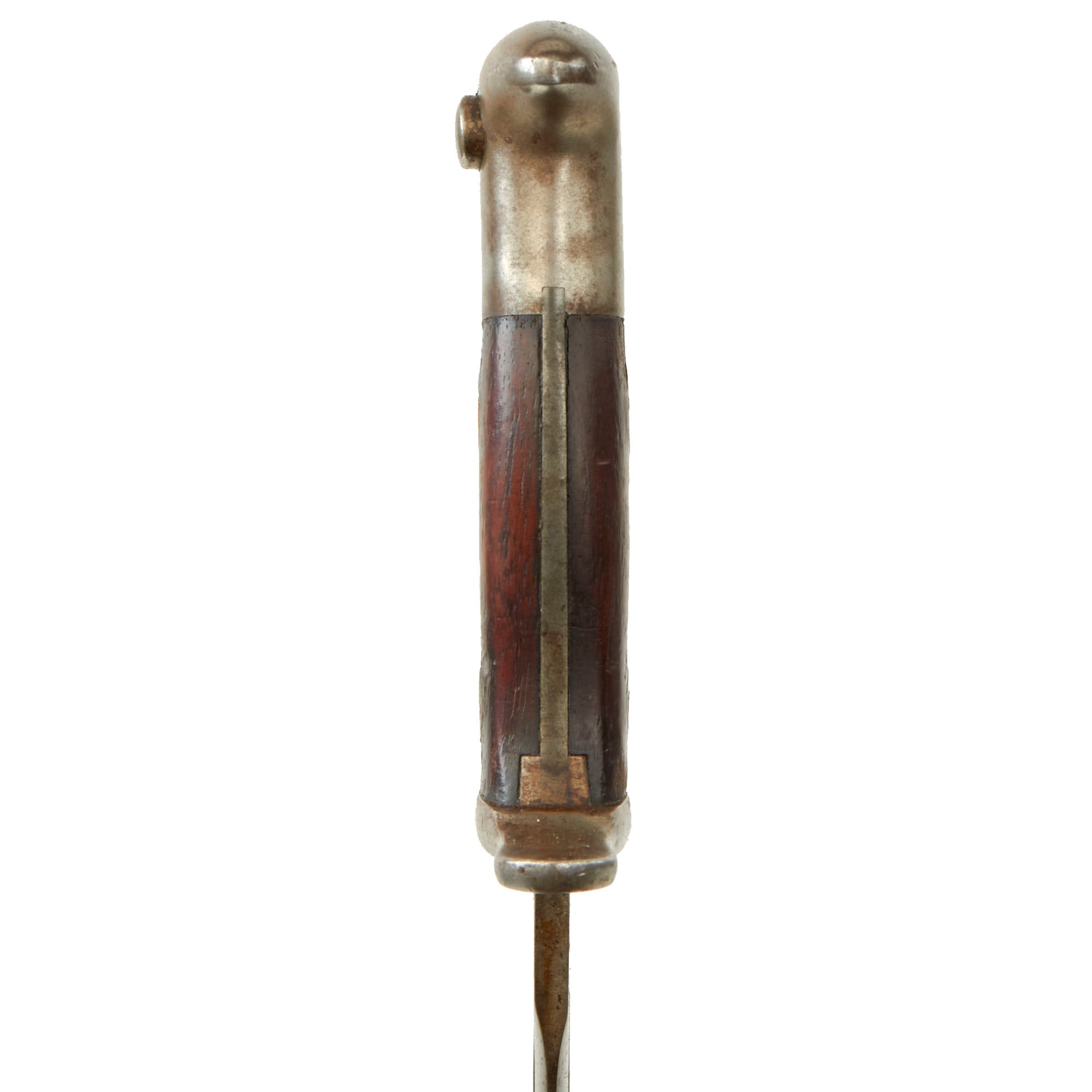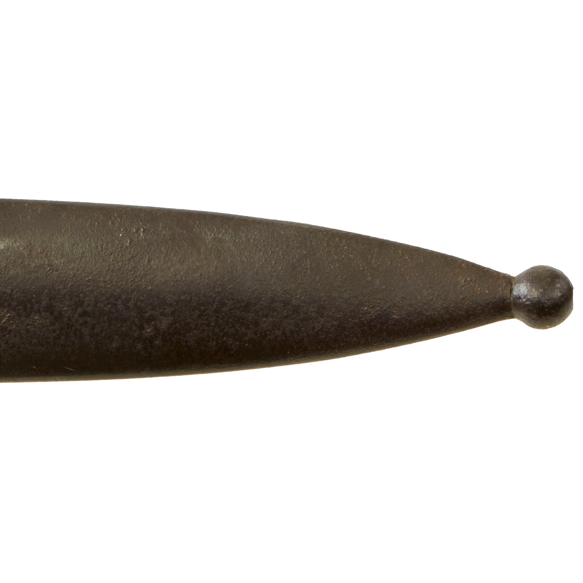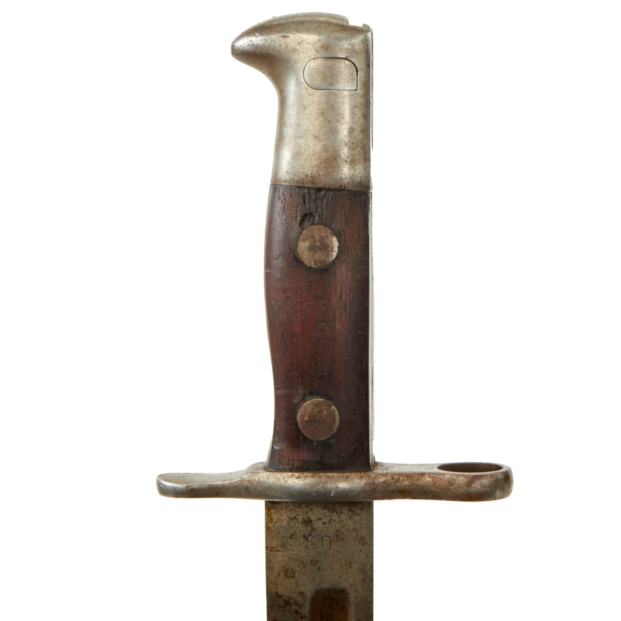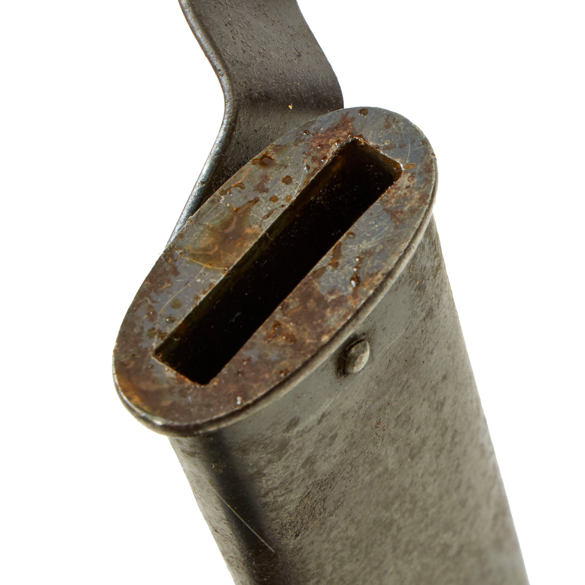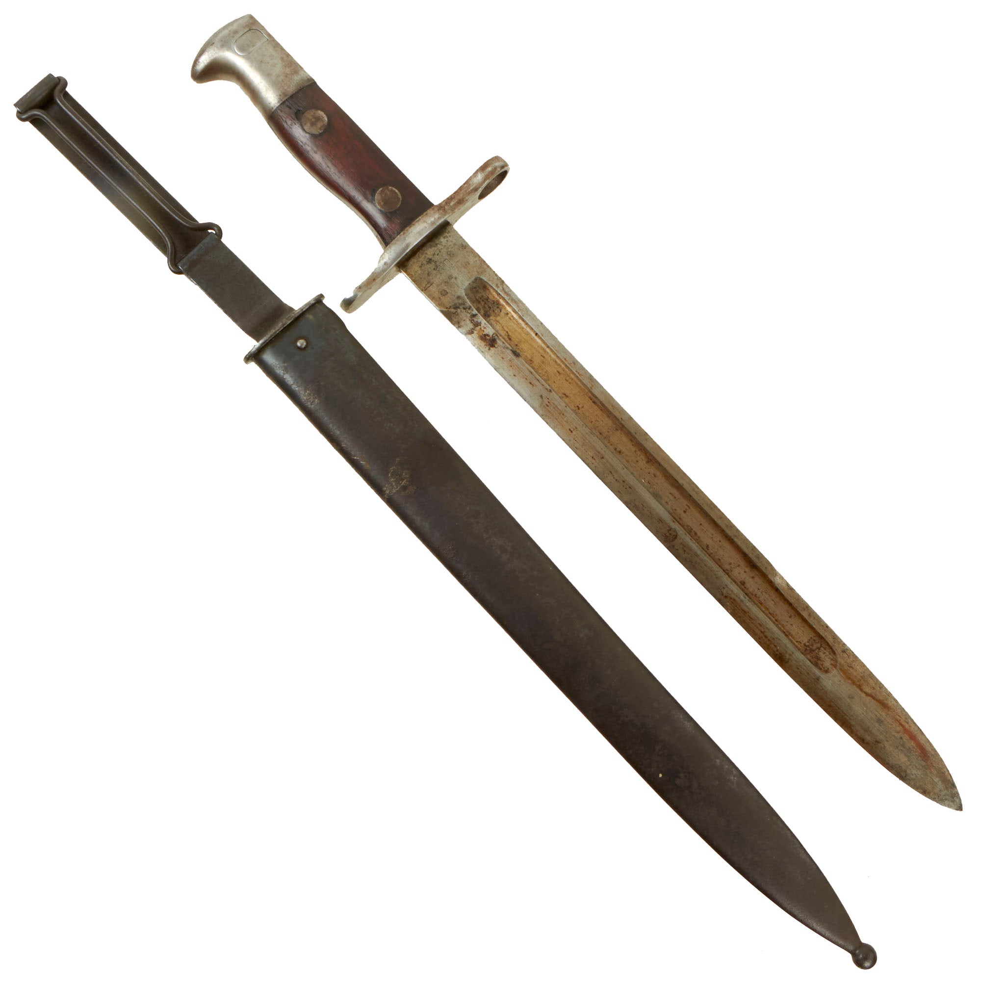 Original Item: Only One Available. These are something that we have only ever had very few of. It is a Spanish-American War dated U.S. M1892 bayonet, made for the Springfield Model 1892–99 Krag-Jørgensen rifles, some of which were still in use during WWI. It is fitted with its original all steel scabbard with a swivel belt loop on the back. These are very rarely seen on today's market, especially with the scabbard included and fully intact.