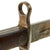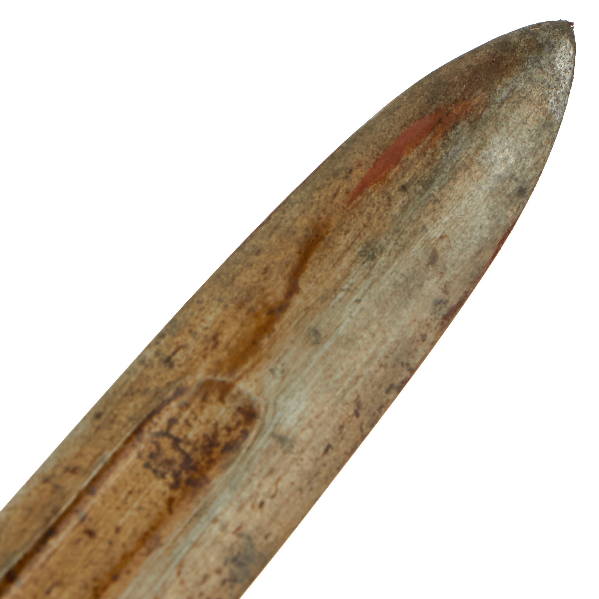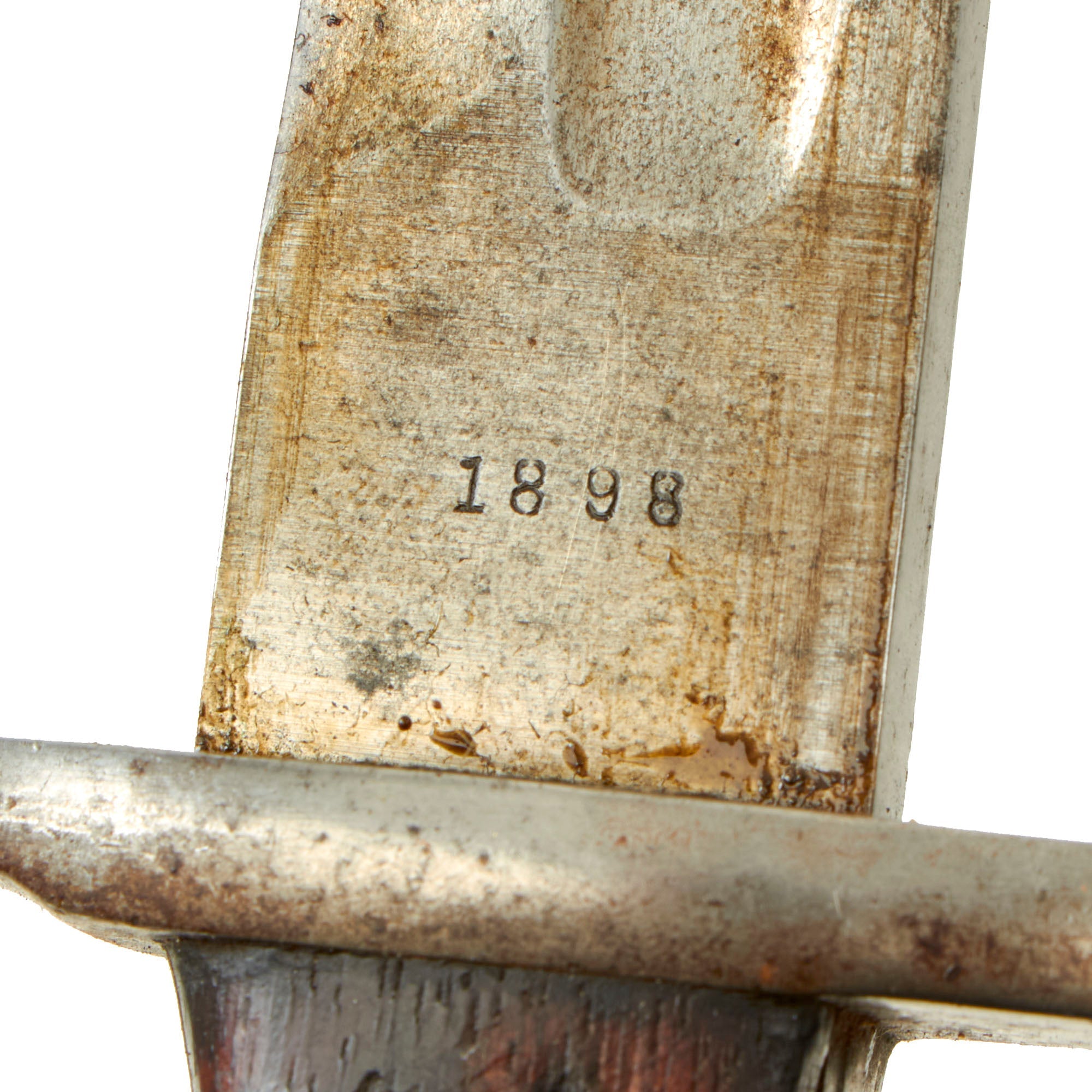 The blade retains its original patina and has not been cleaned or refinished. The blade is marked 1898 on one side and US on the reverse. The wooden grips of the handle show some damage on both sides as shown. The scabbard is still in good working condition with very light pitting. The bayonet catch is still fully functional, as well as the swivel on the scabbard.