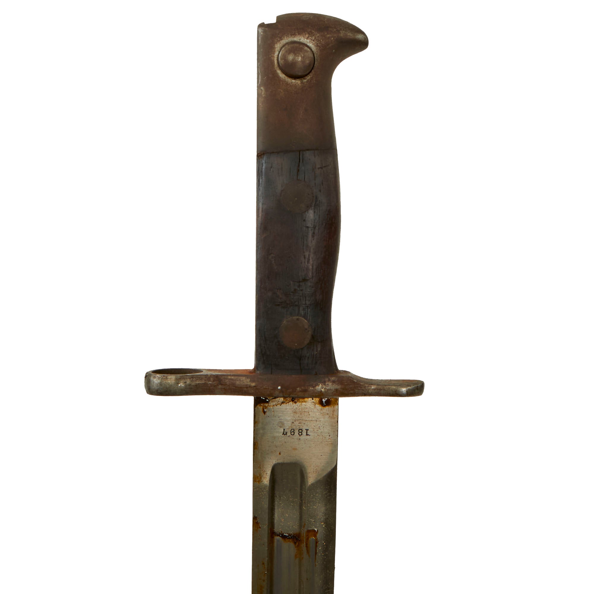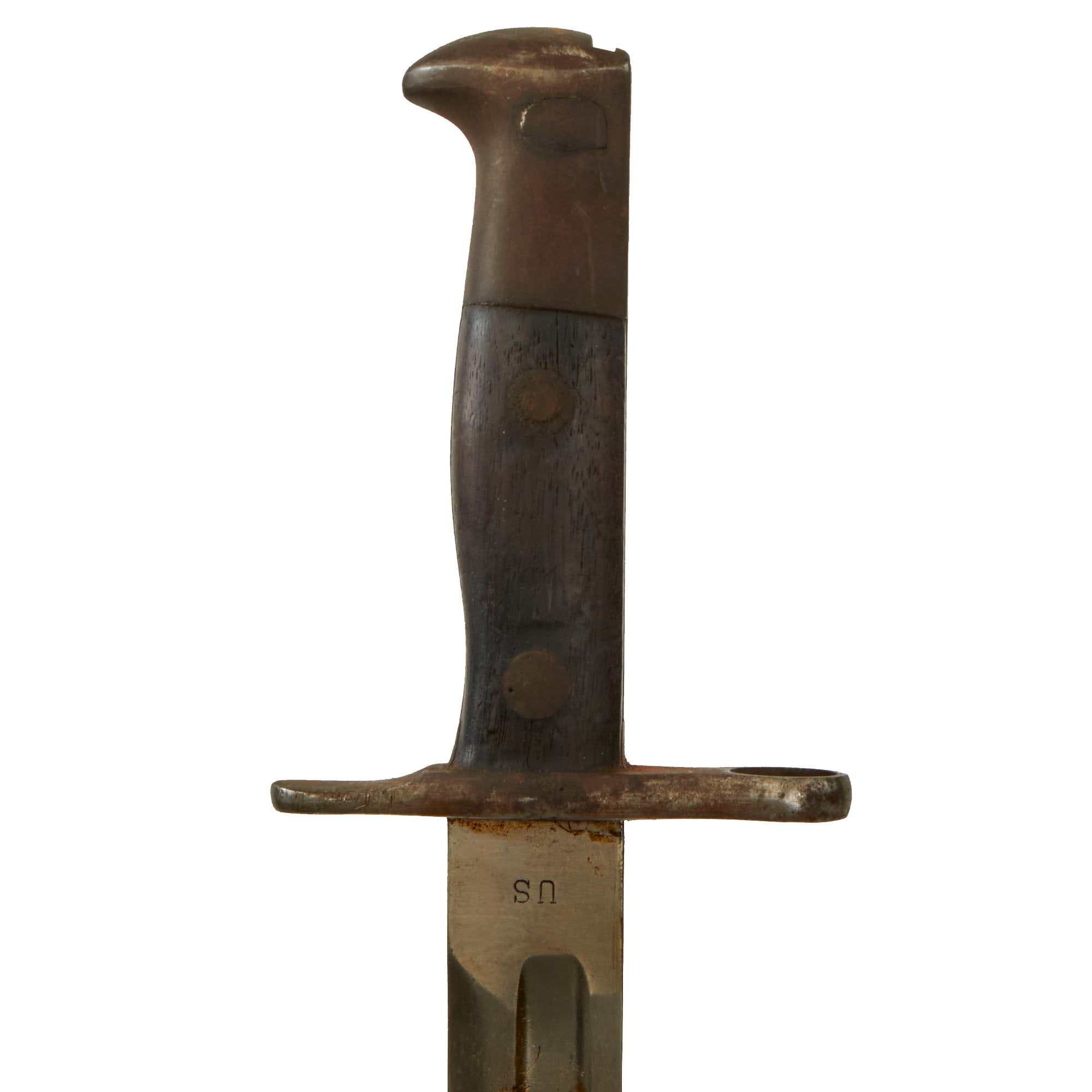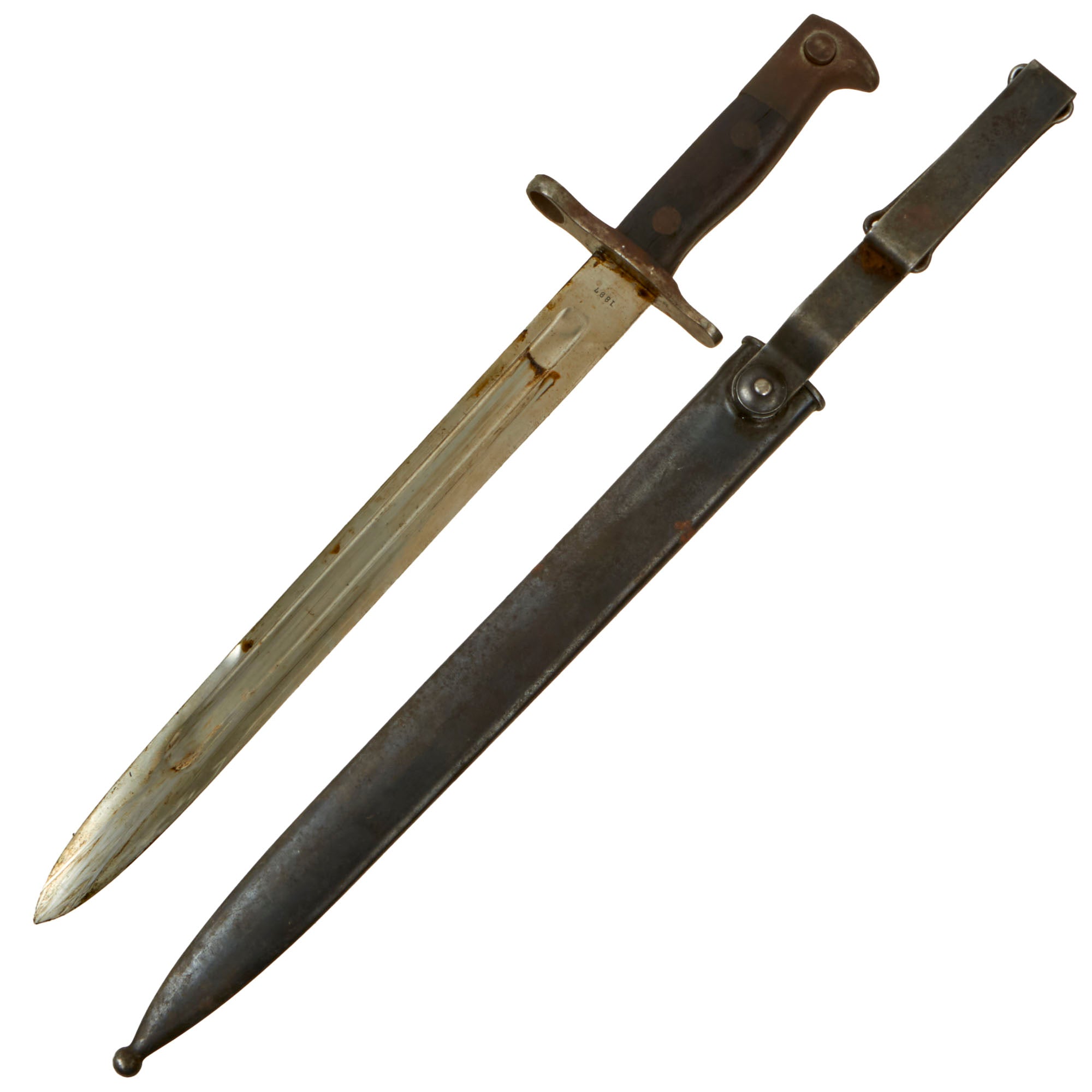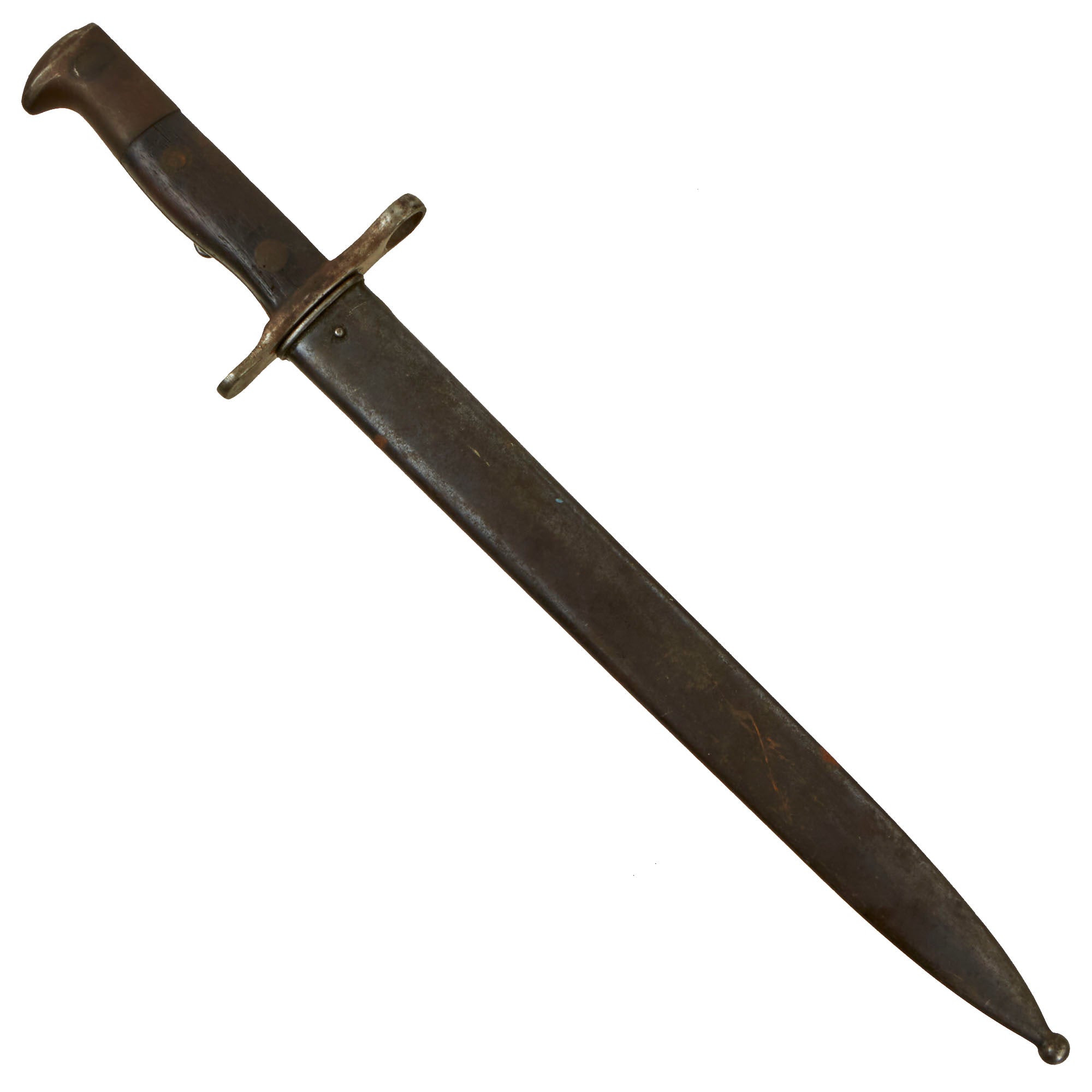 Original Item: Only One Available. This is a great example of a Spanish-American War dated U.S. M1892 bayonet, made for the Springfield Model 1892–99 Krag-Jørgensen rifles, some of which were still in use during WWI. It is fitted with its original all steel scabbard with a swivel belt loop on the back. These are very rarely seen on today's market, especially with the scabbard included and fully intact.