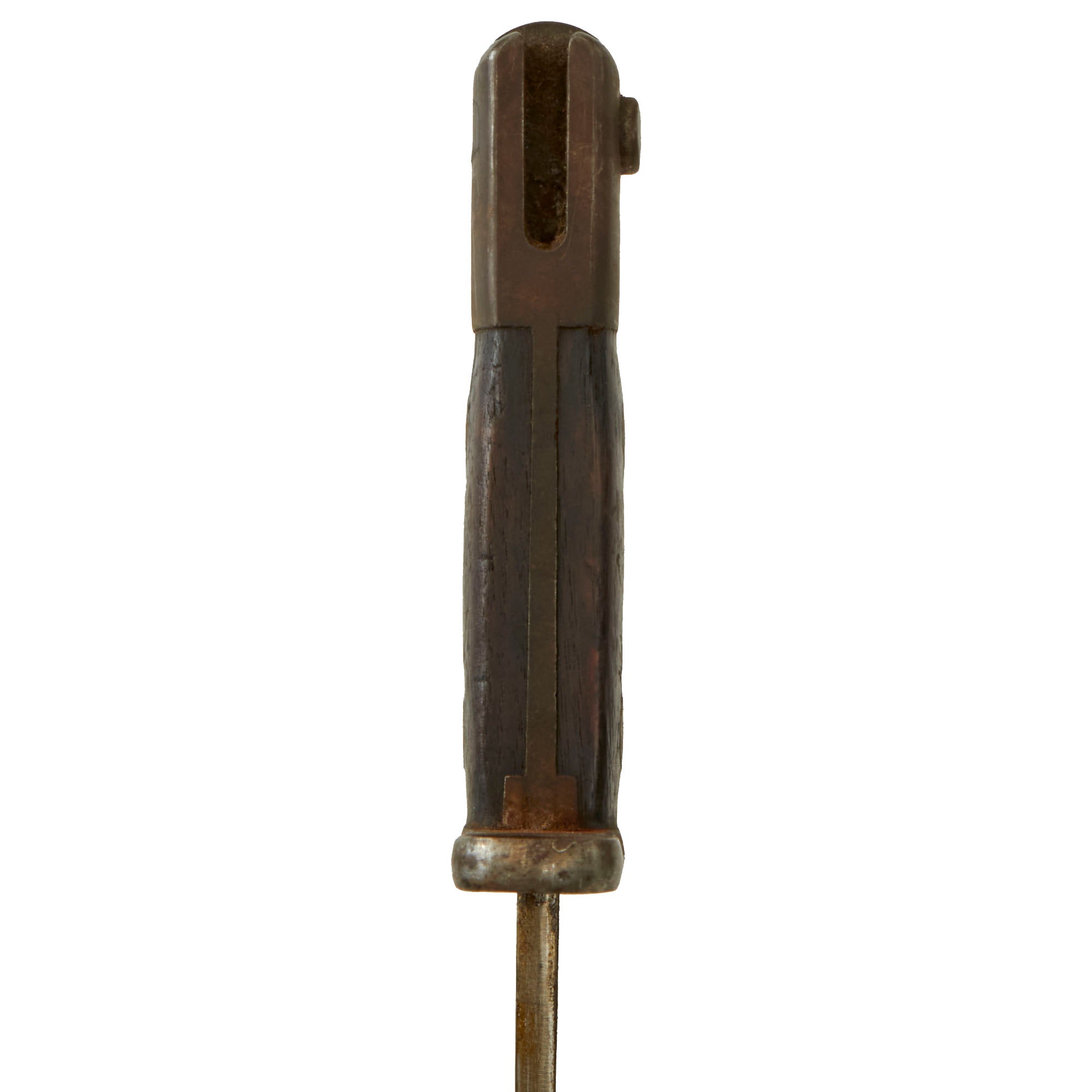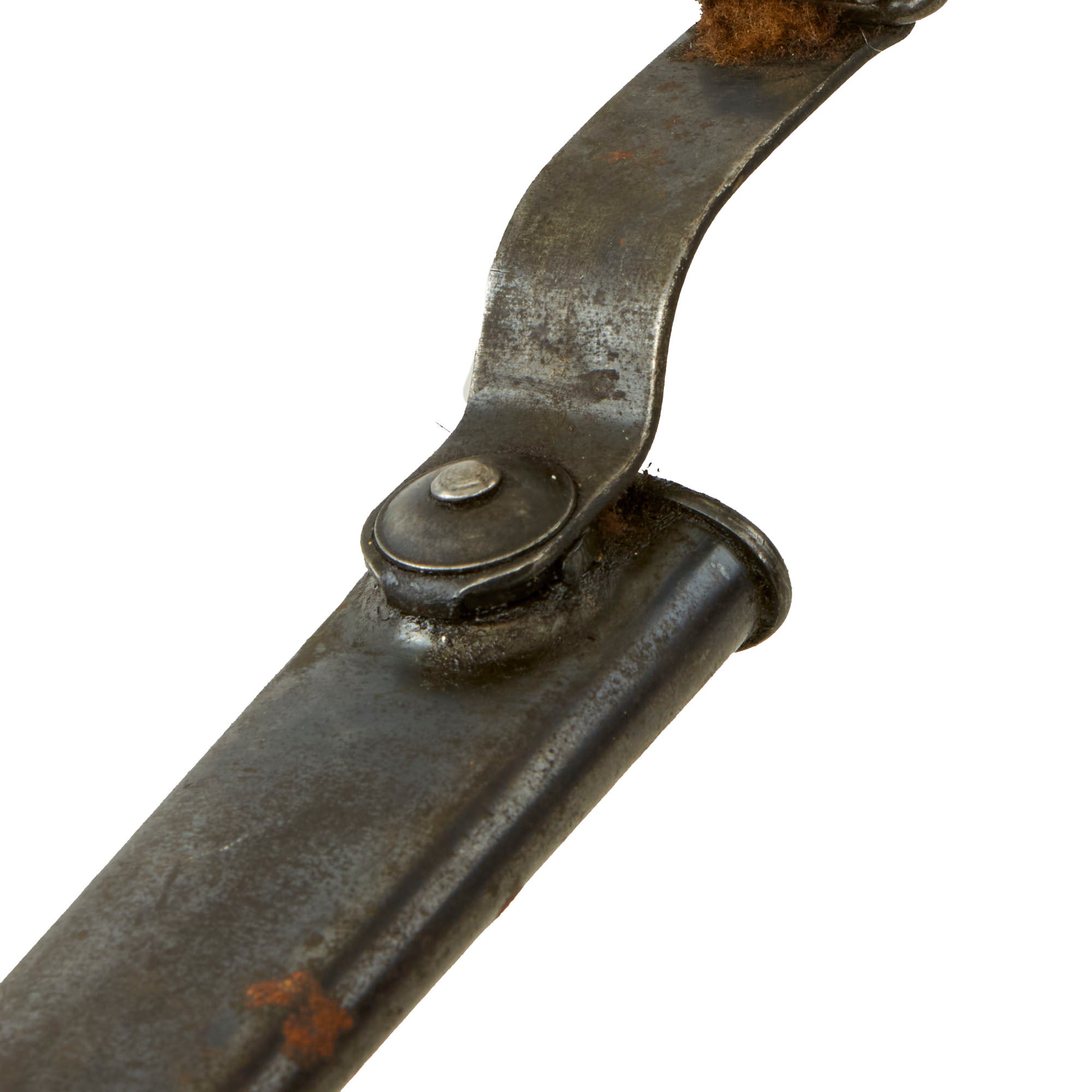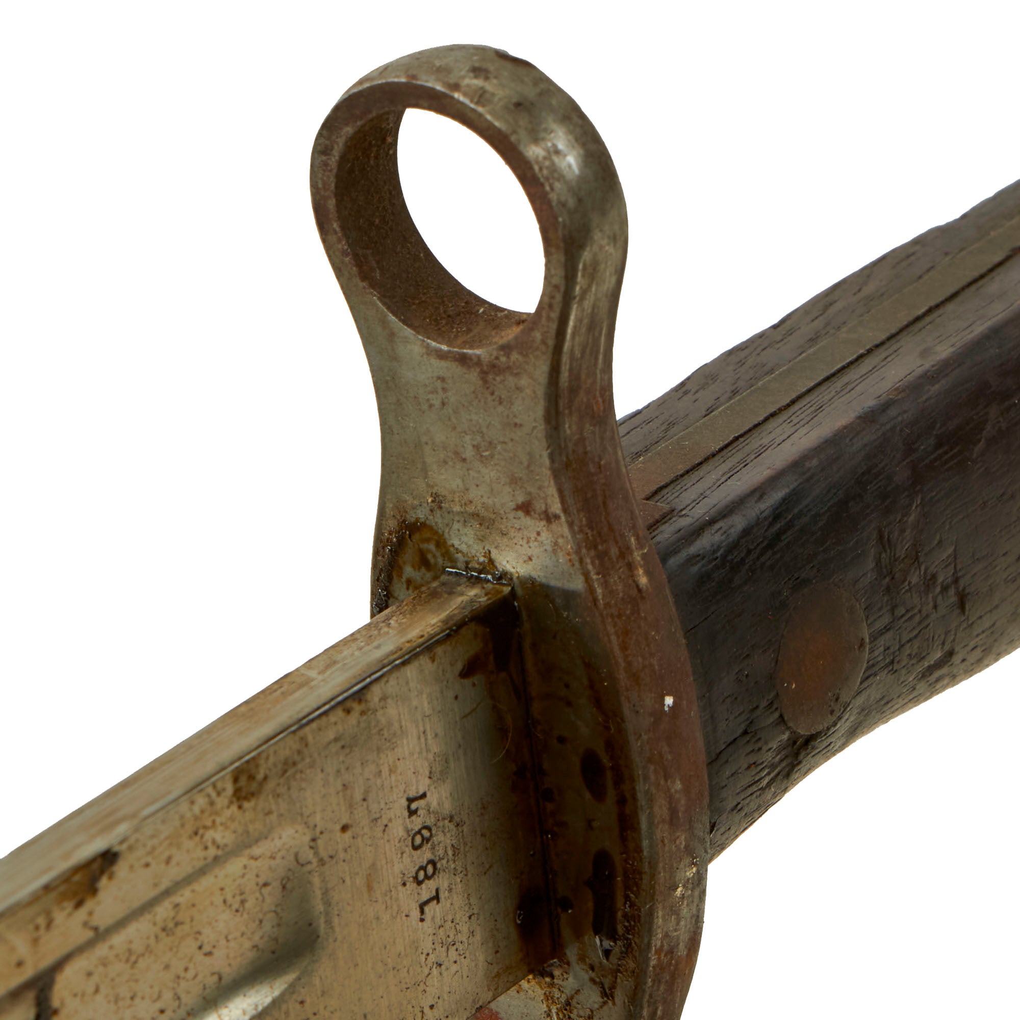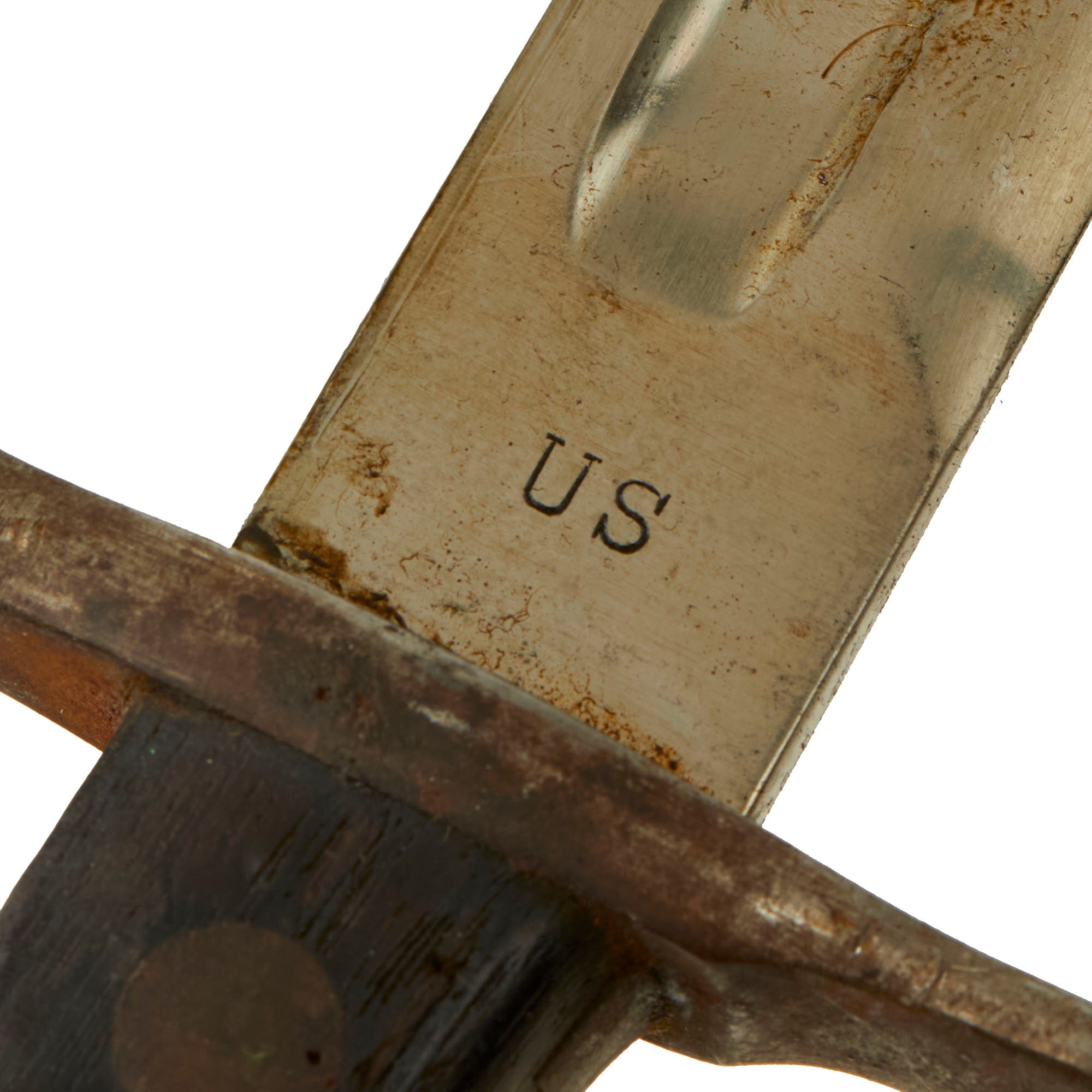 Original Item: Only One Available. This is a great example of a Spanish-American War dated U.S. M1892 bayonet, made for the Springfield Model 1892–99 Krag-Jørgensen rifles, some of which were still in use during WWI. It is fitted with its original all steel scabbard with a swivel belt loop on the back. These are very rarely seen on today's market, especially with the scabbard included and fully intact.