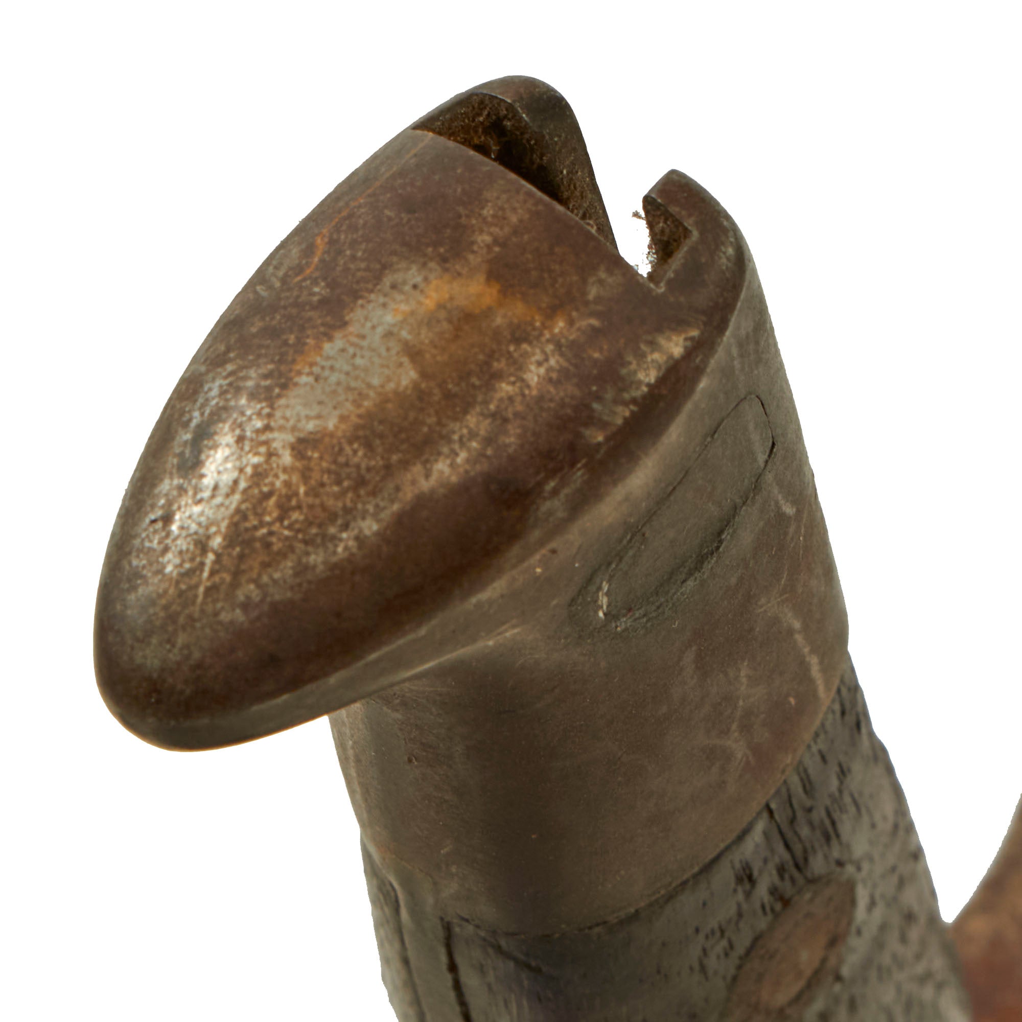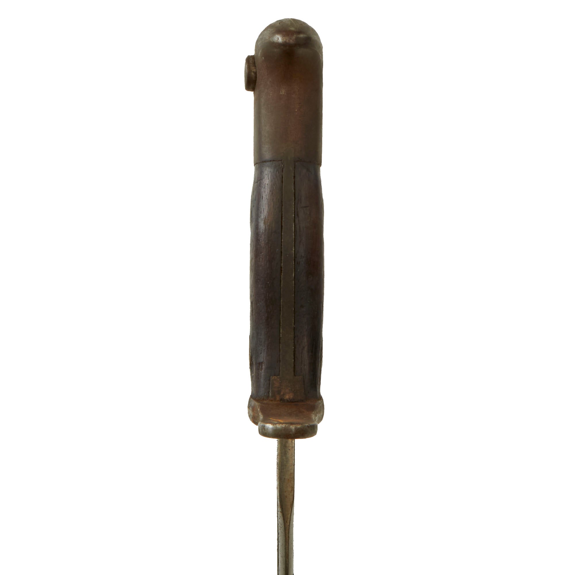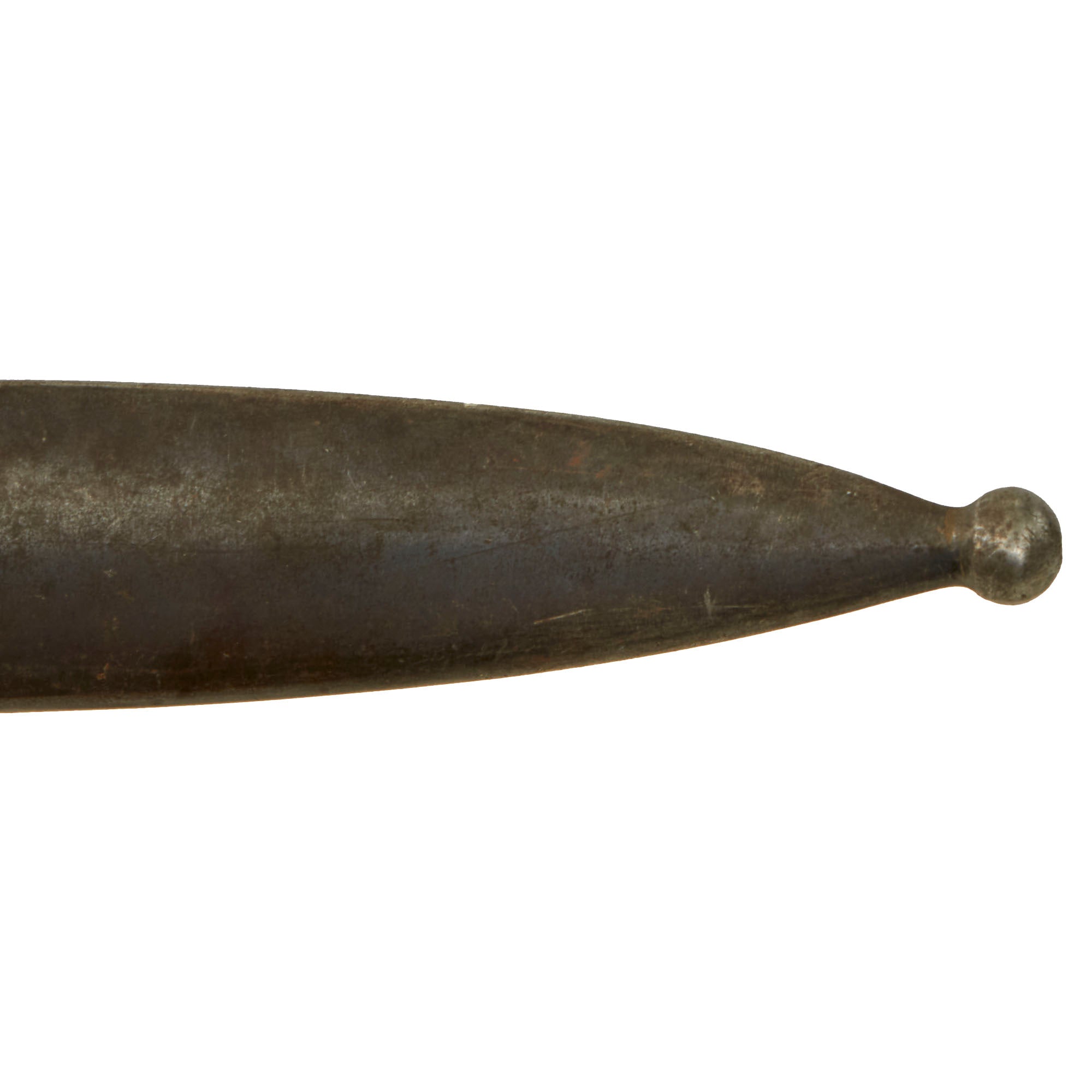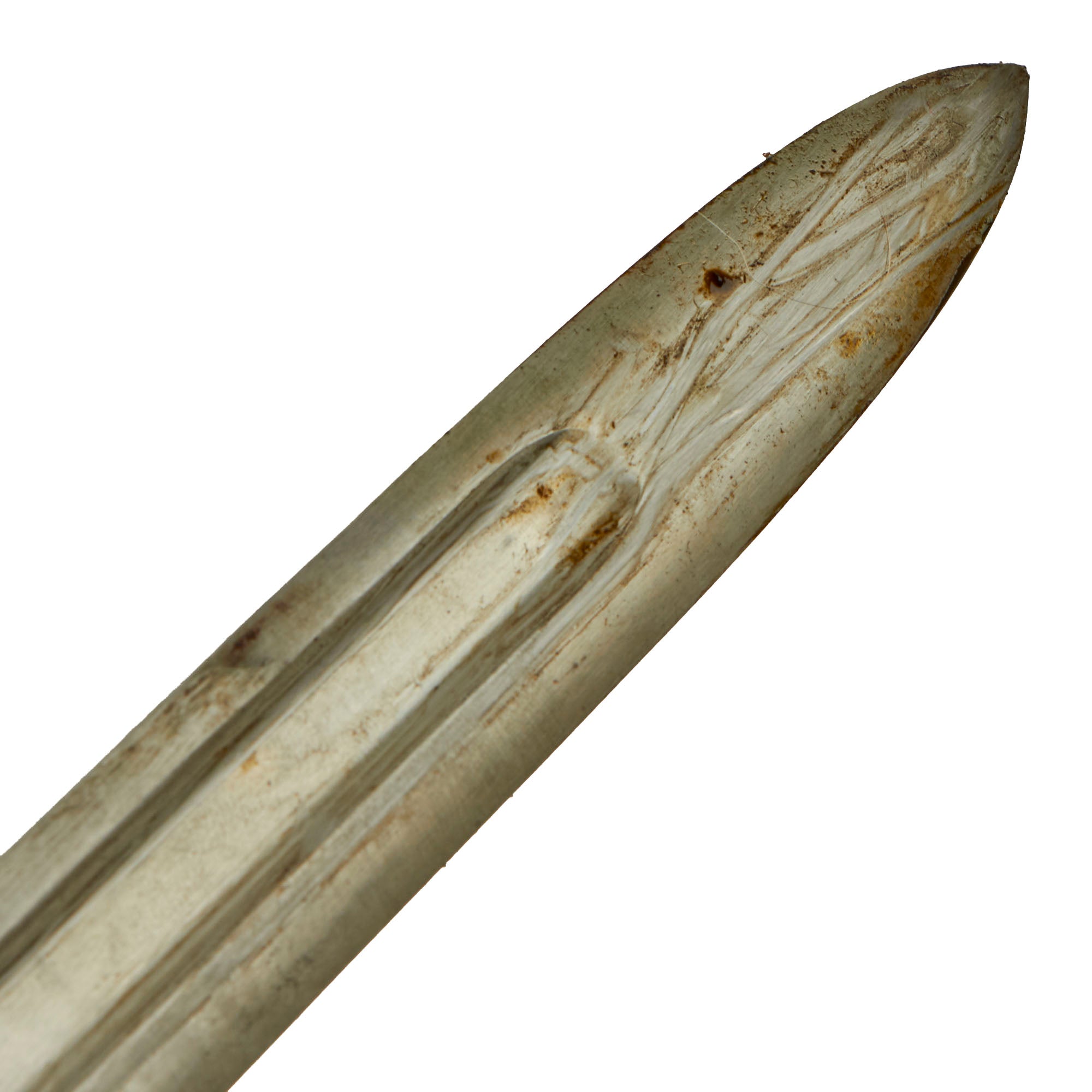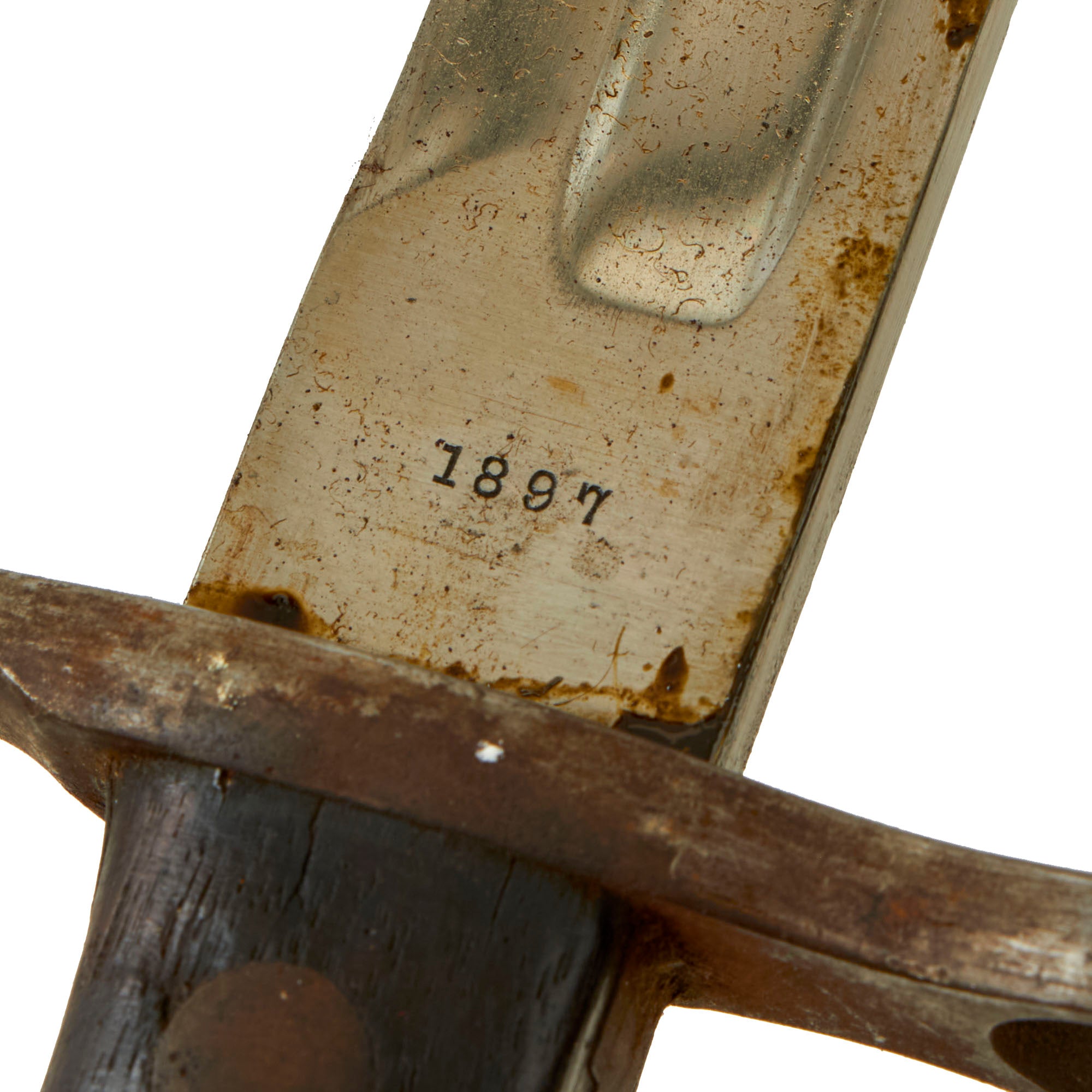 The blade retains its original patina and has not been cleaned or refinished. The blade is marked 1897 on one side and US on the reverse. The wooden grips of the handle show some damage on both sides as shown. The scabbard is still in good working condition with very light pitting. The bayonet catch is still fully functional, as well as the swivel on the scabbard.