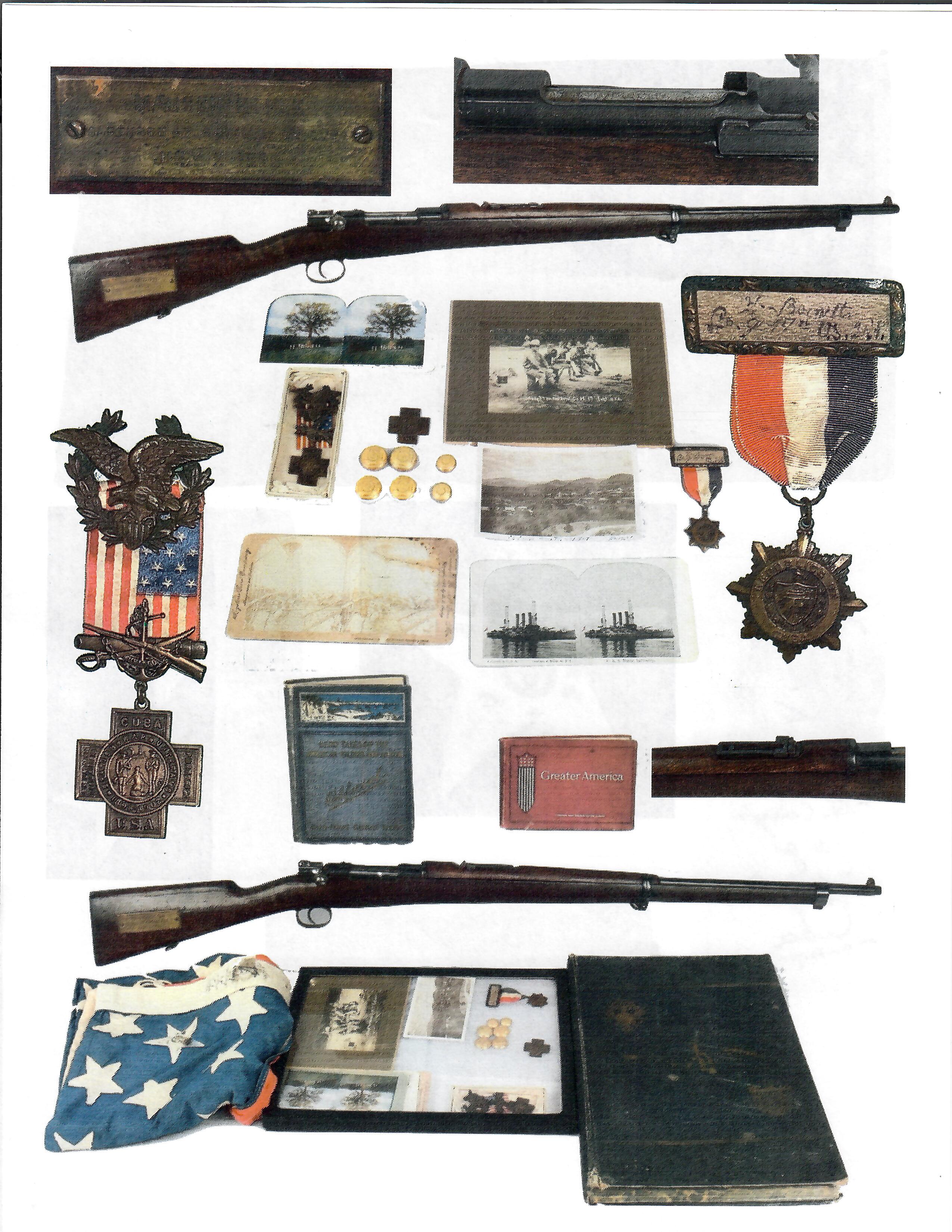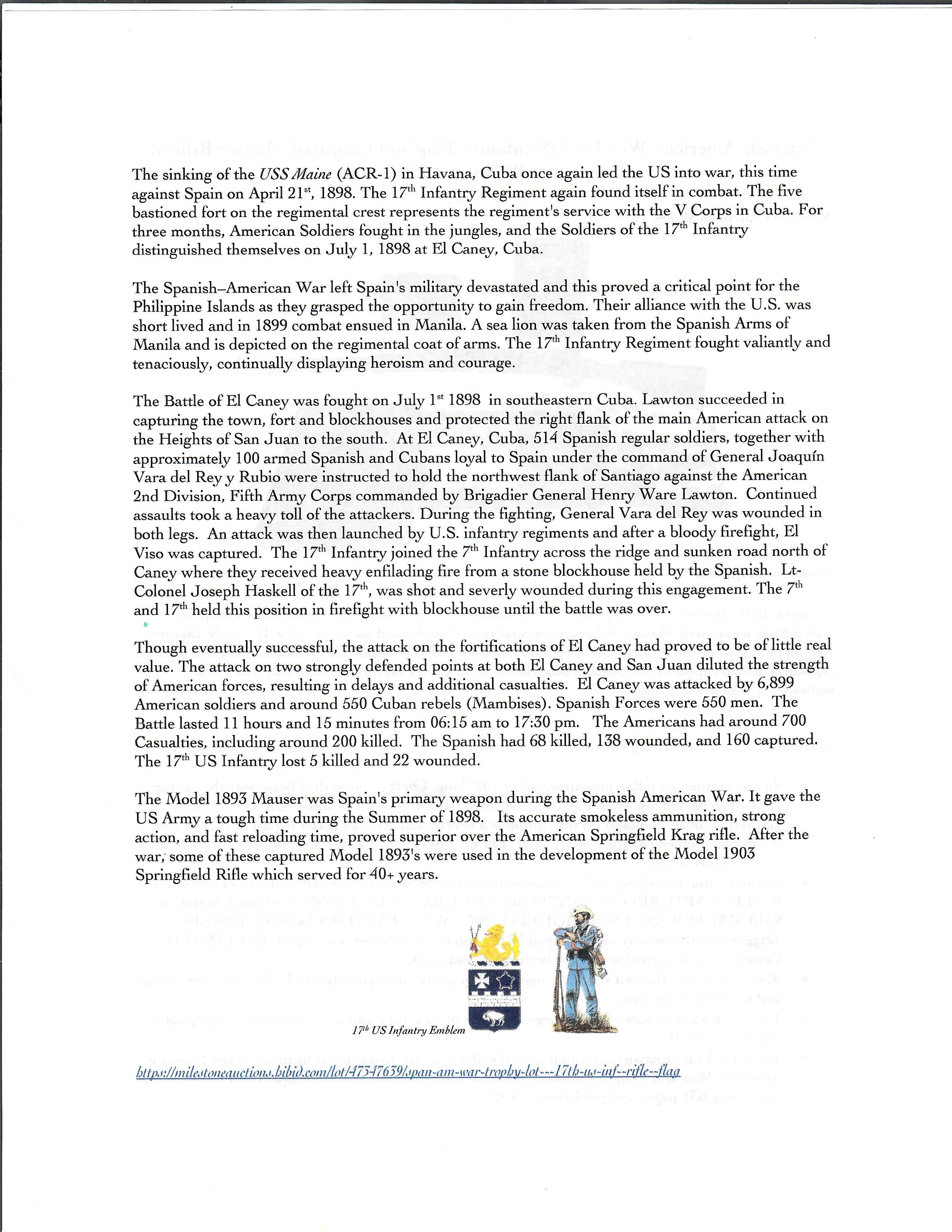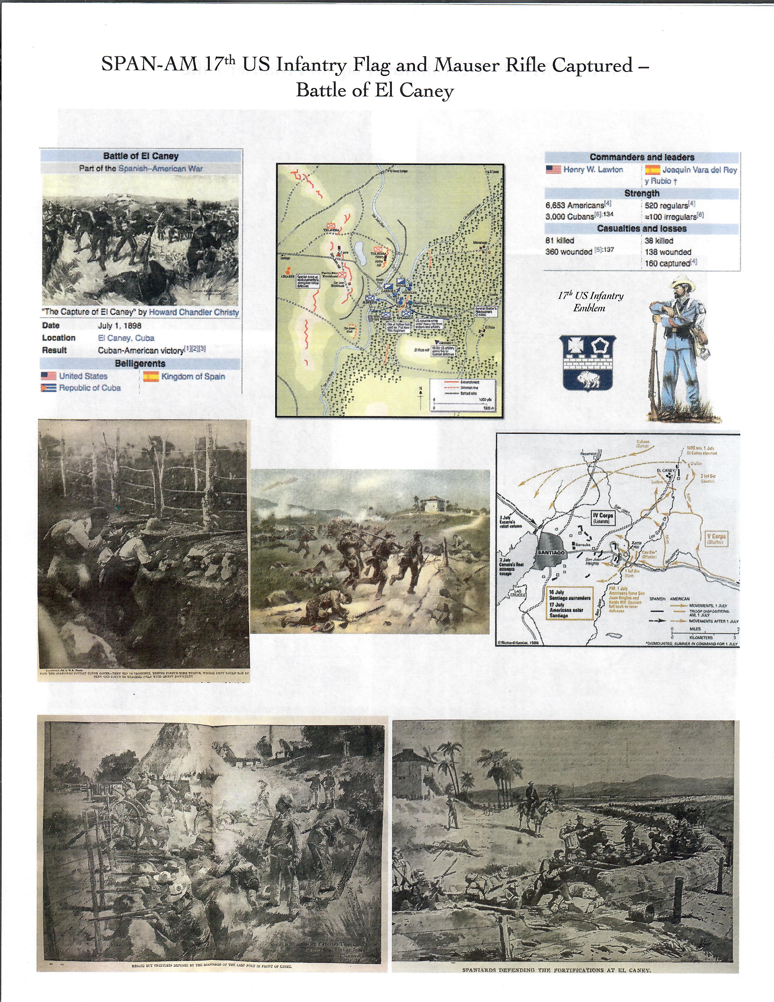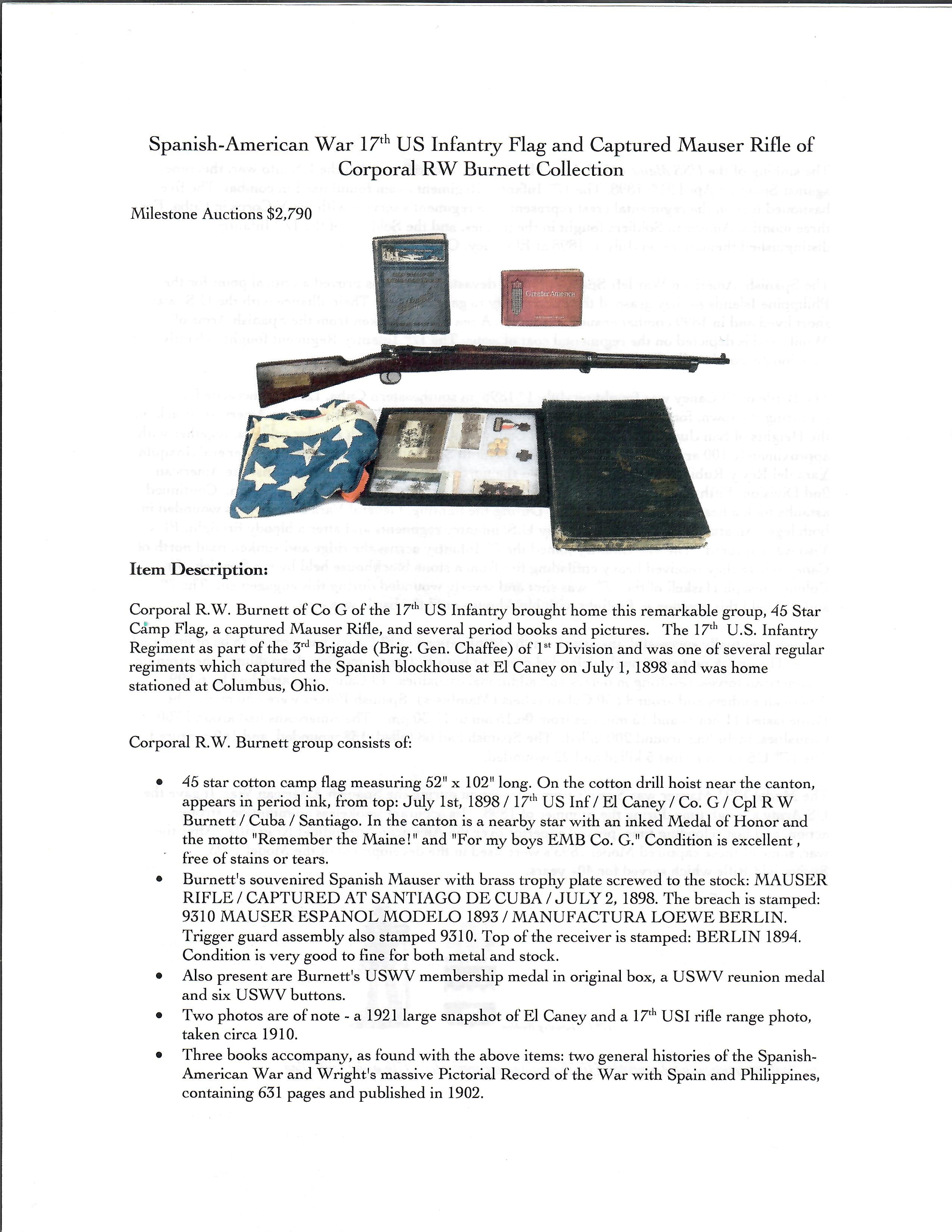 Corporal R.W. Burnett of Co G of the 17 US Infantry brought home this remarkable group, 45 Star Camp Flag, a captured Mauser Rifle, and several period books and pictures. The 17 U.S. Infantry Regument as part of the 3 Brigade (Brig. Gen. Chaffee) of 1" Division and was one of several regular regiments which captured the Spanish blockhouse at El Caney on July 1, 1898 and was home stationed at Columbus, Ohio.