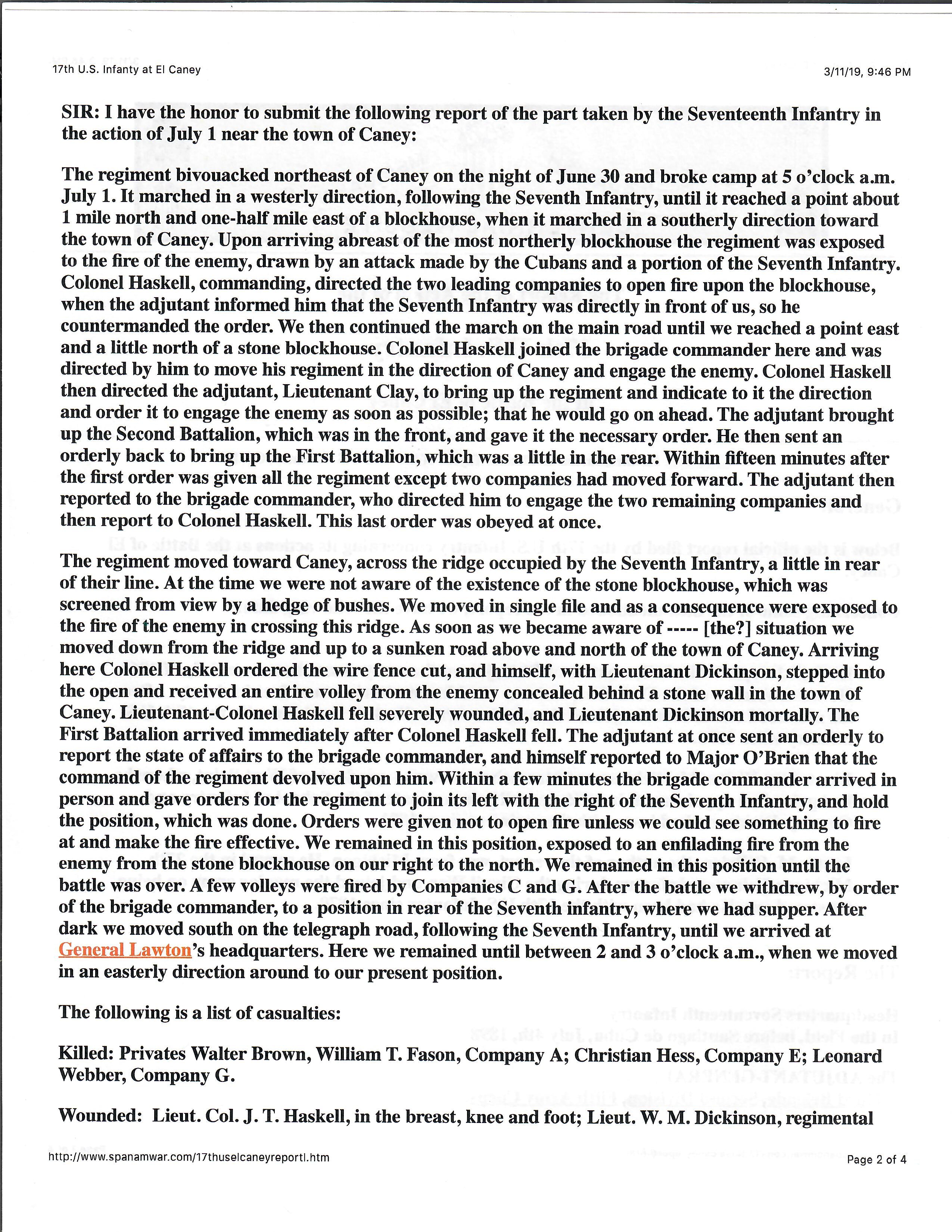 The Battle of El Caney was fought on July 1, 1898, during the Spanish-American War. 600 Spanish soldiers held for twelve hours, until they ran out of ammunition, against Henry W. Lawton's 5th US Division, made up of 6,899 men. This action temporarily delayed the American advance on the San Juan Hills, as had been requested of General William Rufus Shafter. Nevertheless, American forces advanced on San Juan Hill the same day. Though encountering spirited resistance similar to El Caney, the Americans were ultimately victorious, culminating in the capitulation of the Spanish garrison.