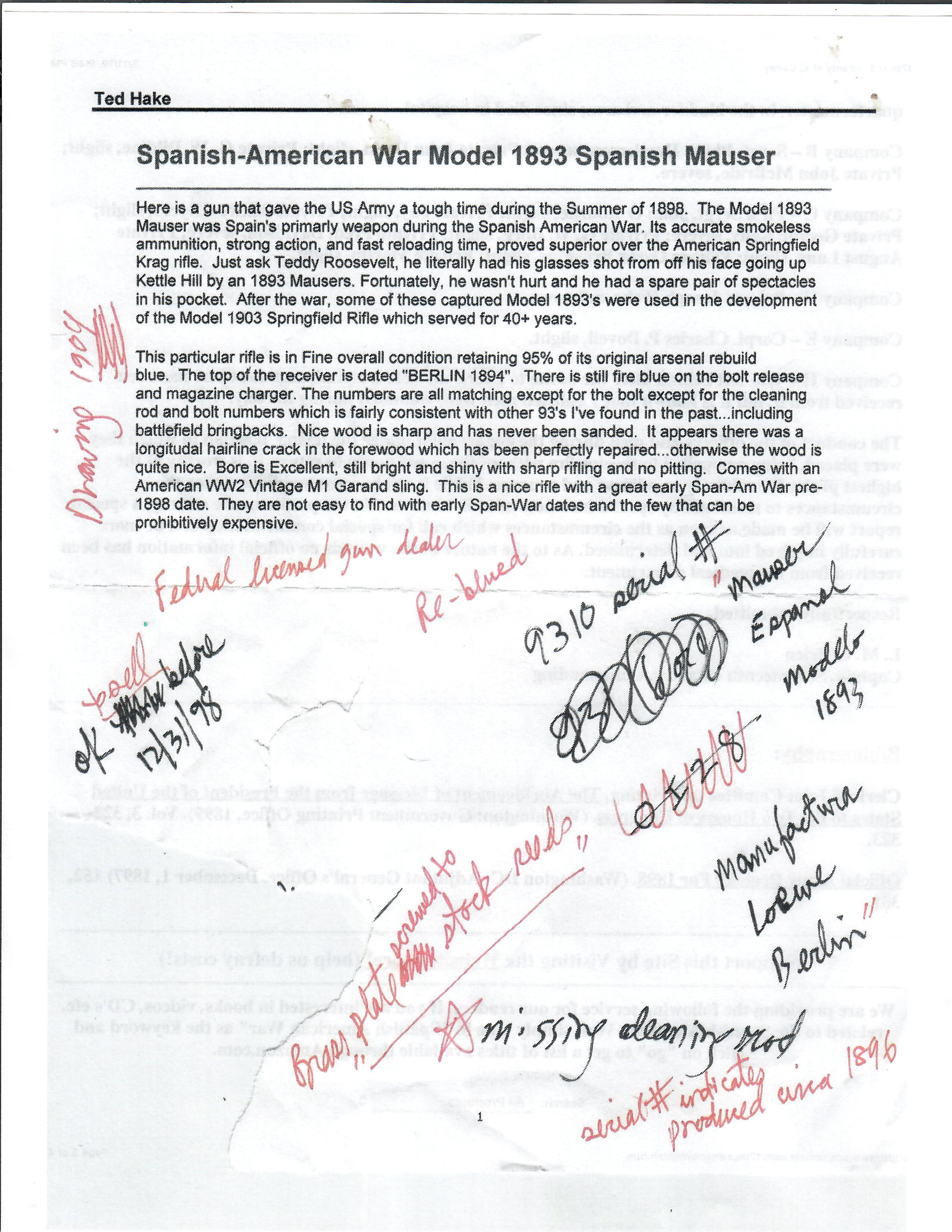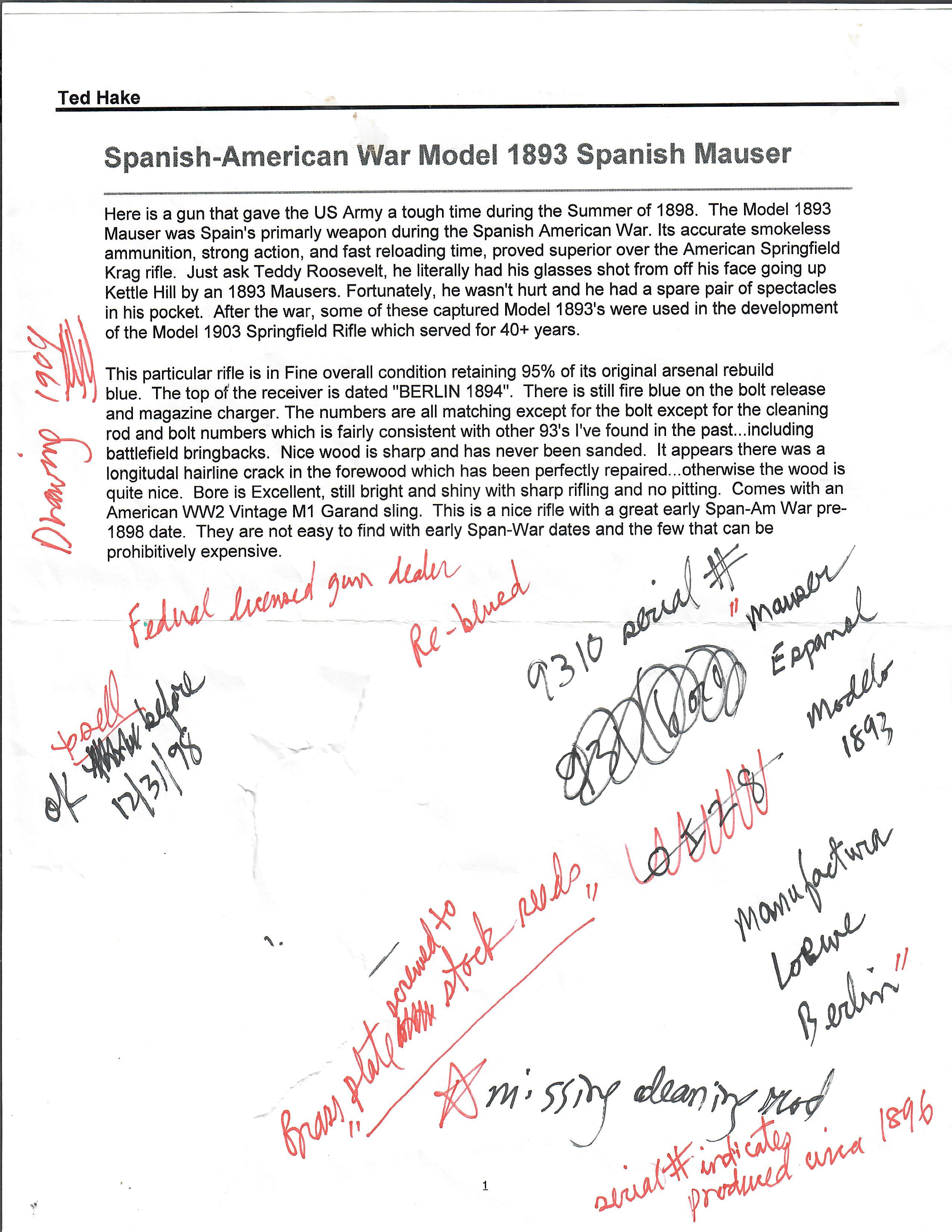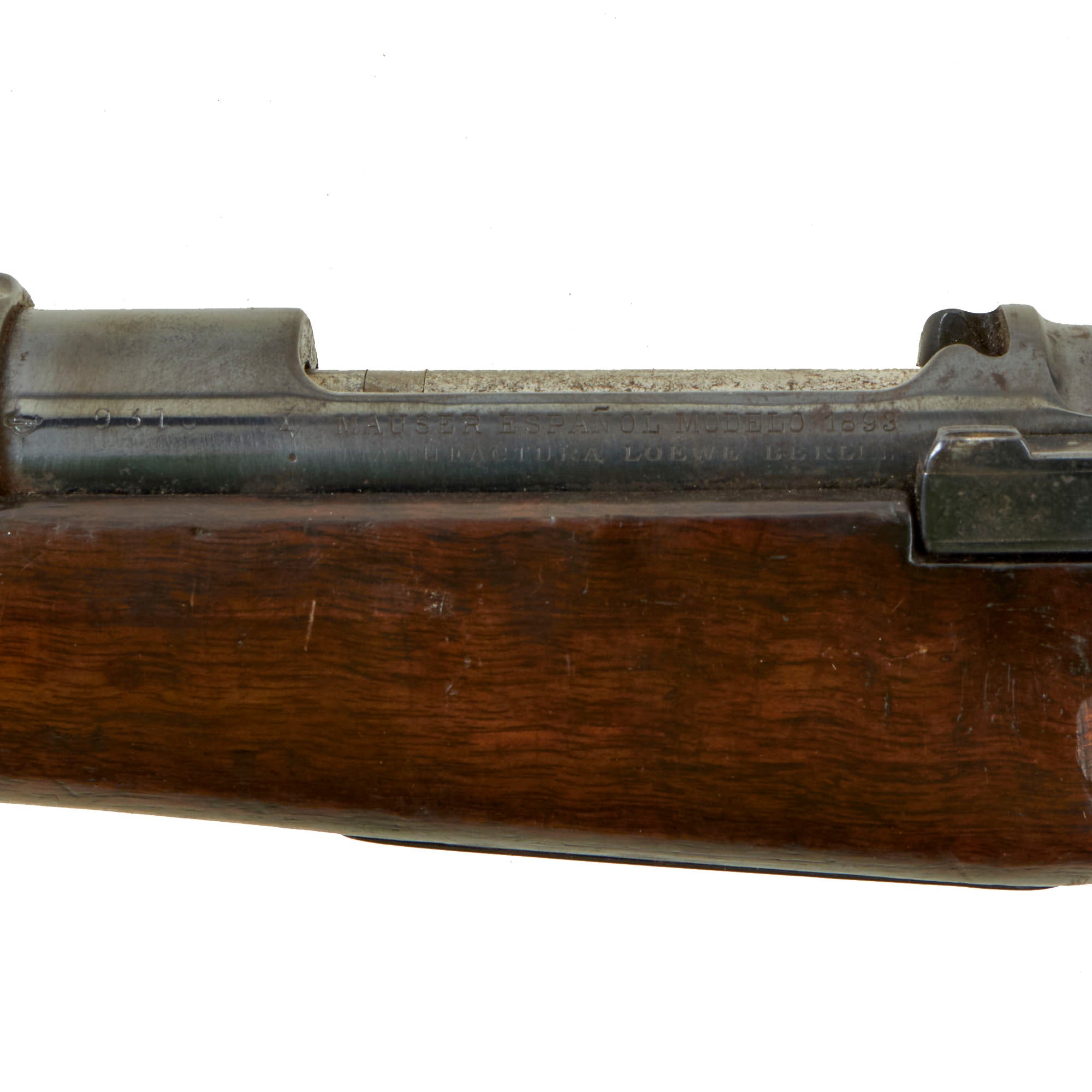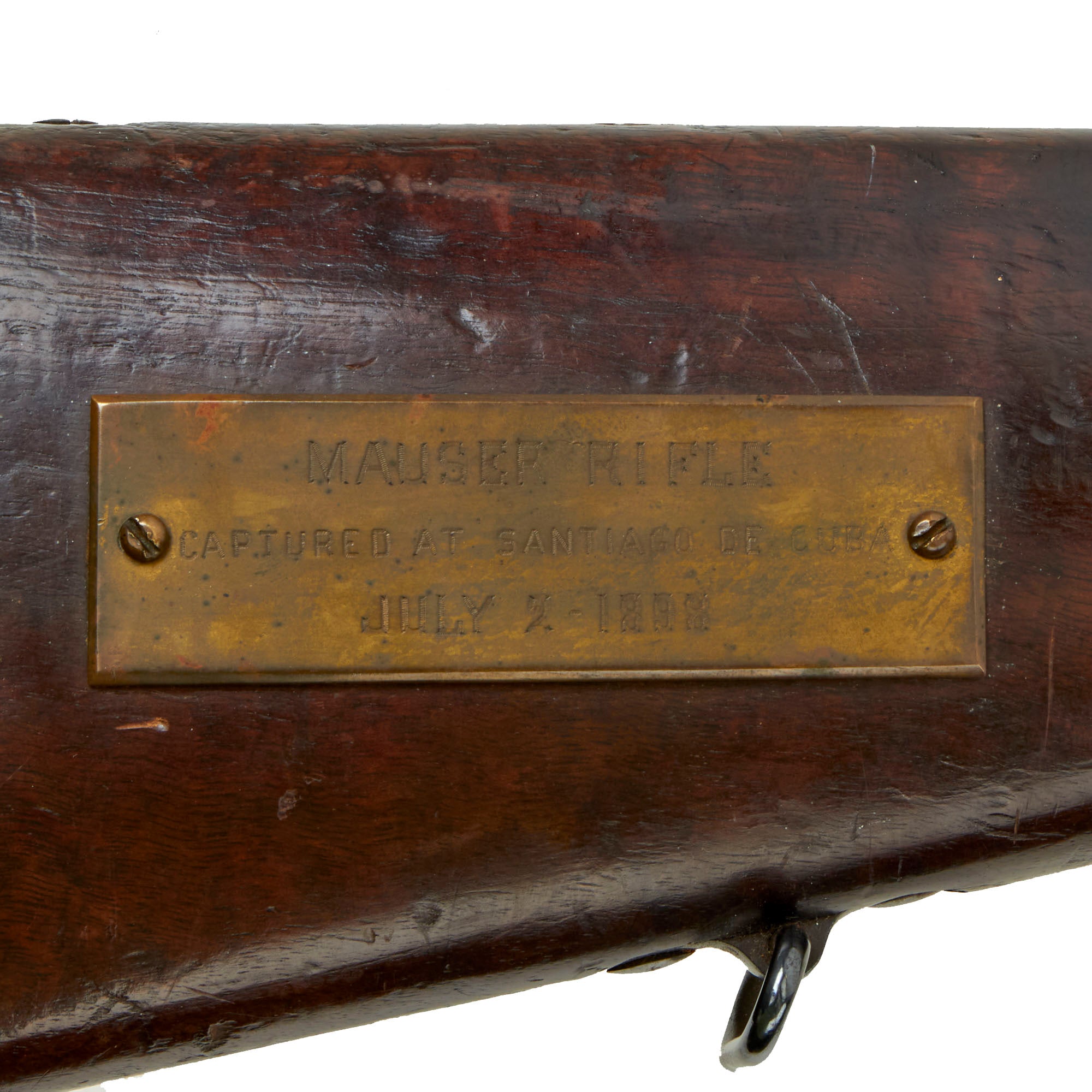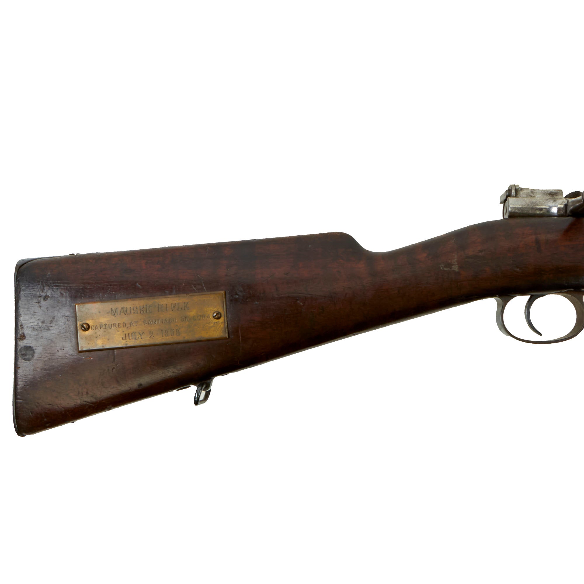 -Burnett's souvenired Spanish Mauser with brass trophy plate screwed to the stock: MAUSER RIFLE/CAPTURED AT SANTIAGO DE CUBA/JULY 2, 1898. The breach is stamped: 9310 MAUSER ESPANOL MODELO 1893/MANUFACTURA LOEWE BERLIN Trigger guard assembly also stamped 9310. Top of the receiver is stamped: BERLIN 1894. Condition is very good to fine for both metal and stock.