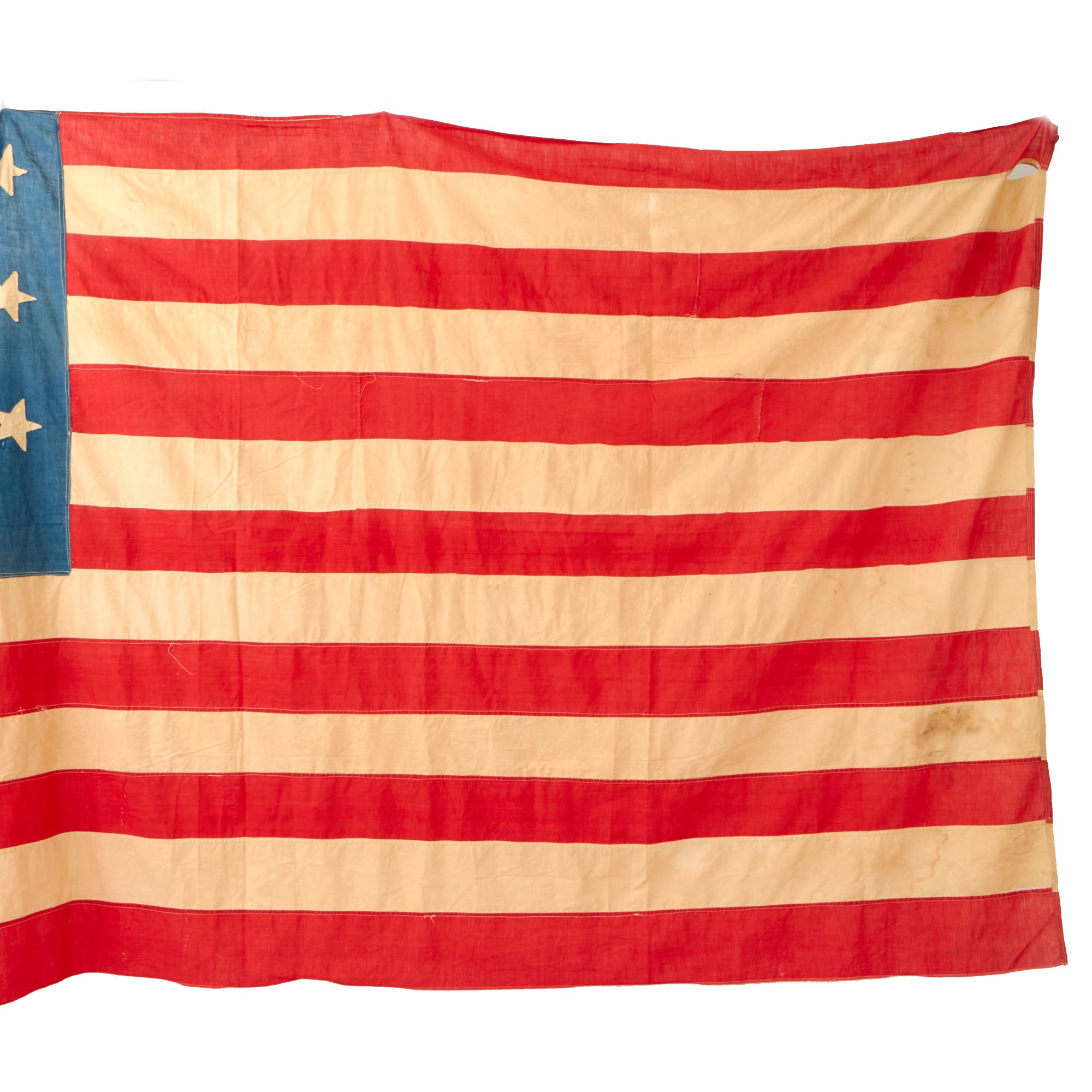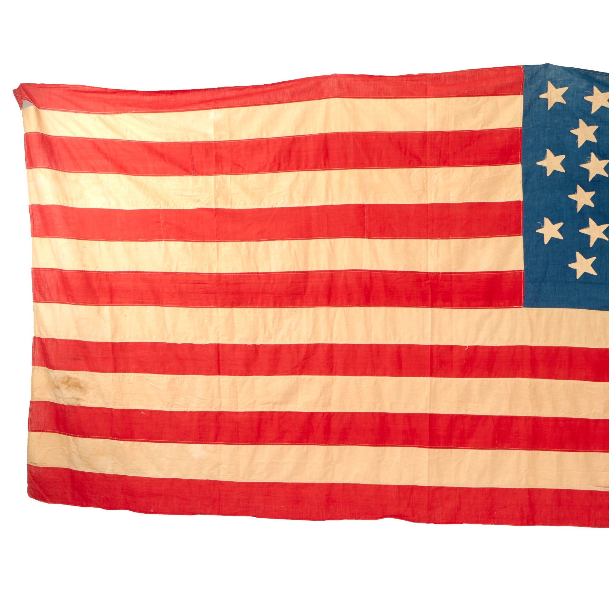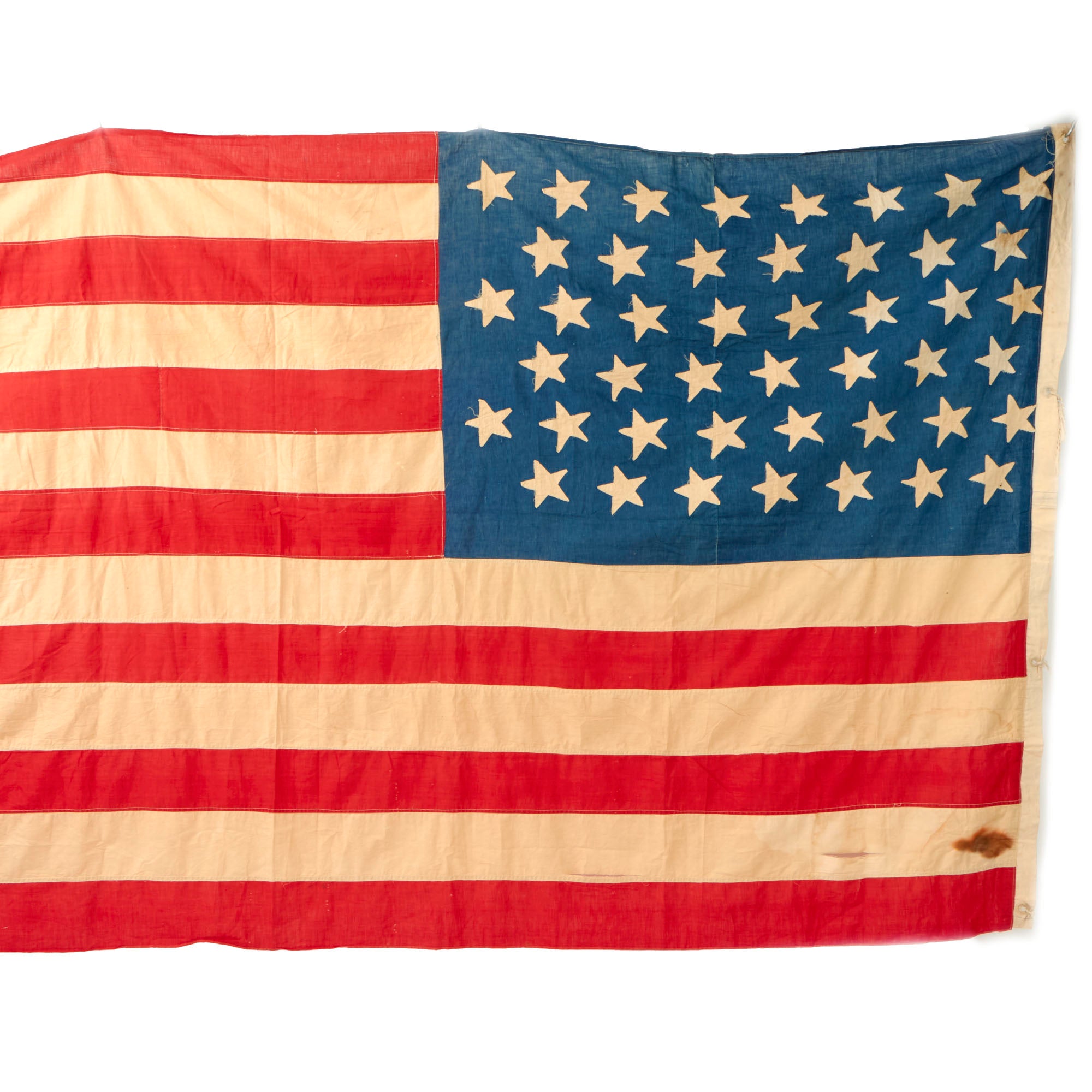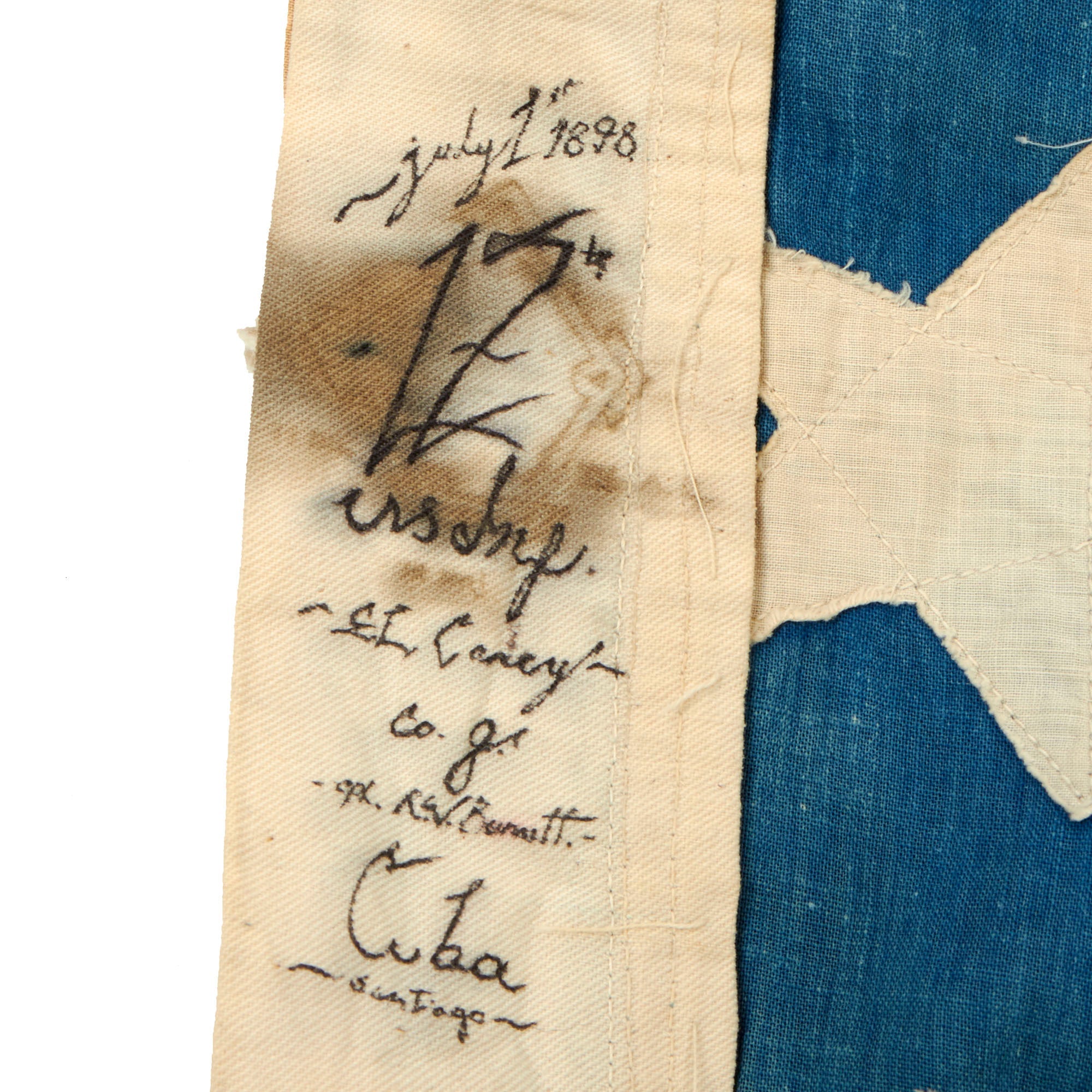 -45 star cotton camp flag measuring 52 x 102 long. On the cotton drill hoist near the canton. appears in period ink, from top: July 1st, 1898/17 US Inf/El Caney/Co. G/Cpl RW