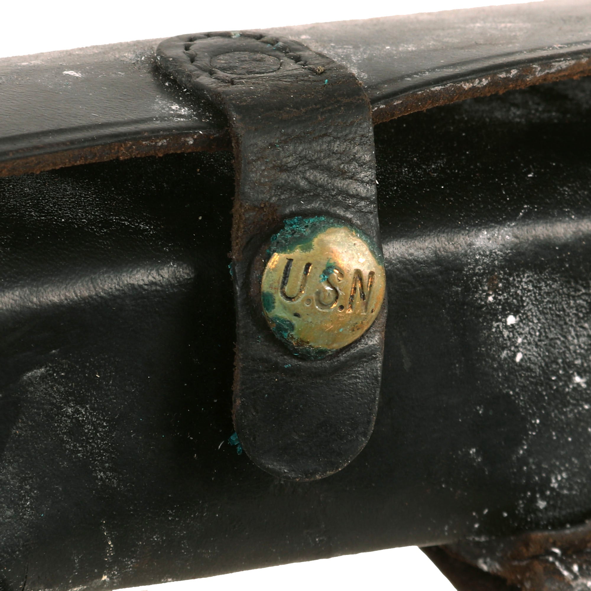 The first style has a thinner circle around the embossing with a plain smooth vaulted snap, the second style has a higher and overall smaller embossing with a snap stamped U.S.N., and the third has a larger embossing with a thicker circle and a sunburst snap style with a hole in the middle. All fittings have a bit of verdigris and have intact belt loops and straps.