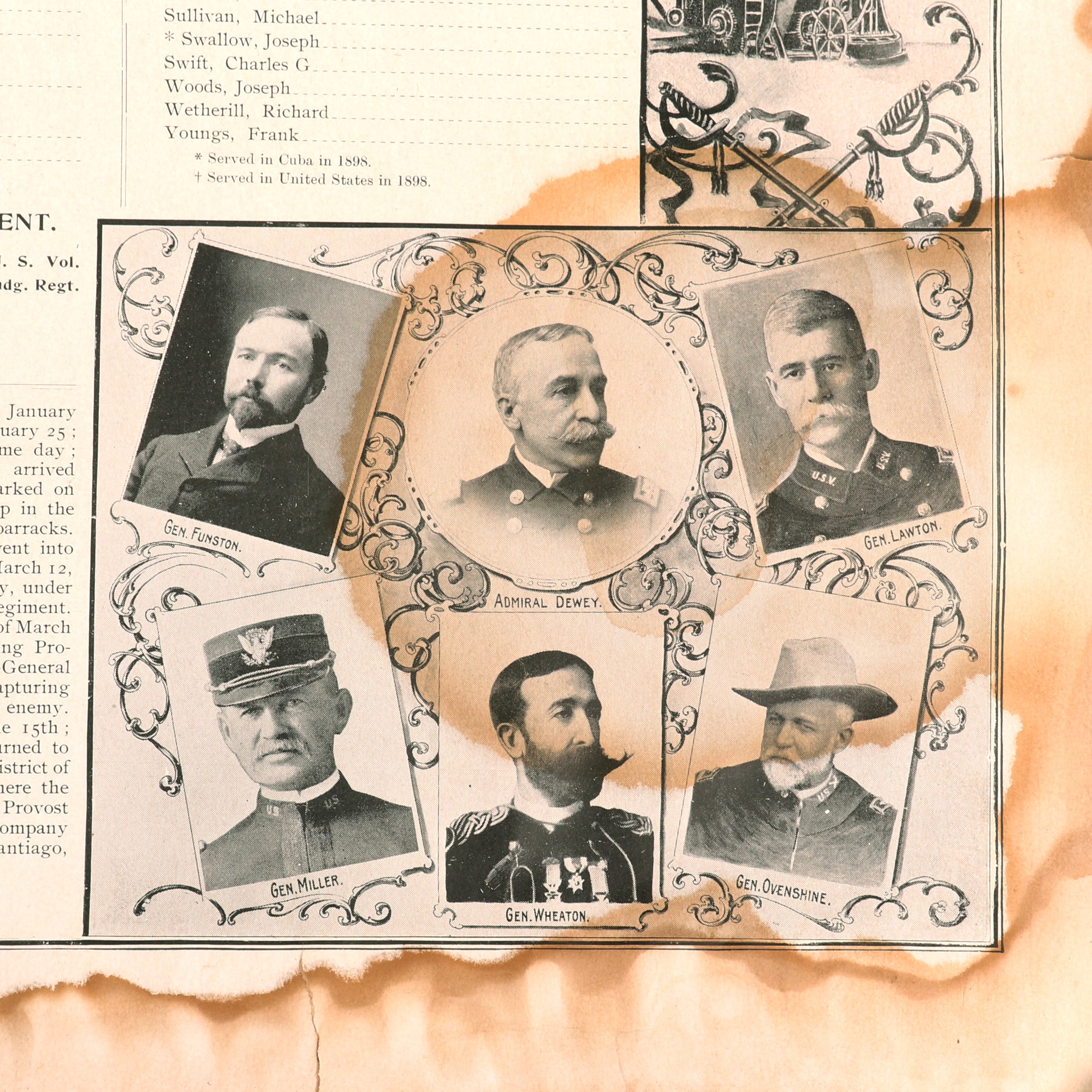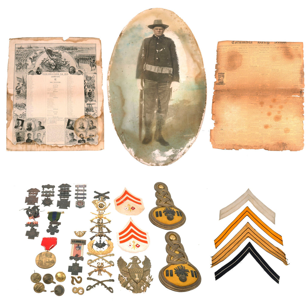 Original Items. Only One Lot Available. This is a very nice lot of Spanish-American War items including a period oval colorized portrait of an American soldier, a roster for Company E, 20th Infantry Regiment, who fought at Santiago, and a myriad of insignia. This is a great opportunity to delve into a new era of U.S. Militaria!