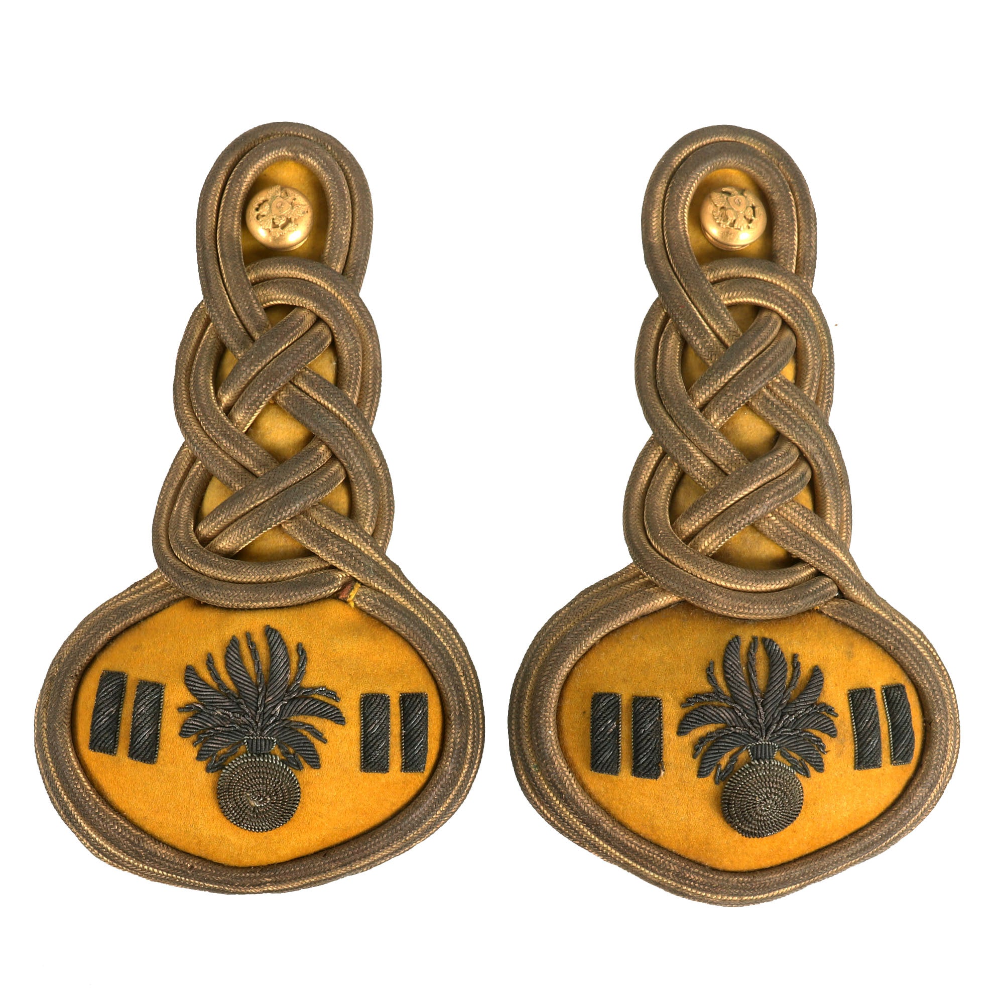 -Beautiful pair of Captain’s epaulets with yellow felt and bullion flaming bomb insignia, Eagle Company C Buttons. This set is in fantastic condition and both have trademarks stamped on the bottom. This is a PHENOMENAL set of epaulets.
