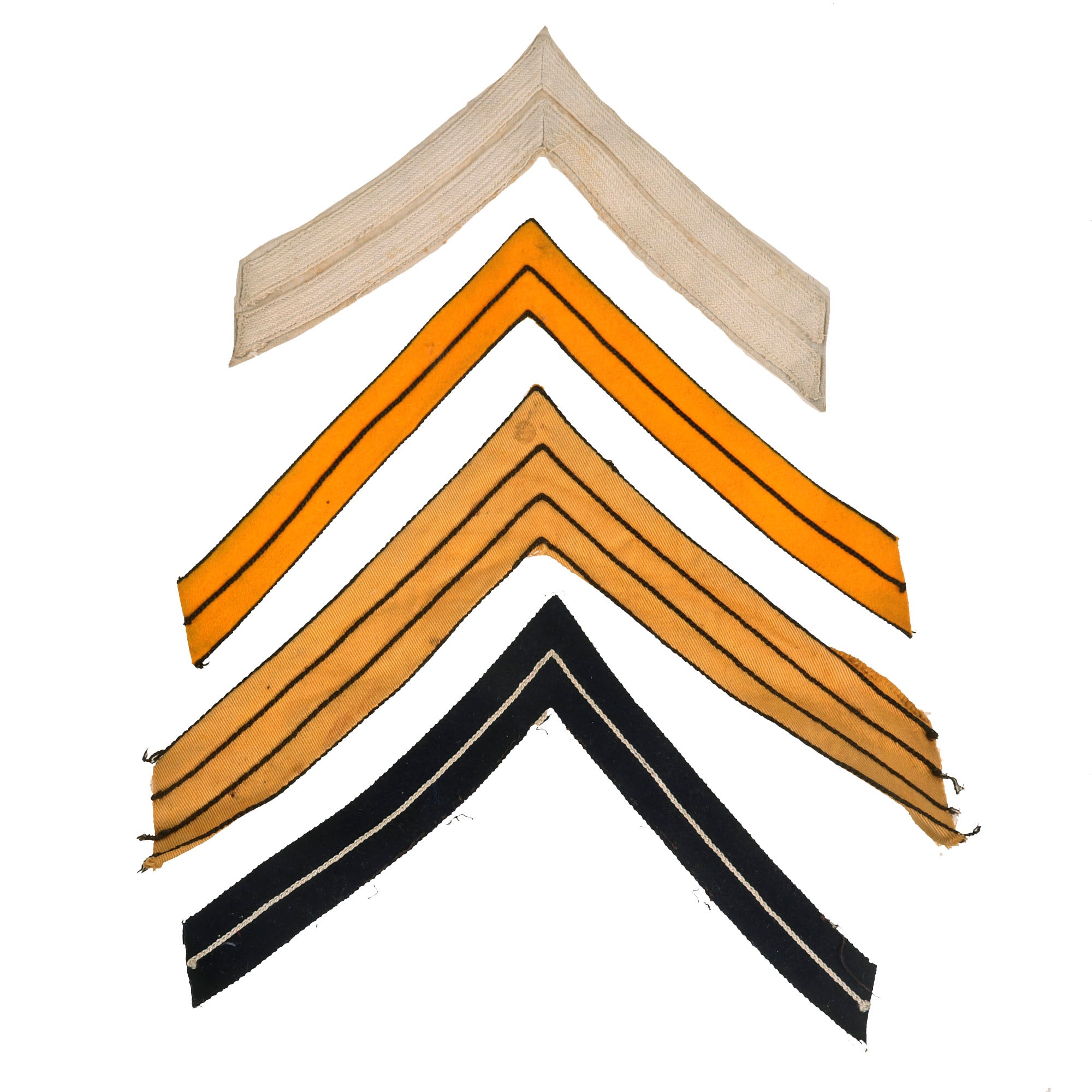 -Four long rank chevrons, one yellow Sergeant set, one yellow Corporal set, one blue Corporal set, and one white (1910 Marine Corps marked on back) Corporal set. Great set of rare chevrons.