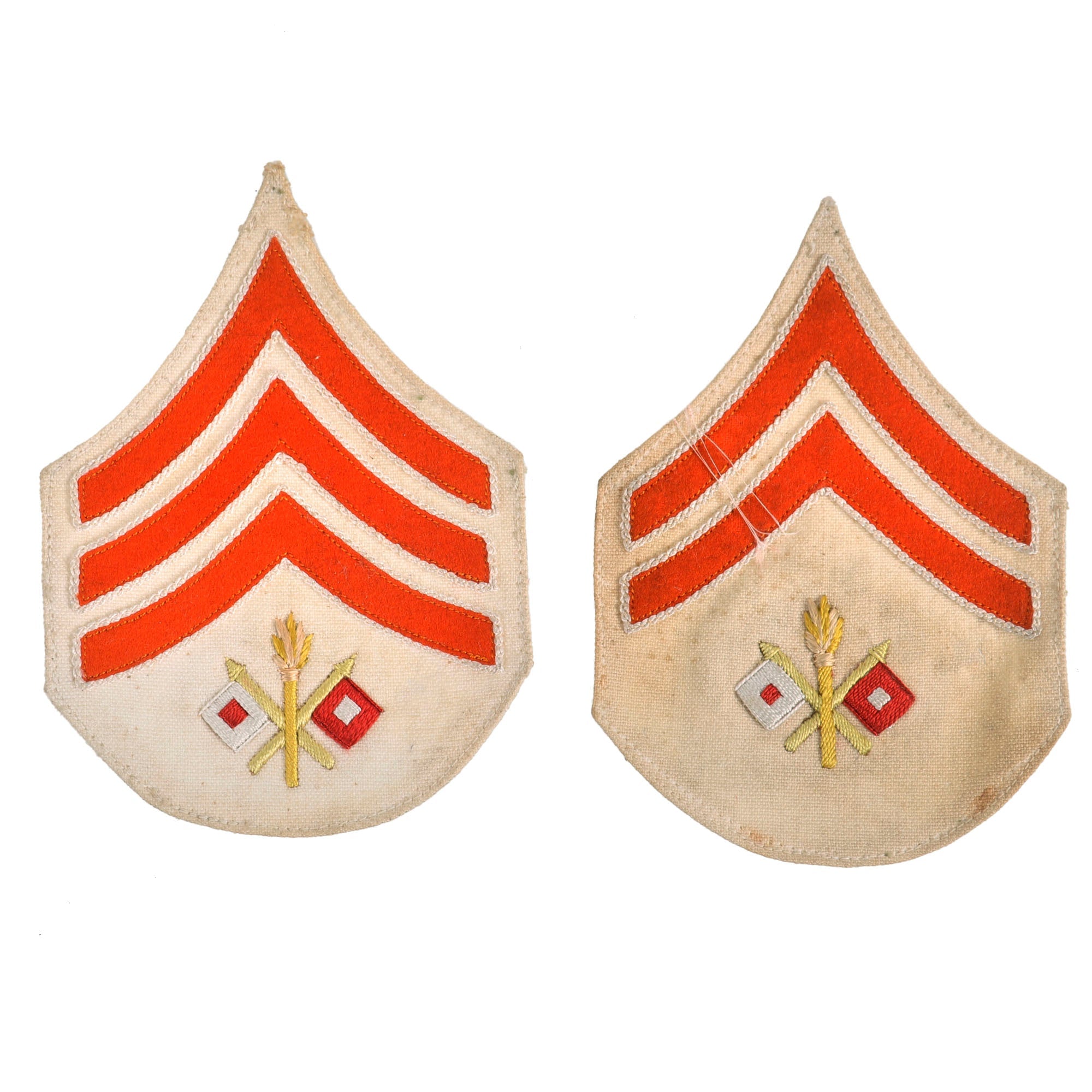 -Set of two Signal Corps ranks, one corporal and one sergeant, beautifully embroidered with orange chevrons. A gorgeous pair!