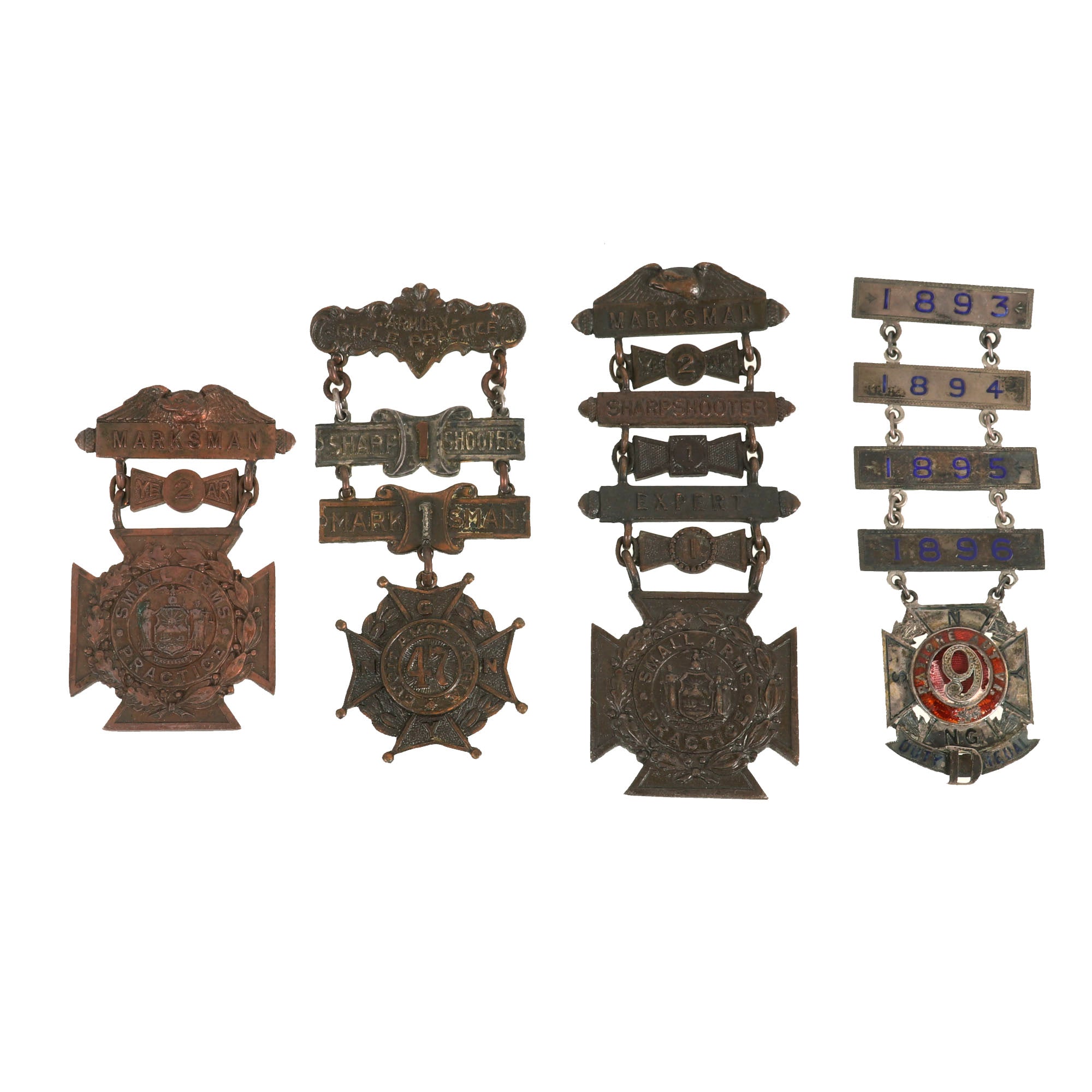 -9th NYNG Infantry ladder badge with badges for 1893, 1894, 1895, and 1896. Some marked John Frick NY, Solid Silver.