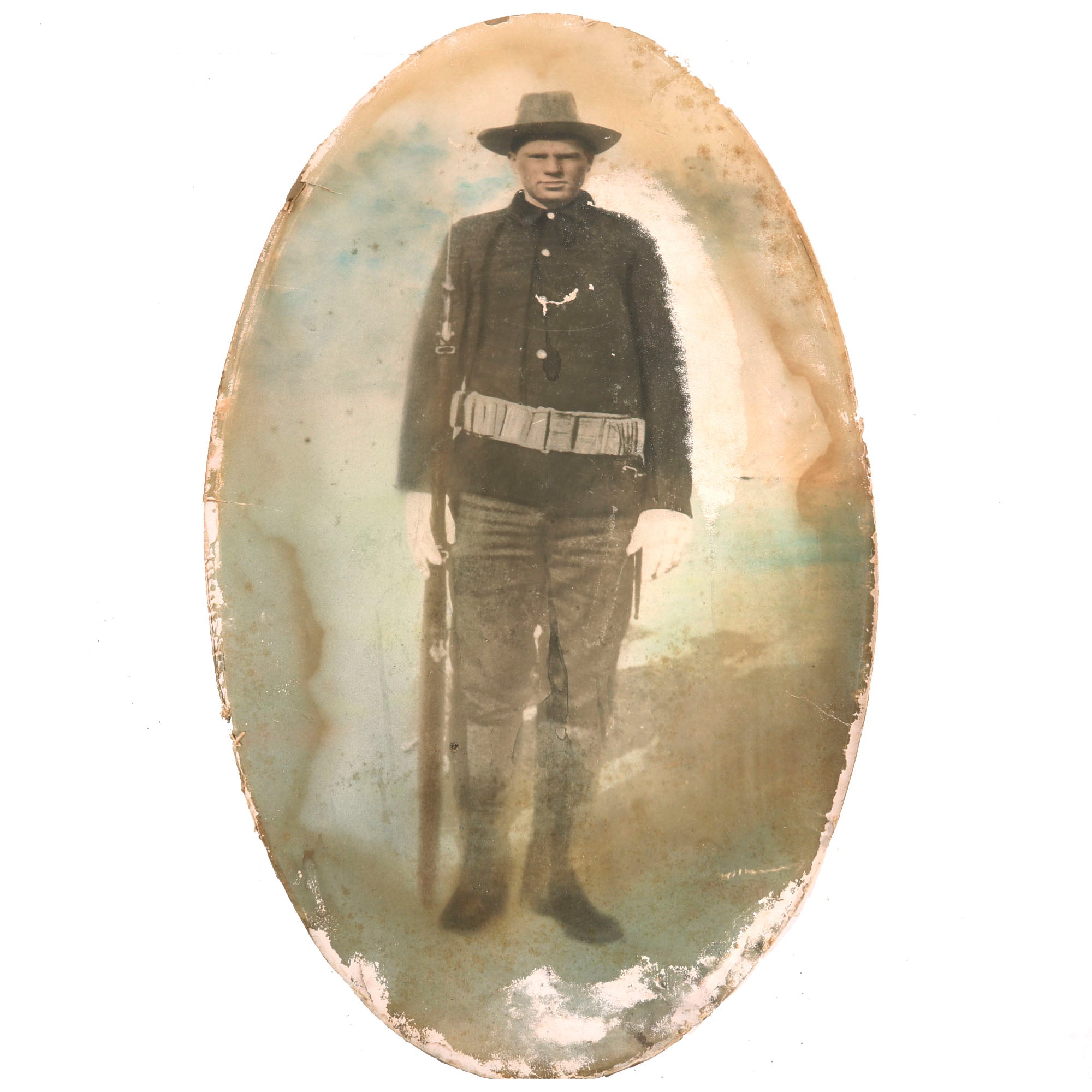 -Colorized oval portrait of an American soldier wearing an M1889 Campaign hat, uniform with cartridge belt, holding his American Krag rifle. The portrait is in rough shape with a large tear across the middle and some loss of color. Overall a nice piece.