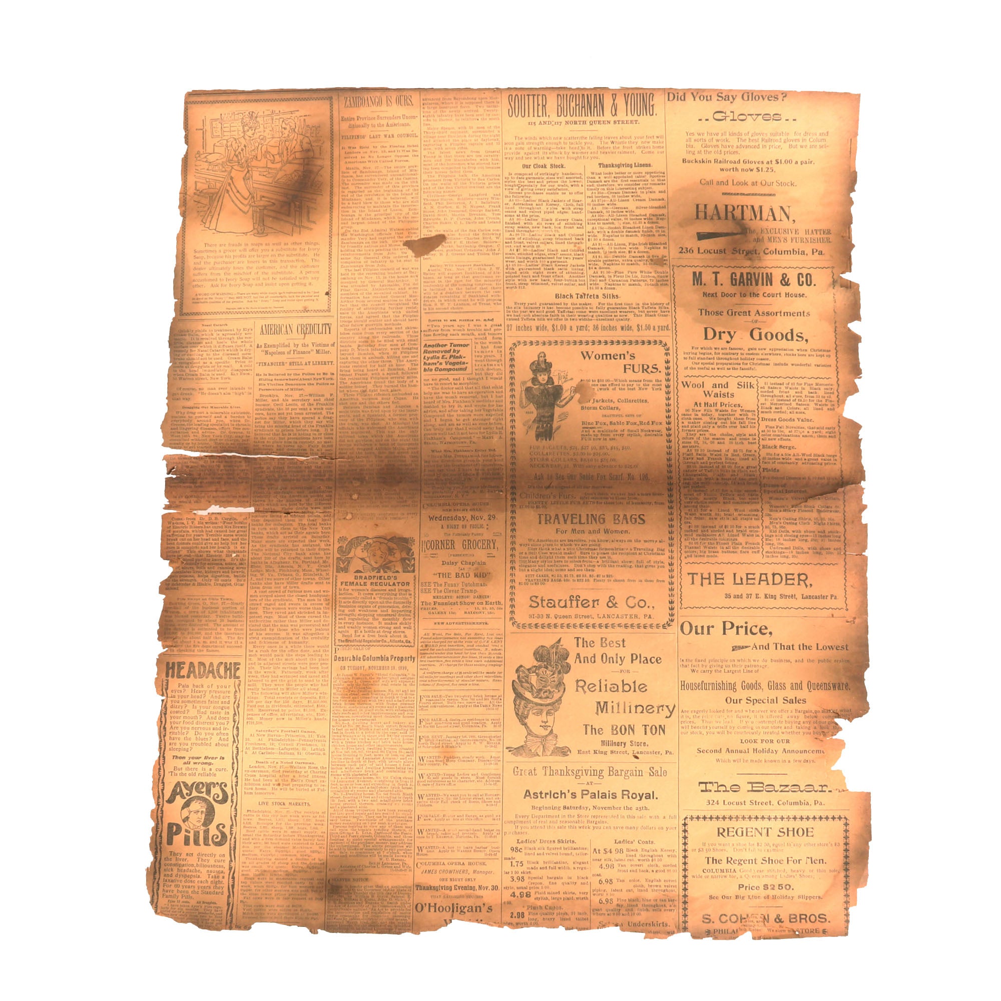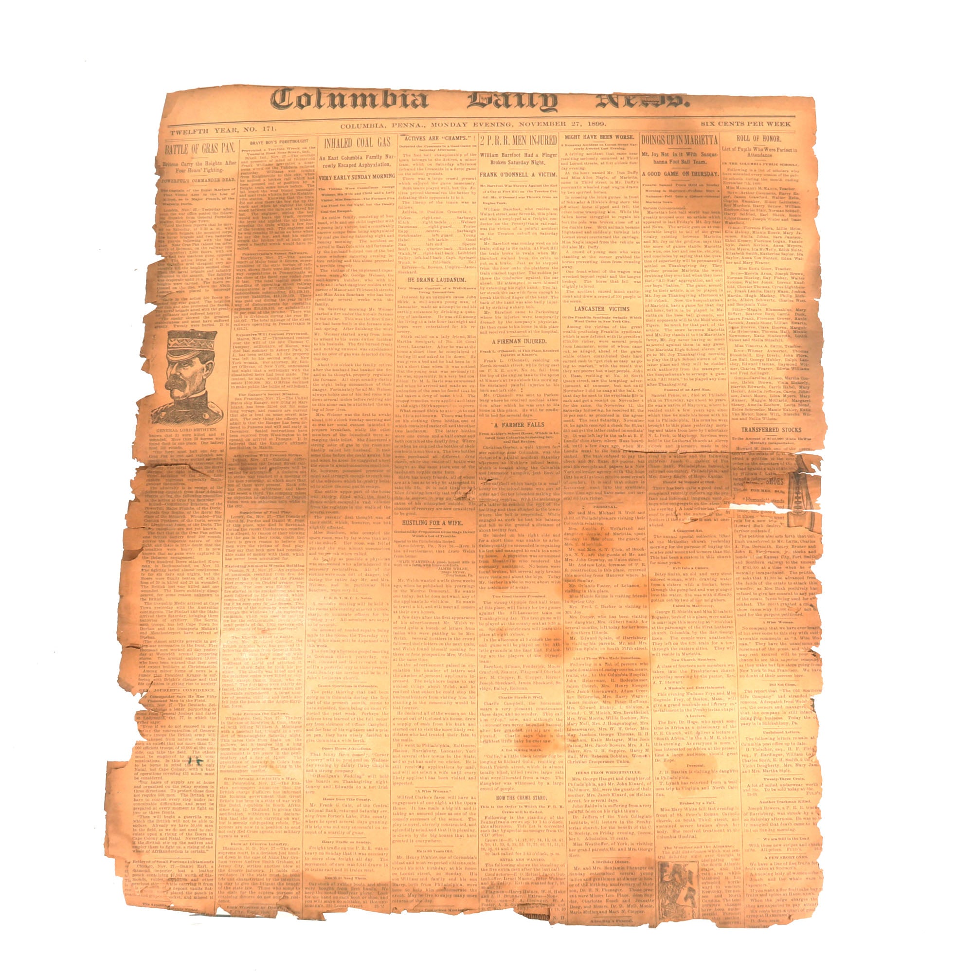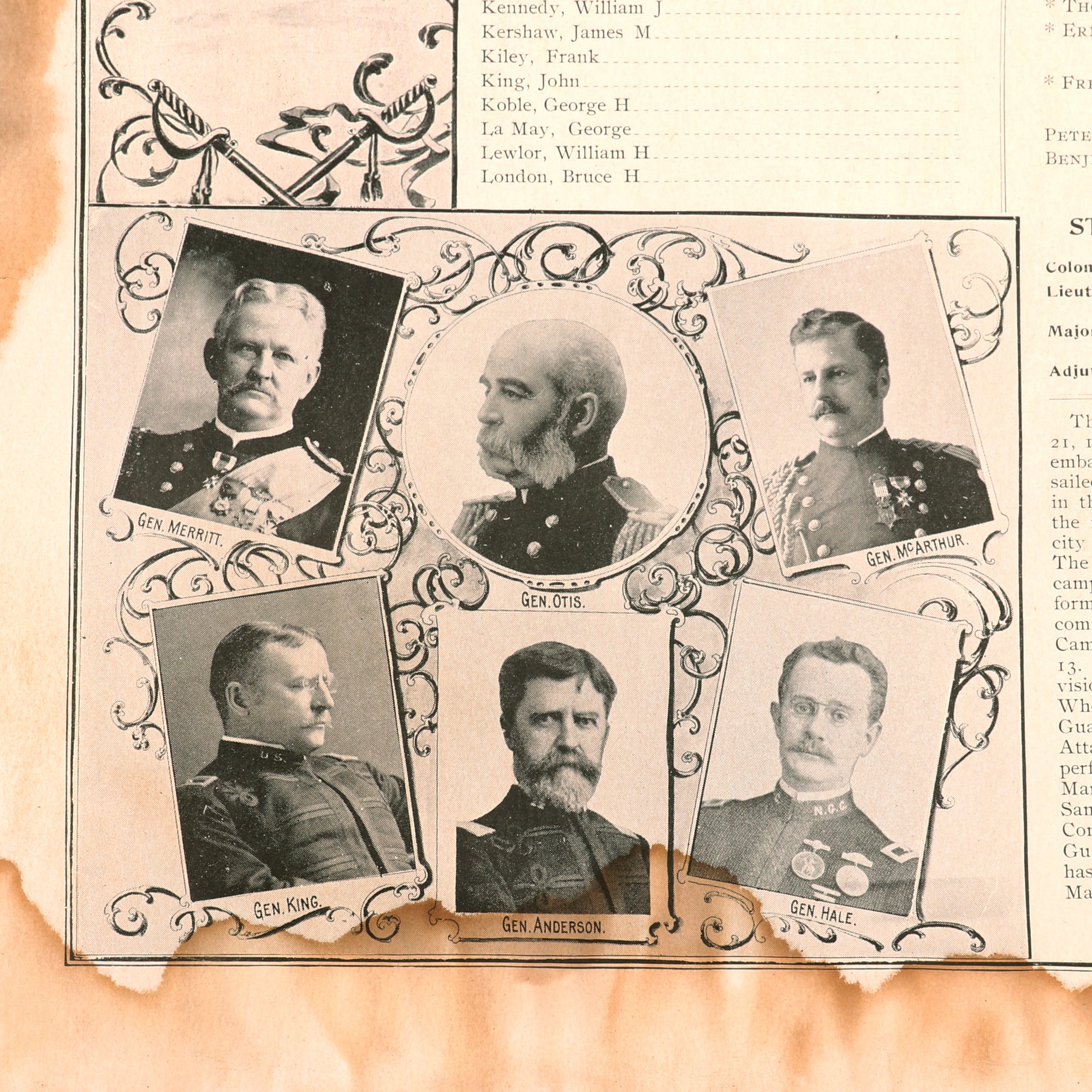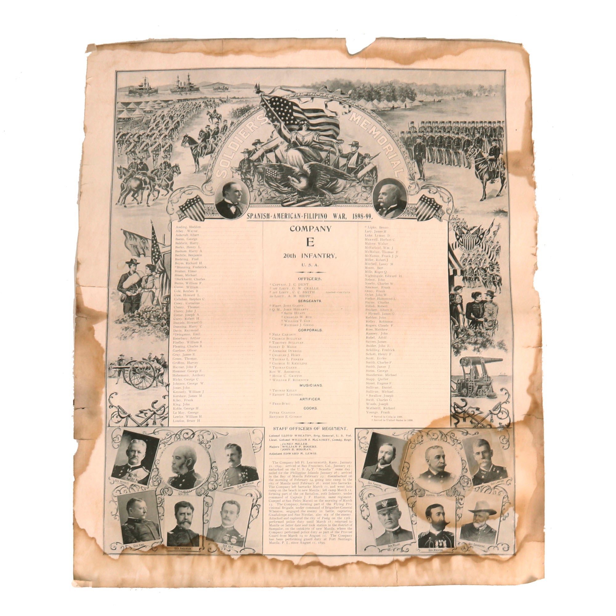 -Rolled roster of Company E, 20th Infantry Regiment, during the Spanish-American-Filipino War, 1898-99. The bottom of the roster lists their exploits very coherantly. Great example covered by an 1899 Newspaper for Columbia, PA. Rough shape.